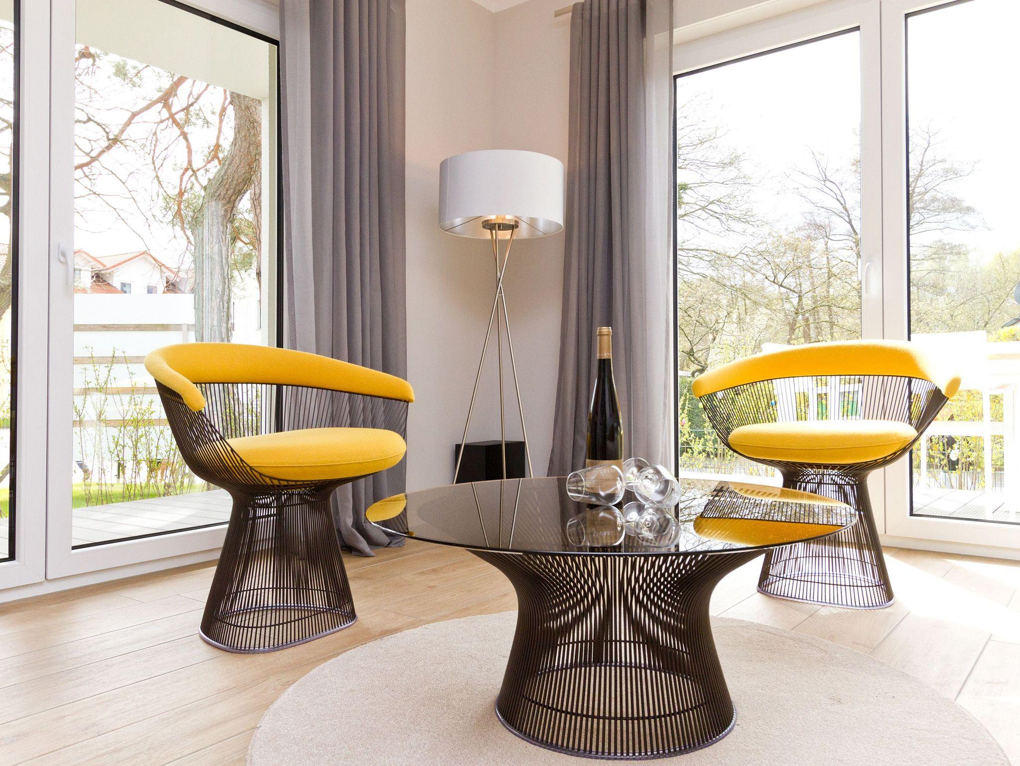 Seine dekorativen und anmutigen Stahlmöbelkonstruktionen gehören zu den Ikonen des Wohndesigns der 1960er Jahre. In dieser stylischen Ferienwohnung Nummer 5 im Erdgeschoss der Dünenresidenz steht nichts Geringeres als eine Warren Plattner-Sitzgruppe mit Armlehnsesseln und Couchtisch im Mittelpunkt des schönen und weiträumigen Wohnbereichs. In den 72 Quadratmetern können bis zu vier Personen nebst einem Kleinkind bis drei Jahre (im Kinderreisebett) mit Stil Urlauben. Und mit jeder Menge Wohlfühlkomfort. So sorgt ein Elektrokamin im Wohnzimmer für eine gemütliche und kuschelige Atmosphäre. Die Wohnung ist geprägt vom Retrolook, der sich auch in der offenen Wohnküche fortsetzt. Ob der große Tulip-Esstisch oder die retroanmutenden Küchengeräte wie Toaster, Kaffeemaschine oder Wasserkocher ? in diesem Feriendomizil tauchen sie ein in eine andere und absolut trendige Zeit. Herausgenommen aus dem Alltag können Sie sich hier eine ganz besondere Auszeit gönnen. Von der sonnigen Südost-Terrasse aus können Sie die Ostsee rauschen hören. Und nicht nur dort. Sanft legt sie sich auch in den beiden Schlafzimmern in die Träume. Lassen Sie sich fallen in die komfortablen Boxspringbetten (1,80 m x 2,00 m). In jedem Schlafzimmer wie auch im Wohnzimmer gibt es Flat-TVs. Ein ganz besonderes Highlight dieses Appartements ist die Panorama-Sauna im Bad. Waschtisch, Toilette und eine geräumige Dusche gehören genauso zur Ausstattung wie Bettwäsche und Handtücher, die für Sie bereit liegen. Die Wohnung hat einen Pkw-Stellplatz in der Tiefgarage (max. Einfahrtshöhe 1,85 m).