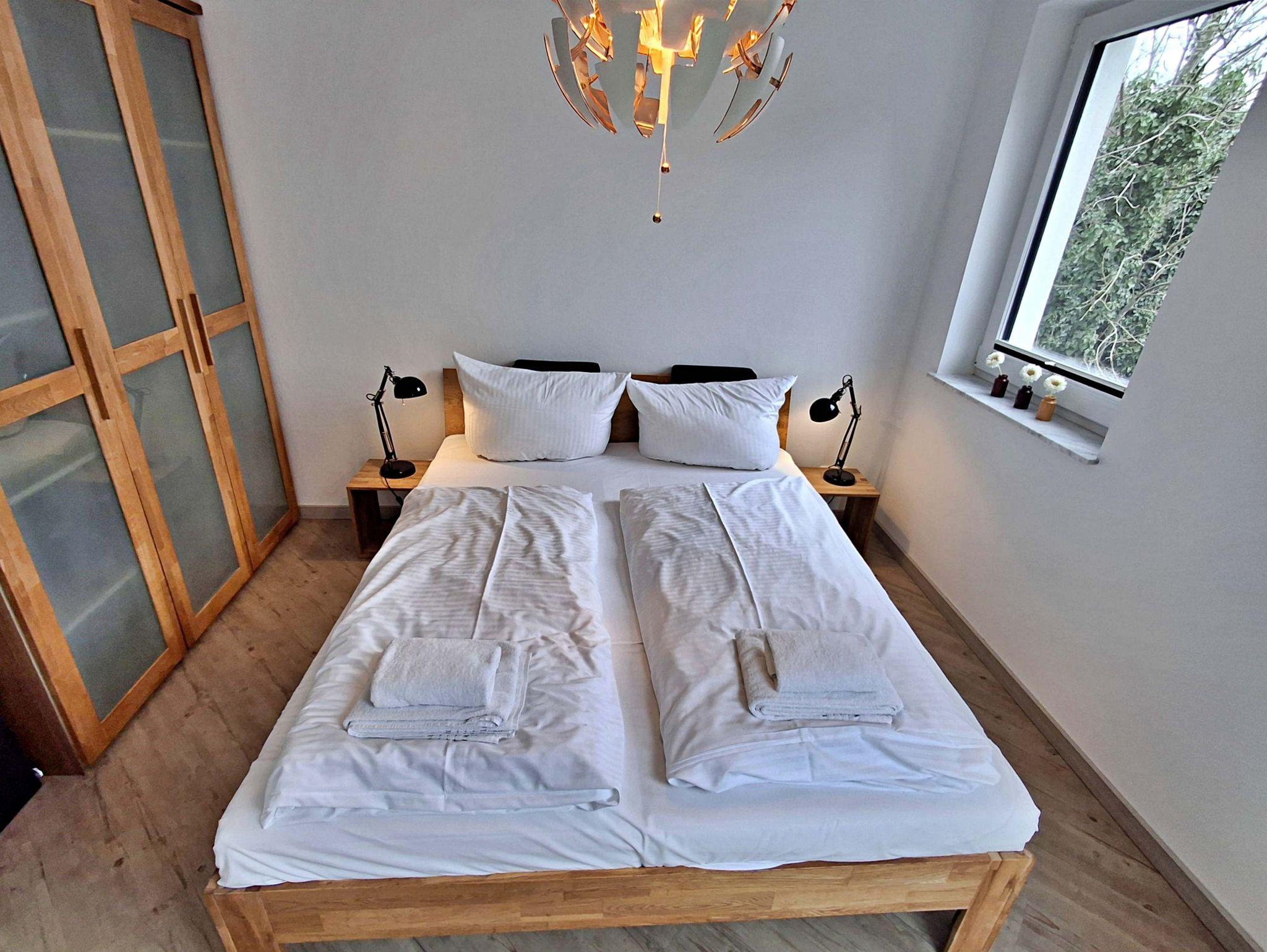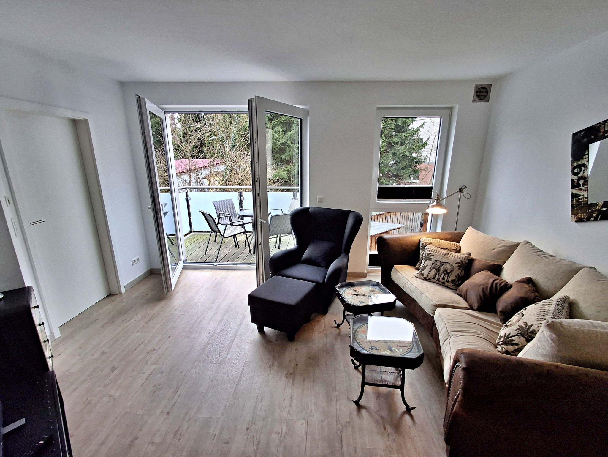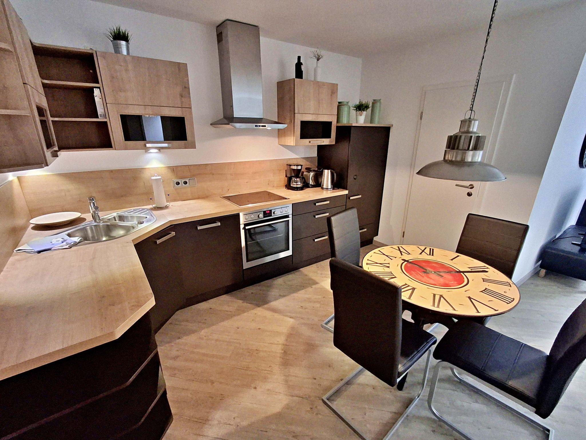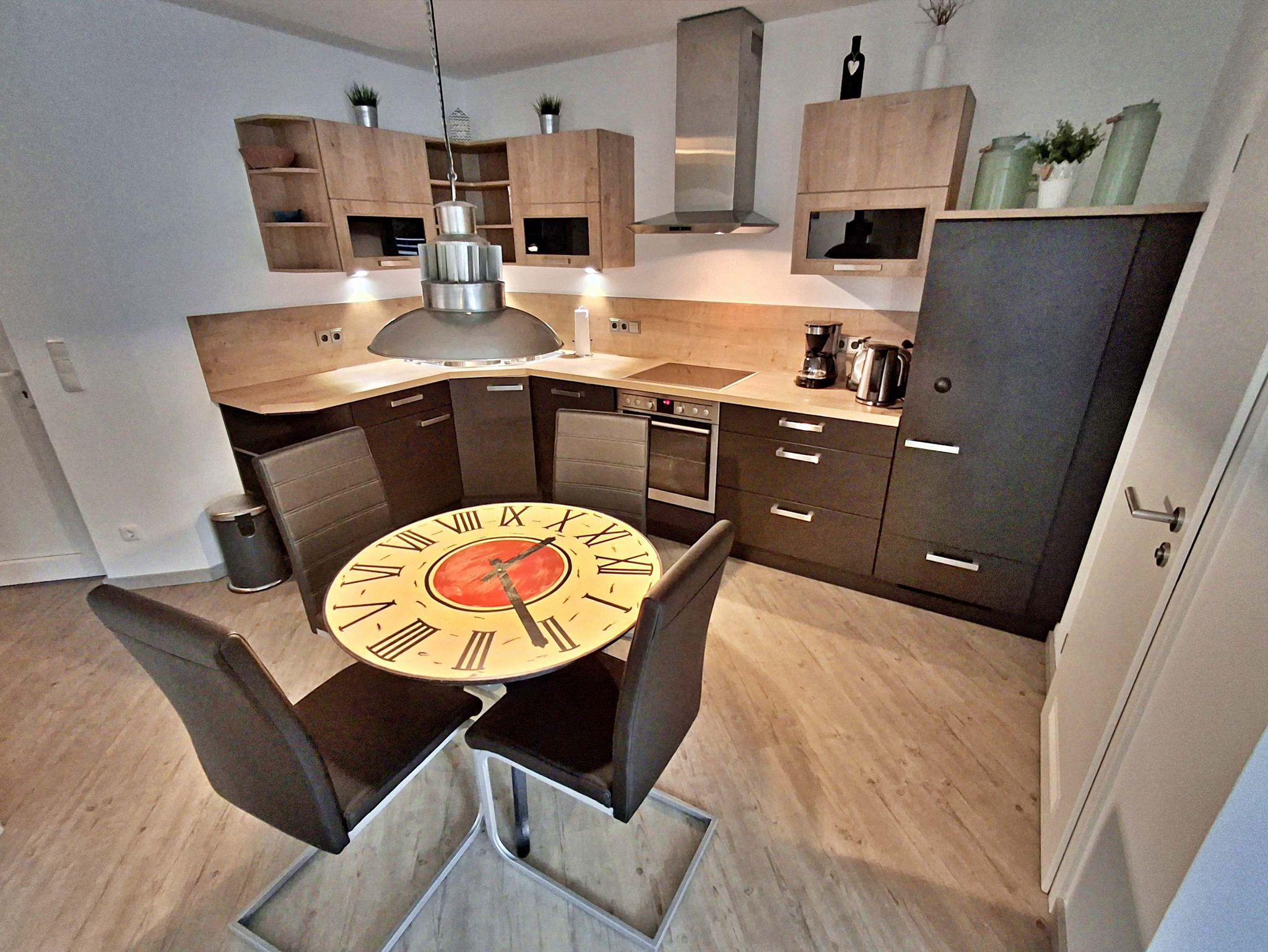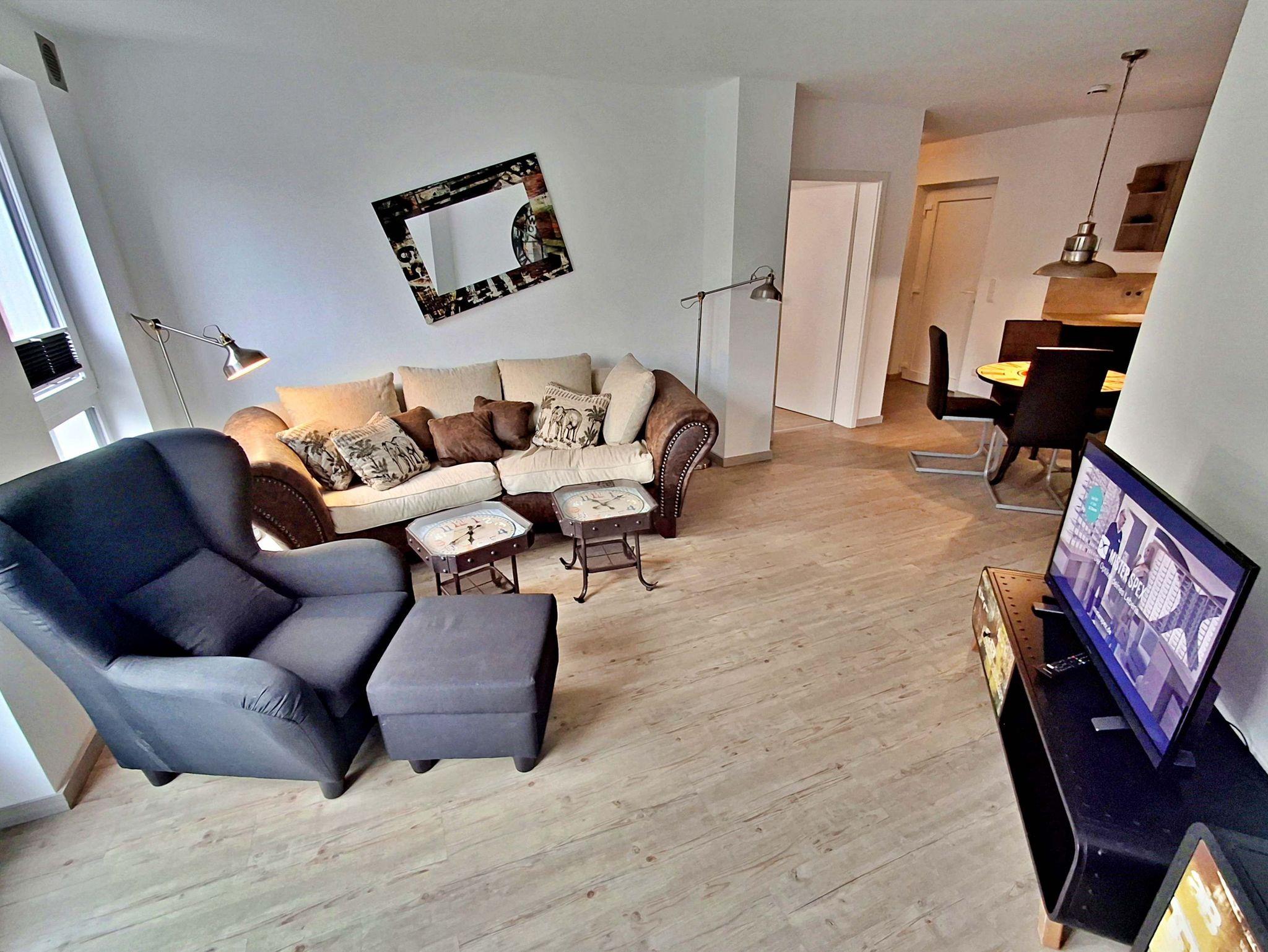 Diese gemütliche Wohnung im 1. Obergeschoss lädt Sie ein sich wohlzufühlen und bietet auf 58 qm genügend Platz für bis zu 4 Personen um einen erholsamen Urlaub zu verbringen. Genießen Sie entspannte Stunden im Wohnzimmer mit einer bequemen Couch und einem Flachbild-TV. Die gut ausgestattete Küchenzeile bietet alles, was Sie für Ihre kulinarischen Abenteuer benötigen - von einem Ceranfeld über einen Backofen bis hin zu einer Kaffeemaschine und einem Geschirrspüler. Der Essplatz für 4 Personen ist perfekt für gesellige Mahlzeiten.