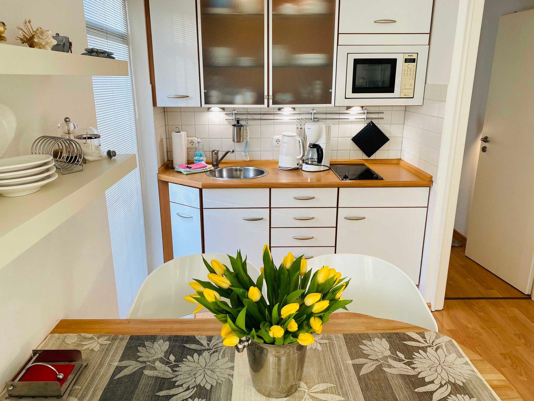 Die Ferienwohnung 13 im Haus Rondell ist eine modern eingerichtet 3 Raum-Wohnung und verfügt über einen kombinierten Wohn-Essraum mit kleiner Küchenzeile.