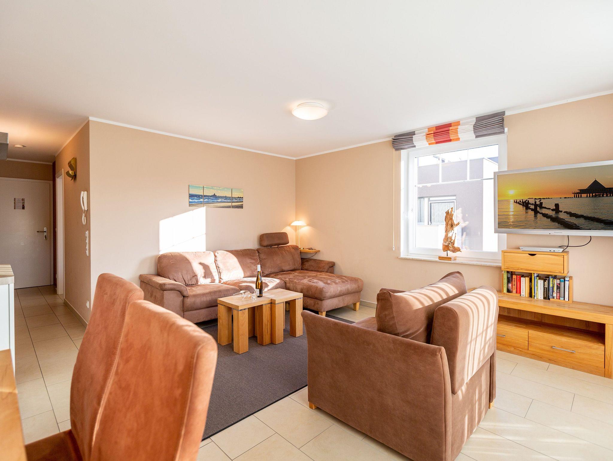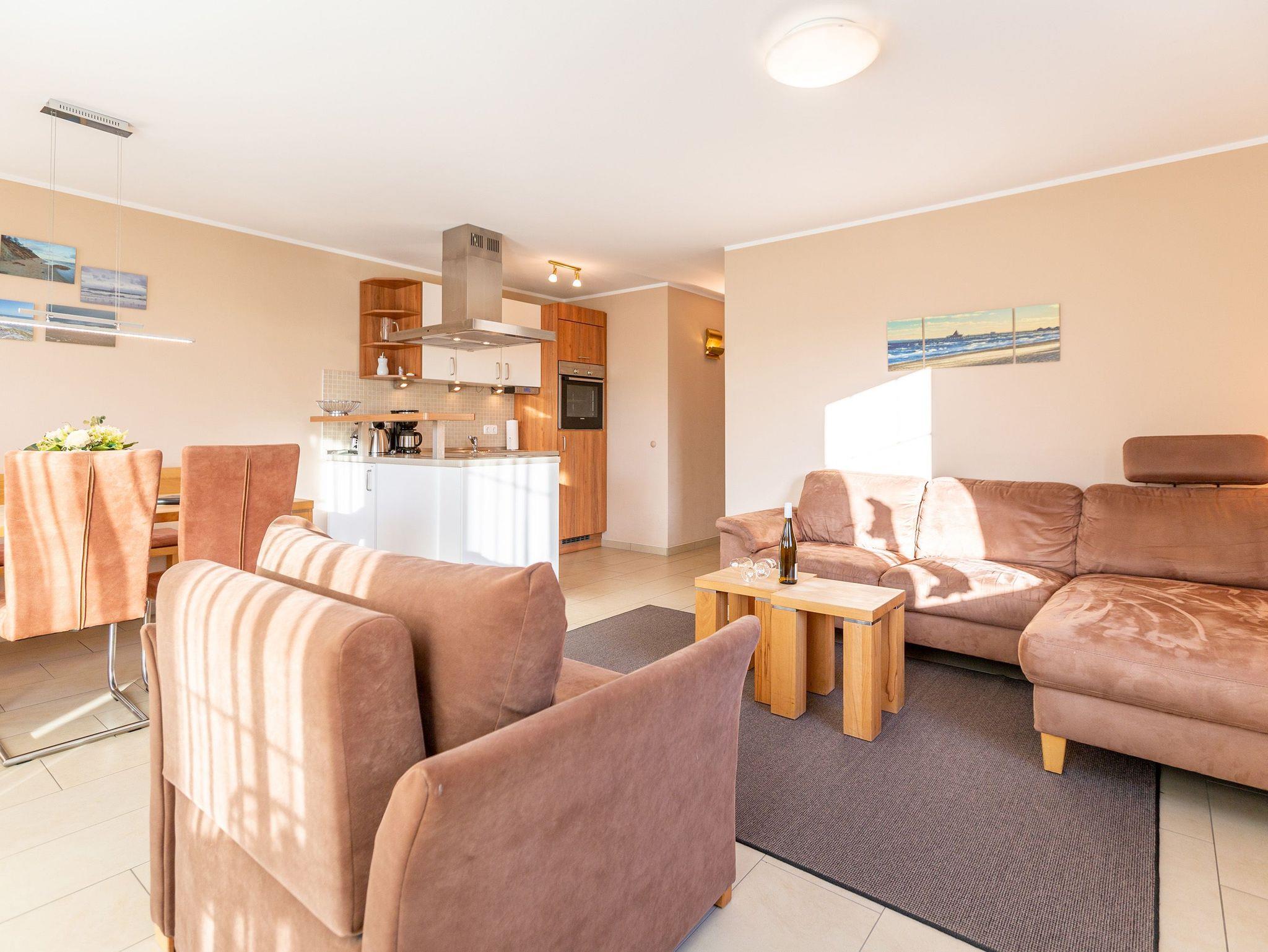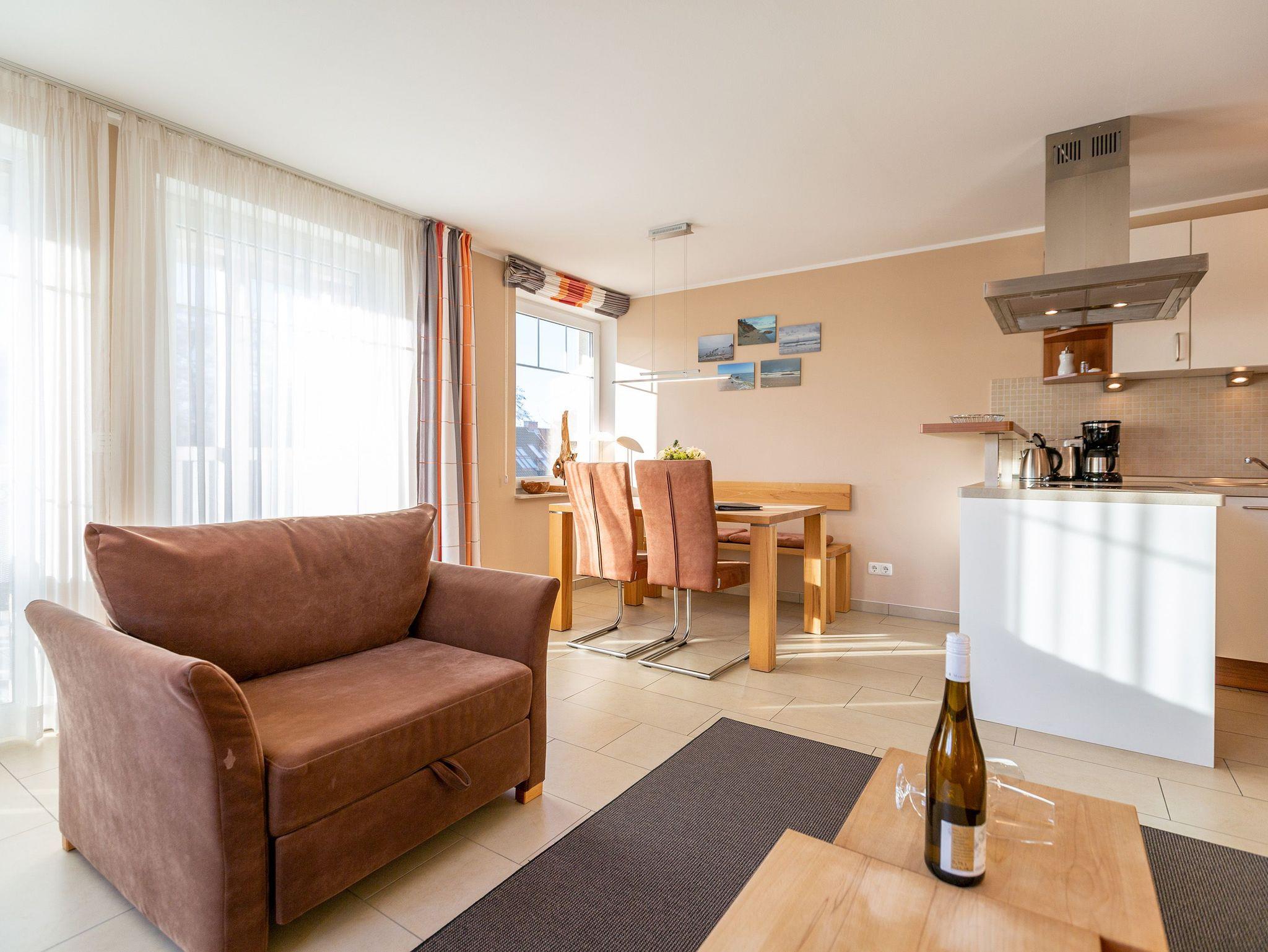 Kuschelig, gemütlich und absolut strandnah ist dieses kleine Urlaubsparadies. Auf seinen 46 Quadratmetern empfängt es Ostseeliebhaber und Auszeithungrige mit viel Komfort. Bis zu 2 Personen und ein Kleinkind bis drei Jahre haben in den zwei Zimmern im 1. Stock des Dünendomizils Platz. Ein Kinderreisebett kann bereit gestellt werden; Matratze und Bettzeug dafür müssen jedoch selbst mitgebracht werden. Der Wohnbereich ist hell und wunderbar sonnenverwöhnt. Eine schöne, große Wohnlandschaft wird zur idealen Relaxing Area mit Blick auf den großen Flat-TV oder hinaus auf den Balkon. Genießen Sie von hier aus mit einem eisgekühlten Getränk den Sonnenuntergang in all seinen romantischen Farben. Das Wohnzimmer geht nahtlos in einen großzügigen Essbereich mit Echtholztisch und offener Küche über. Mit allen Geräten hochwertig ausgestattet lässt sie keine Kochwünsche offen. Ein Kinderhochstuhl kann zur Verfügung gestellt werden (gegen Aufpreis). Müden Strandburgenbauern und Sonnenanbetern zaubert das Schlafzimmer mit seinem bequemen Doppelbett erholsame Träume. Das Bad verfügt über eine Dusche und WC. Für eine rundum entspannte Auszeit sind die Betten bereits bezogen und Handtücher liegen bereit. Das WLAN-Netz ist kostenfrei nutzbar. Zu der Wohnung gehört ein Pkw-Stellplatz in der Tiefgarage. Im Zeitraum von Mai bis September (je nach Witterung) steht Ihnen ein Strandkorb am Strand zur Verfügung.