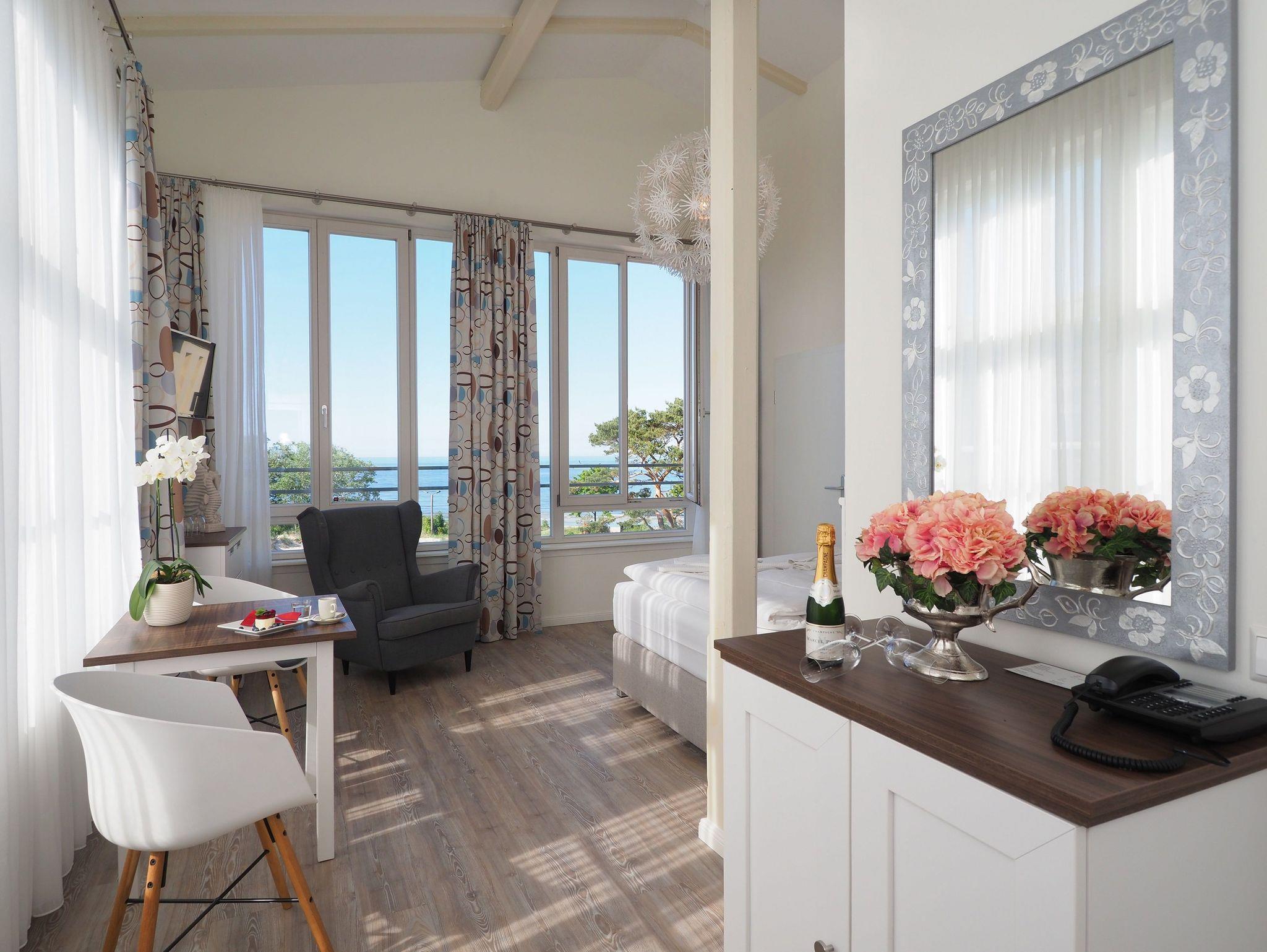 38 schöne und komfortable Doppel- und Einzelzimmer, Suiten und Juniorsuiten mit bequemen Sitzecken zum großen Teil mit herrlichem Blick auf die Ostsee, ein Restaurant mit Frühstücksterrasse in der Morgensonne direkt am Meer, einen Andachtsraum mit Blick auf die Ostsee.