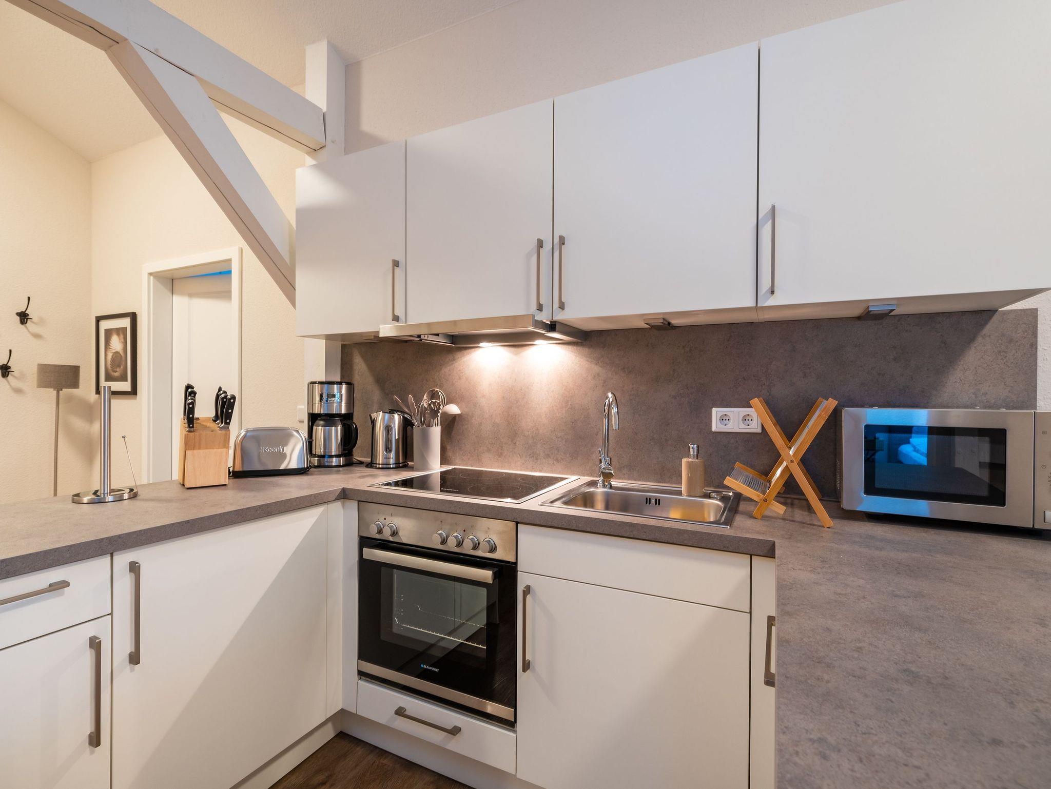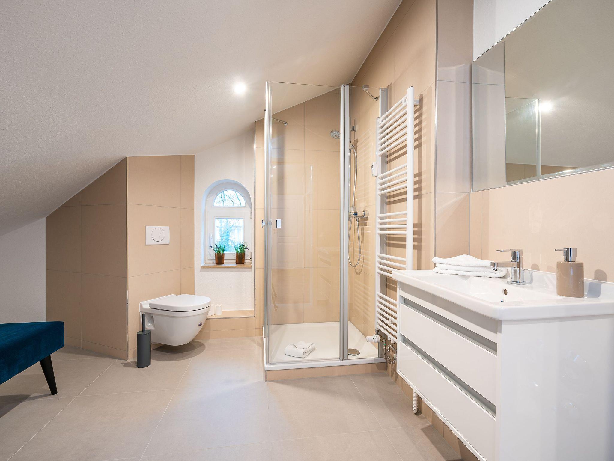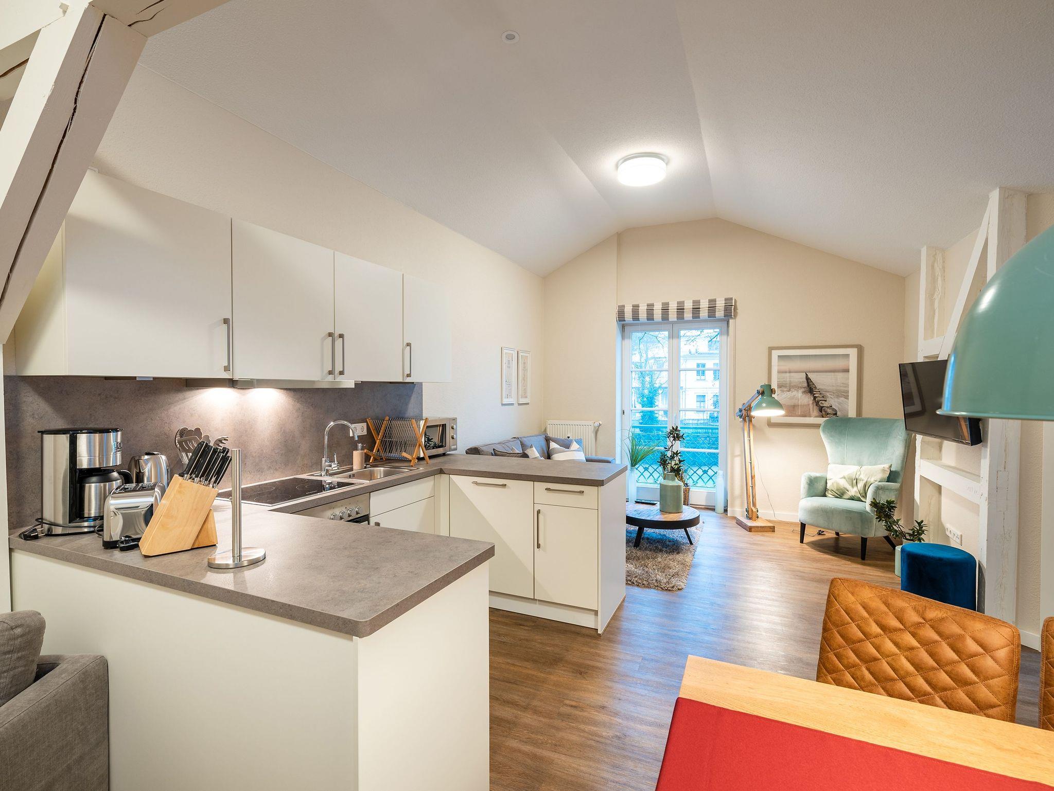 Das 73 qm große Dachgeschoss-Appartement 5 in der denkmalgeschützten Villa Doctores verbindet historischen Charme mit modernem Wohnkomfort. Auf einer sanften Anhöhe unter alten Buchen gelegen, genießen Sie Ruhe und Idylle, während der feinsandige Strand nur etwa drei Gehminuten entfernt liegt. Das Appartement bietet ausreichend Platz für bis zu 4 Personen sowie ein Kleinkind und überzeugt durch eine helle, geschmackvolle Einrichtung. Der Wohnbereich ist mit einer Schlaf-Couch (als Aufbettung für eine 5. Person möglich) ausgestattet, zwei Schlafzimmer verfügen über komfortable Boxspringbetten (1,60 m und 1,80 m) und jeweils ein modernes Duschbad. Die Küchenzeile ist vollständig ausgestattet, der Echtholzesstisch lädt zu gemeinsamen Mahlzeiten ein. Vom kleinen Balkon aus können Sie entspannt die Umgebung genießen. Zu den Extras gehören WLAN und ein reservierter Tiefgaragenstellplatz. Appartement 5 in der Villa Doctores bietet die ideale Kombination aus stilvollem Ambiente, Nähe zum Strand und Zugang zur lebendigen Heringsdorfer Promenade ? ein perfekter Ort für einen entspannten Urlaub.