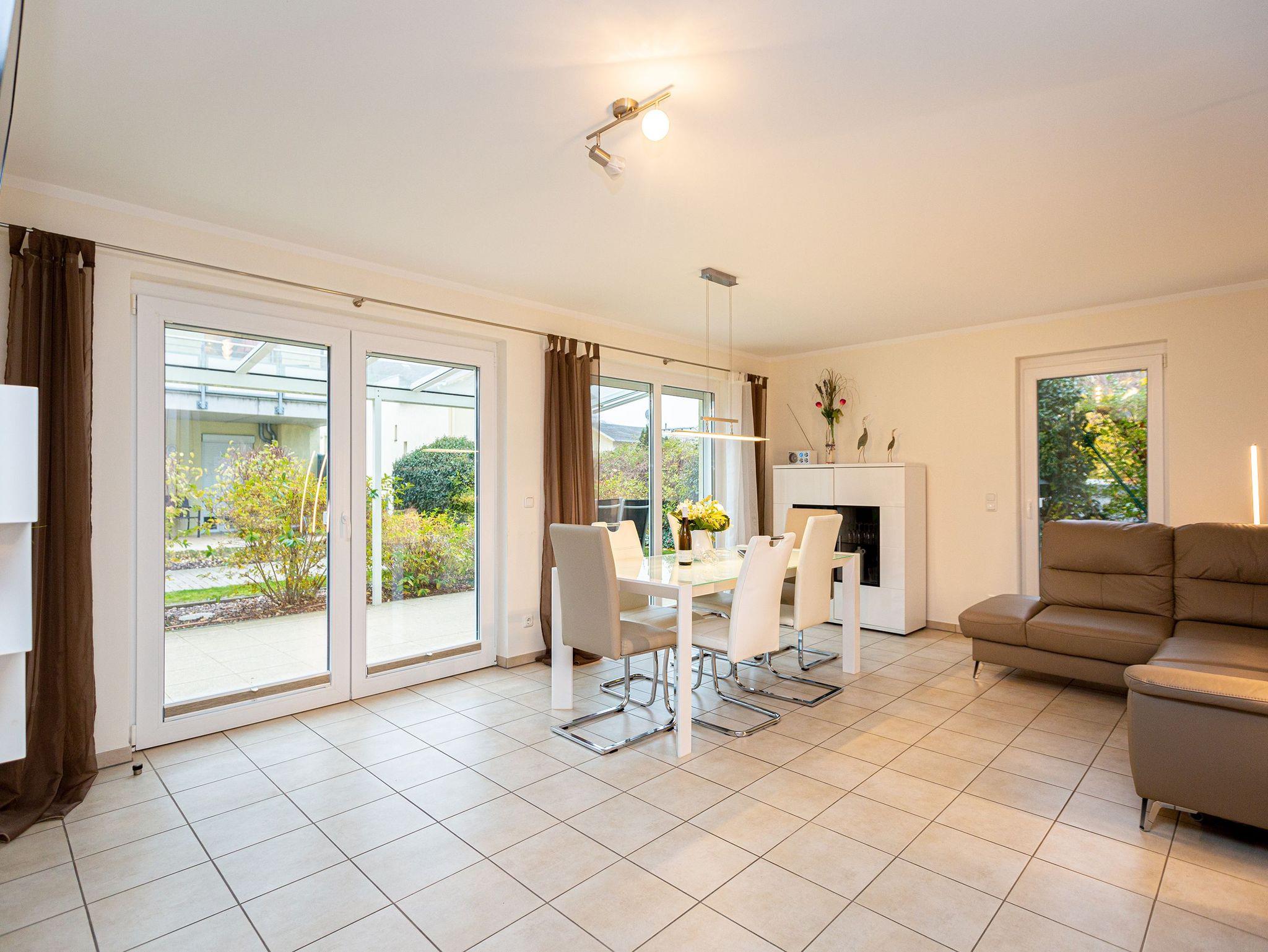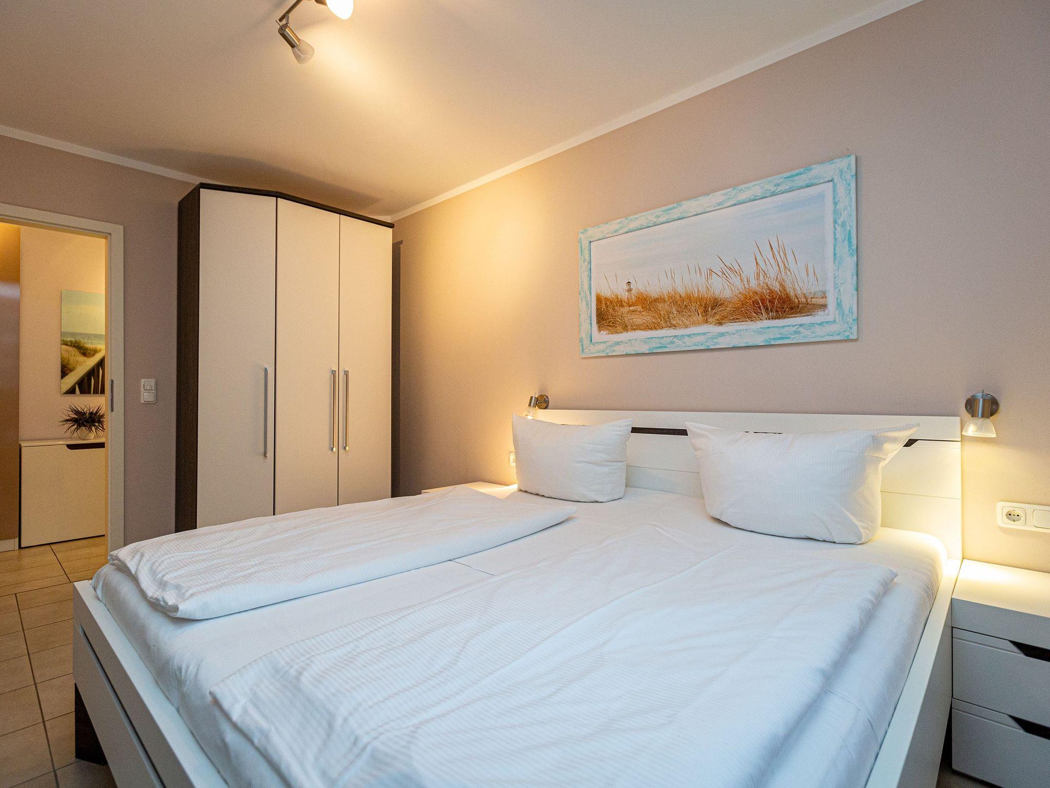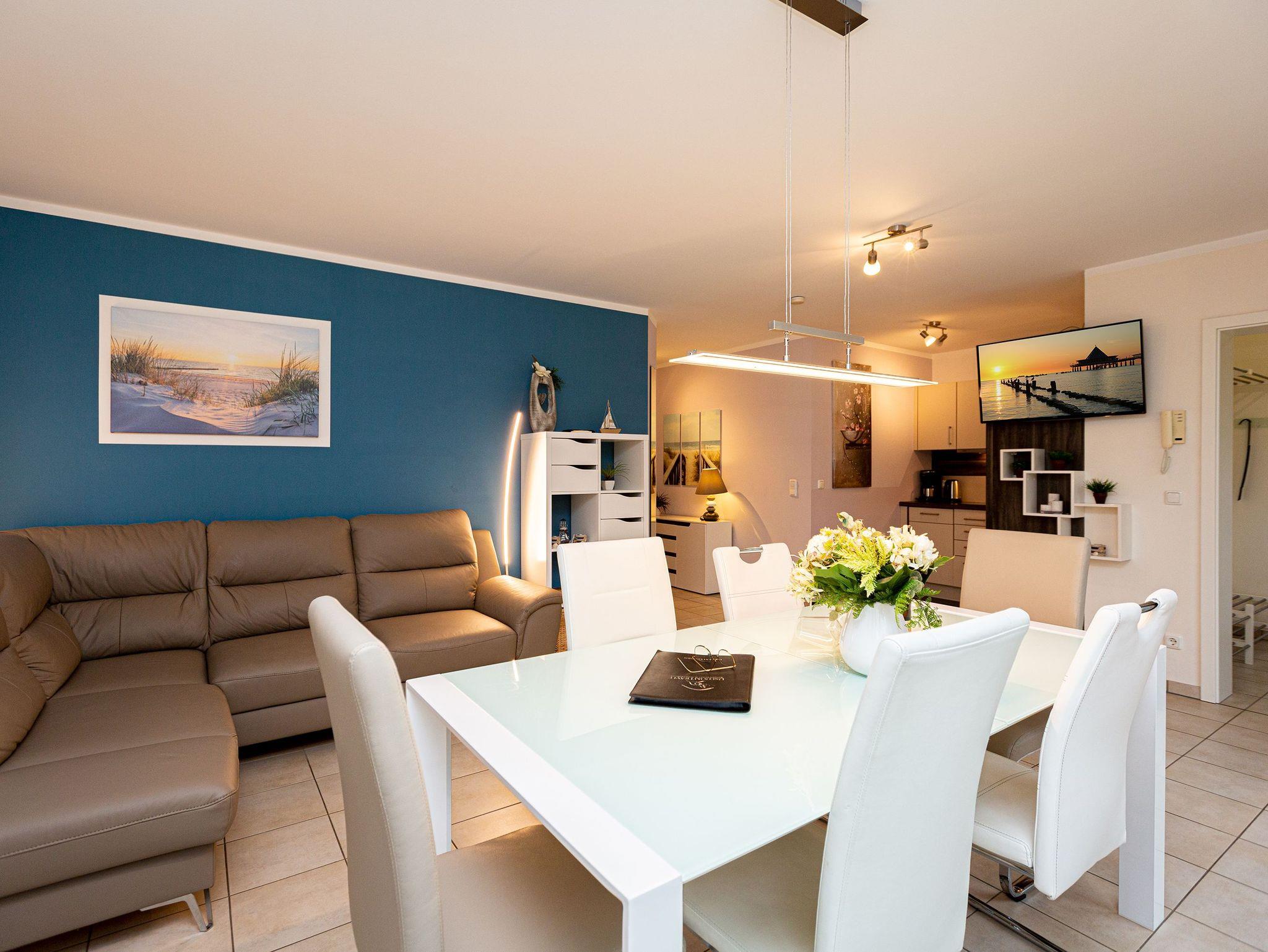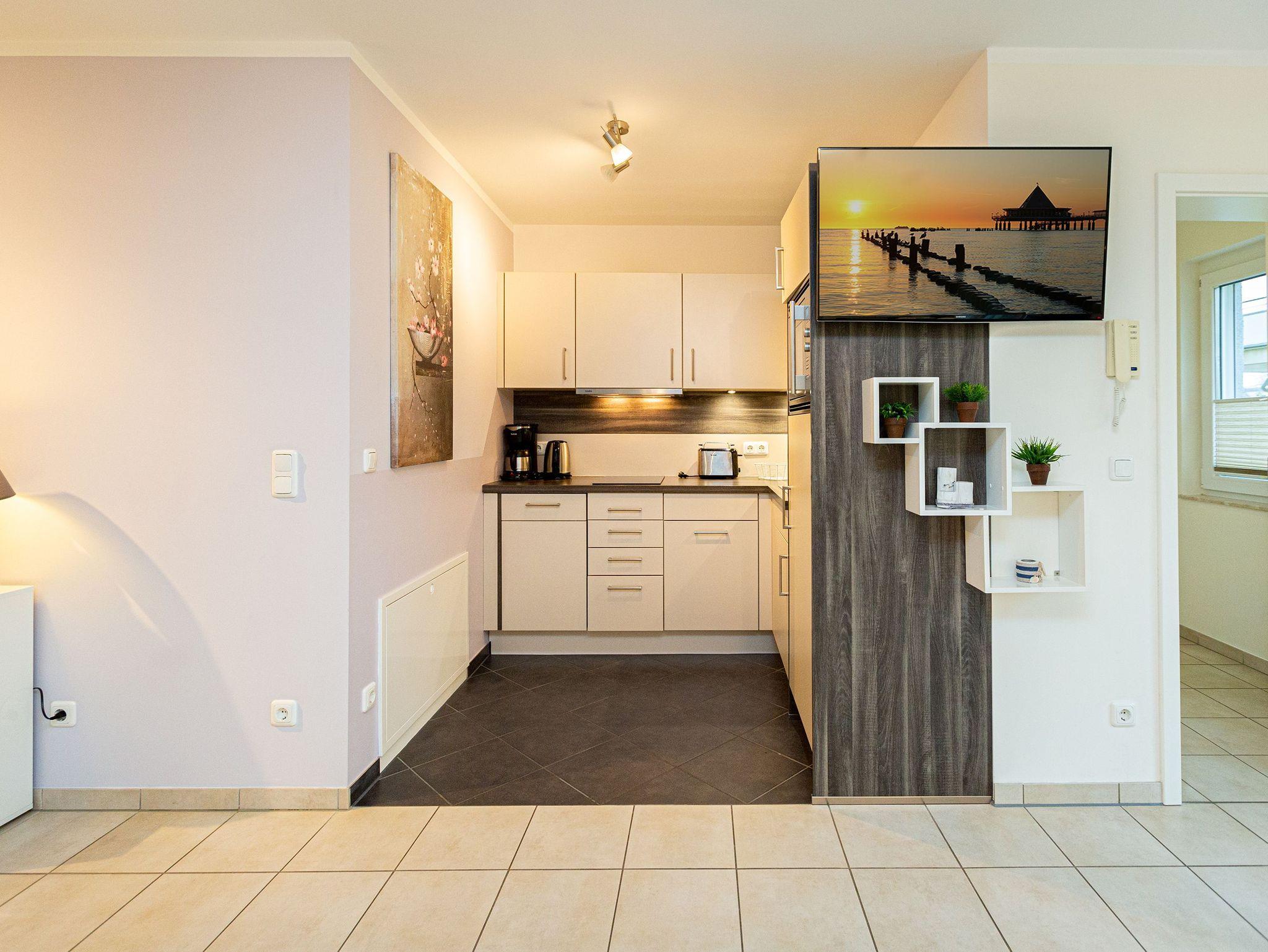 Modern und mit allem erdenklichen Komfort ausgestattet, empfängt das Appartement 7 Auszeitler, die sich im Herzen von Heringsdorf einen erholsamen Urlaub gönnen wollen. Auf 70 Quadratmetern haben Sie viel Platz zum Aus- und Entspannen. Bis zu vier Personen und ein Kleinkind kann das Drei-Zimmer-Appartement im Erdgeschoss beherbergen. Machen Sie es sich gemütlich im großen Wohn-Esszimmer. Ob am Esstisch oder auf den Gartenmöbeln auf der Terrasse mit Blick ins Grüne ? das Essen schmeckt im Urlaub ohnehin immer viel besser als daheim. Brennt die Sonne zu arg, schafft eine große Markise kühlend Abhilfe. Die Sonnenliegen laden zum Mittagsschläfchen ein. Oder schalten Sie auf dem Sofa im Wohnzimmer bei Highend-Unterhaltung via Flat-TV entspannt ab. Die offene Küchenzeile ist mit einer Einbau-Mikrowelle mit Grillfunktion und einem 2-Platten-Ceranfeld ausgestattet. Gemeinsame Kochaktionen werden Dank der hochwertigen Geräte zum Kinderspiel. Kleine Erholungsoasen sind die beiden Schlafzimmer. Die Doppelbetten sind bei Anreise bereits bezogen. Jedes der Zimmer verfügt ebenfalls über einen eigenen Flat-TV und einen geräumigen Schrank. Das moderne Badezimmer hat Dusche, Waschtisch und WC. Außerdem gibt es ein separates Gäste-WC. Handtücher liegen für Sie bereit. Auf Wunsch kann für die kleinen Gäste ein Kinderreisebett (ohne zusätzliche Matratze [&] Bettzeug) und ein Kinderhochstuhl (gegen einen Aufpreis) zur Verfügung gestellt werden.