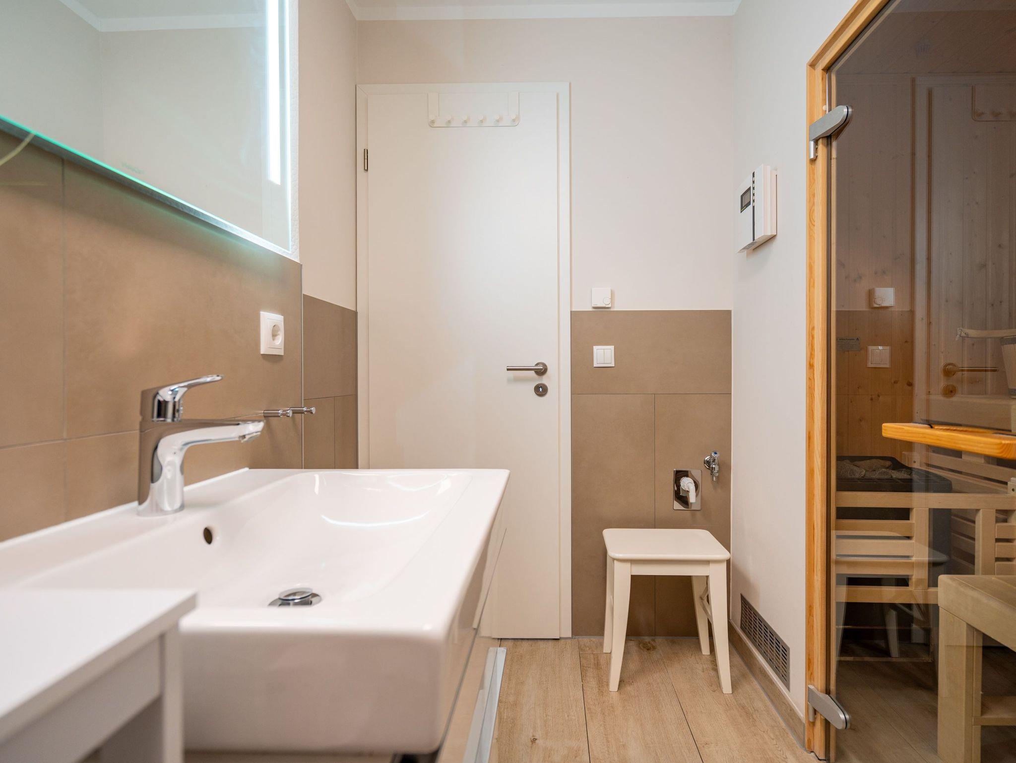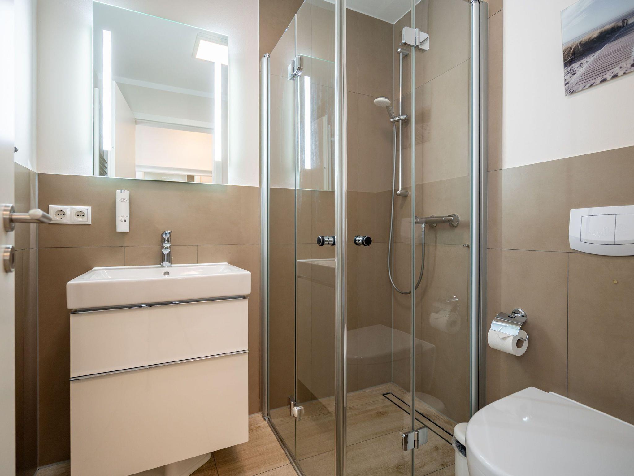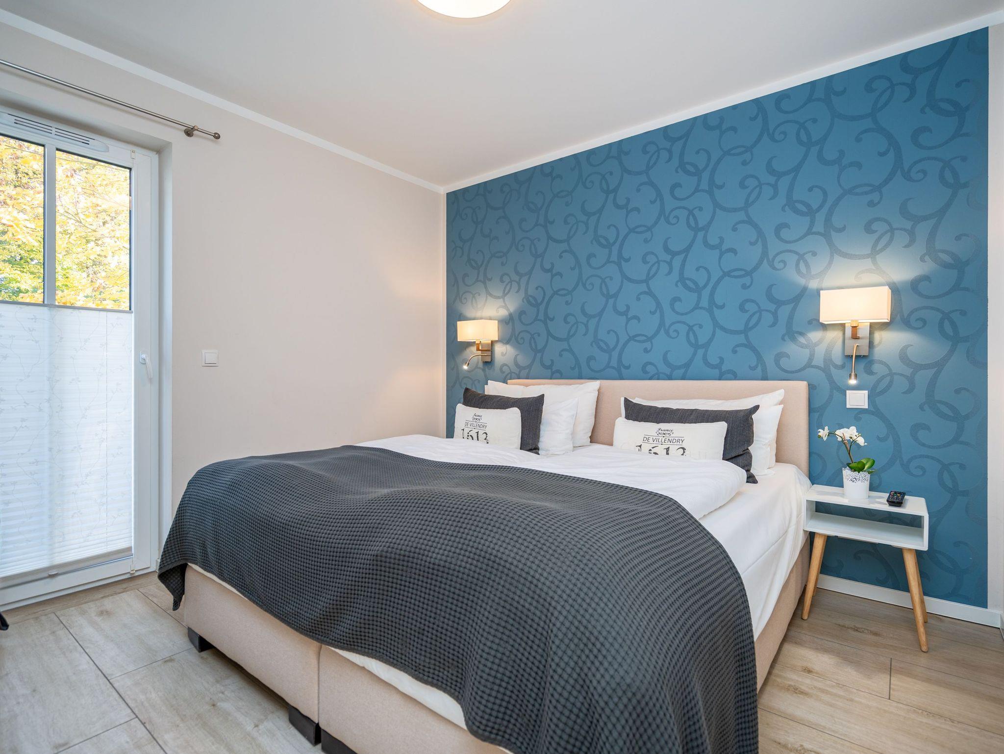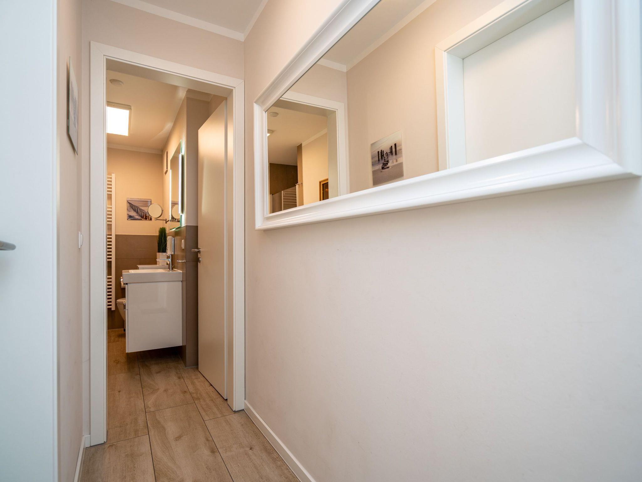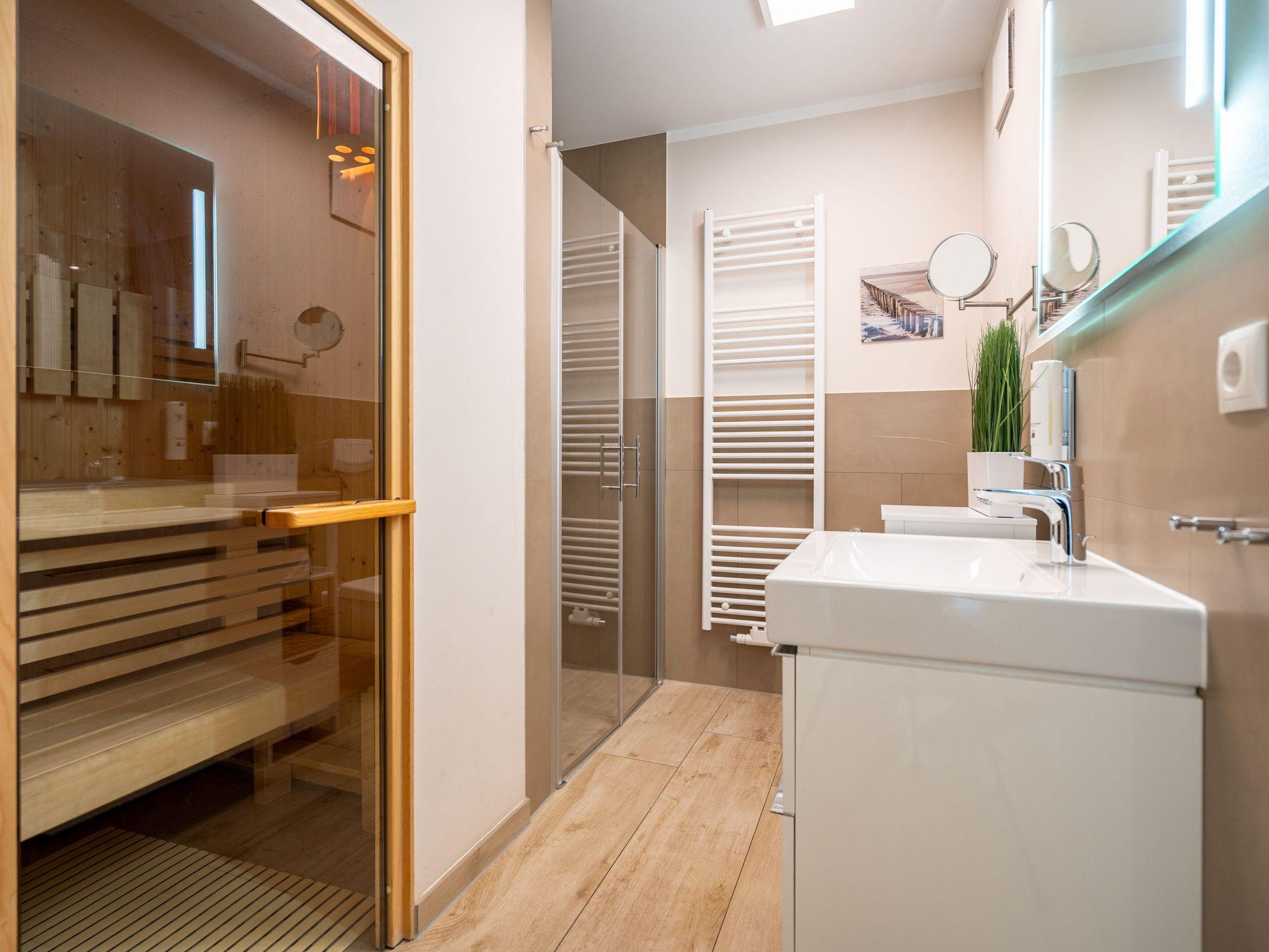 Auf 73 Quadratmetern bietet das Drei-Zimmer-Appartement Nummer 3 im 1. Obergeschoss alles, was man sich für einen entspannten Urlaub an der Ostsee nur wünschen kann. Viel Platz und eine Einrichtung zum Pudelwohlfühlen ? ein kleines Paradies für bis zu vier Personen wartet auf Sie. Das helle und geräumige Wohn-Esszimmer ist mit viel Geschmack und Zeitgeist eingerichtet. Hier spürt man die Liebe zum Interieur und zum Detail. Nordisches Landhaus-Design durchzieht jeden Raum. Naturmaterialien, ausgesuchte Accessoires und viel Komfort bestimmen die Ausstattung. Ob Sofa, Ohrensessel oder uriger Korbstuhl ? lassen Sie sich fallen und entspannen Sie einfach mal drauf los. Hier wird es Ihnen sicher leicht fallen. Vom Wohnzimmer geht?s auf einen schönen Süd-Balkon. Sonnenhungrige können hier neue Energie tanken. Ob Großer Flat-TV, hochwertige Musikanlage oder Kamin ? Unterhaltung wird hier zur puren Entspannung. Das offene Wohn-Esszimmer bietet mit seinem großen, runden Tisch und den bequemen Stühlen einen schönen Essplatz für genüssliche und gesellige Stunden. Die offene Küche ist mit allem ausgestattet, das Sie zum Kochen, Braten oder Backen brauchen. Hochwertige Markengeräte sind Ihnen fleißige Küchenhelfer. Vom Backofen, über den Geschirrspüler bis hin zur Kaffeemaschine ist alles da. Zwei Schlafzimmer schenken echtes Schlafvergnügen mit ihren komfortablen Boxspringdoppelbetten (1,80 m x 2,00 m). Ein zweiter Balkon in Ostausrichtung ist von beiden Zimmern aus begehbar. Genießen Sie hier schon morgens die aufgehende Sonne. In jedem Schlafzimmer gibt es einen Flat-TV. Viel Ablagefläche bieten die geräumigen Schränke. Ebenfalls zweifach vorhanden, ist das Badezimmer. Dusche, Waschtisch und WC gehören zur Ausstattung in beiden Räumen. Im Masterbad erwartet Sie darüber hinaus eine Finnische Sauna, in der Sie nach Herzenslust bei kuschelig warmen Temperaturen entspannen können. Handtücher liegen bei Anreise bereit und die Betten sind frisch bezogen. In der Tiefgarage ist für Sie ein Stellplatz reserviert. In dieser Wohnung sind Haustiere nicht erlaubt - jedoch ist diese nicht garantiert allergikerfreundlich.