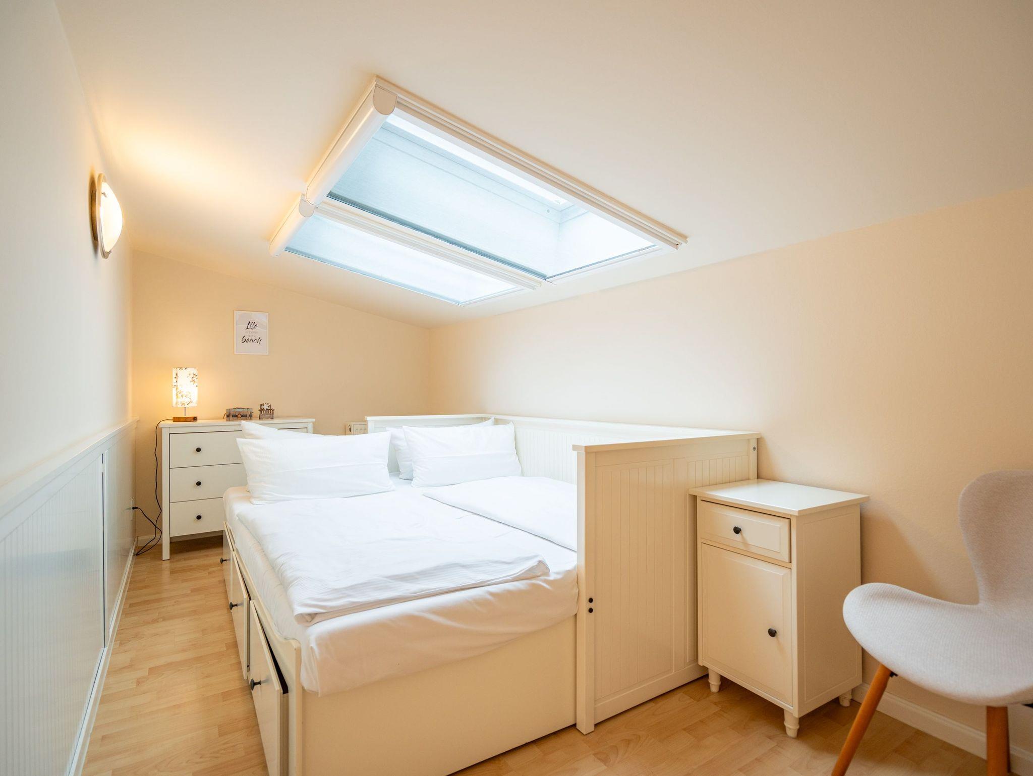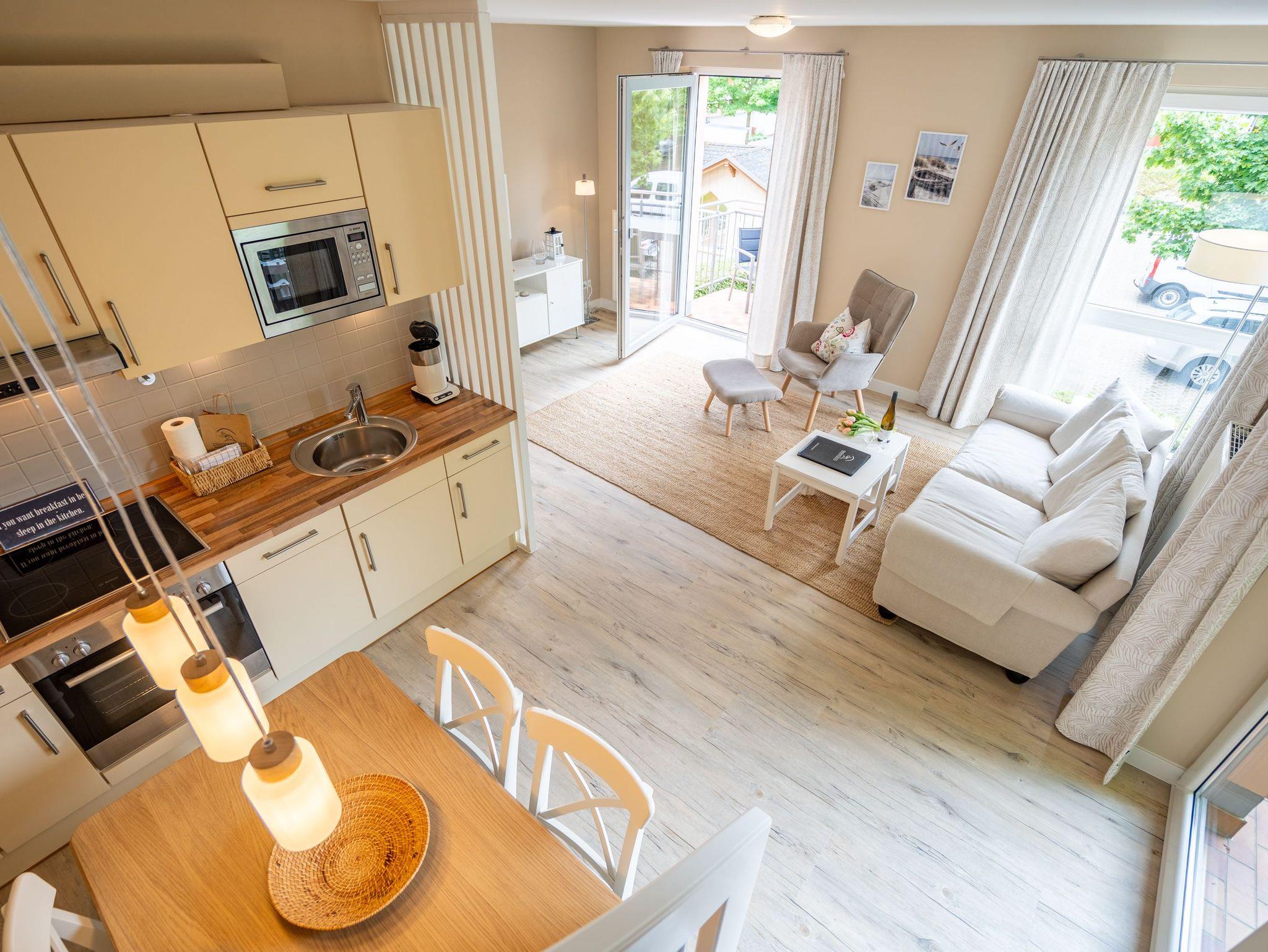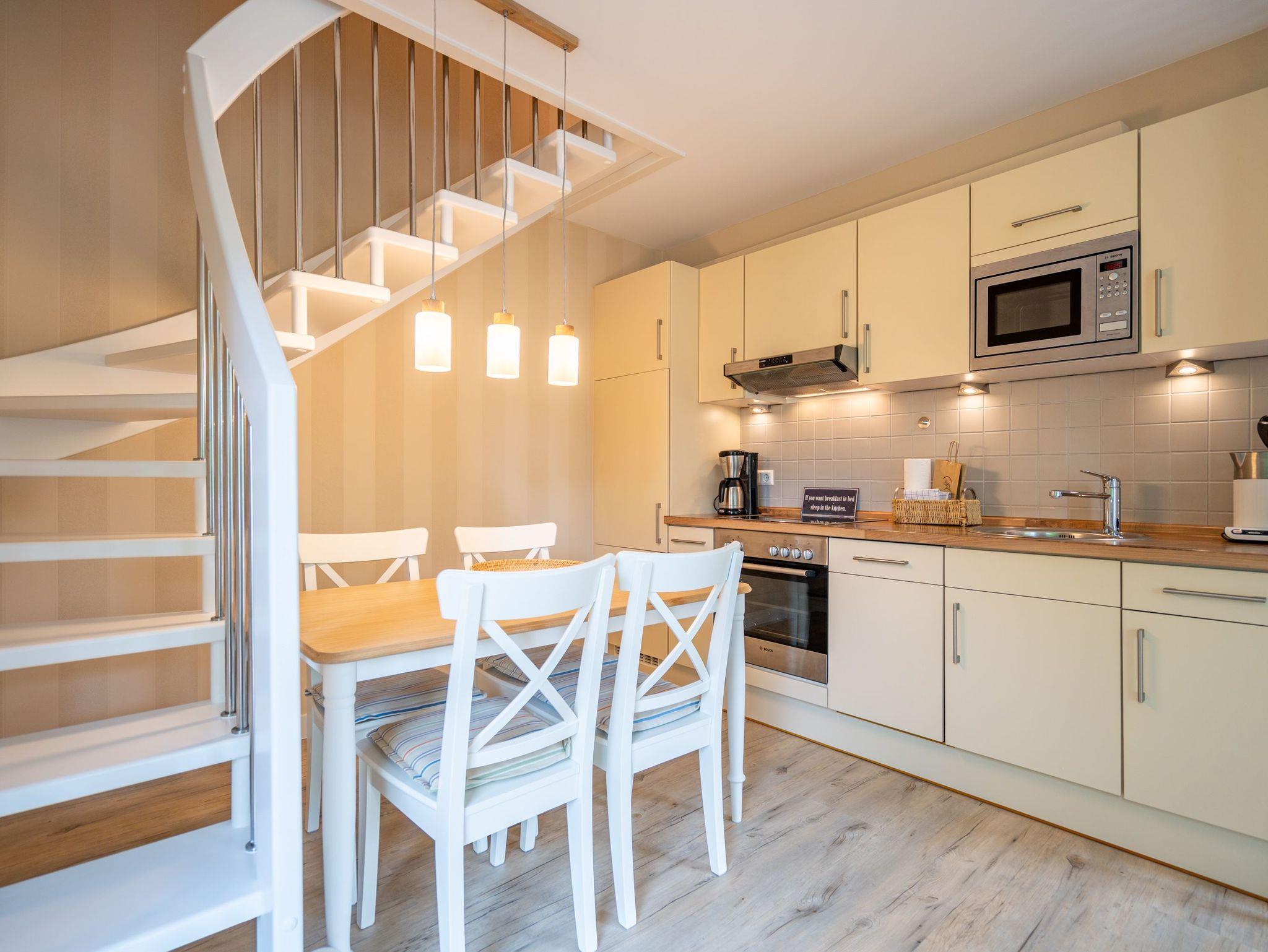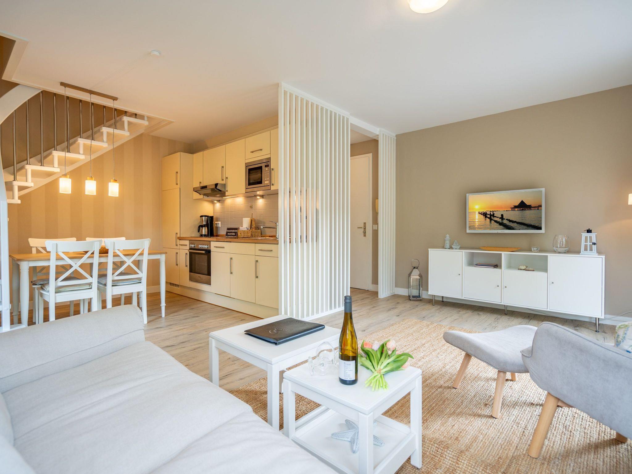 Die helle und freundlich eingerichtete 3-Raum-Ferienwohnung erstreckt sich über 2 Etagen und bietet Ihnen Platz zum Wohlfühlen und Entspannen. In der unteren Etage lässt der lichtdurchflutete Wohnbereich mit offener, komplett ausgestatteter Küchenzeile, 2 großen Südbalkonen und dem Gäste-WC keine Wünsche offen. Eine moderne, hochwertige Ausstattung und liebevolle Details versprechen einen traumhaften Urlaub. Das Schlafzimmer mit Doppelbett, ein Kinderzimmer mit einem ausziehbaren Tages/Doppelbett, sowie das Bad mit Dusche erwarten Sie im Obergeschoss. Auf Wunsch stellen wir für unsere kleinen Gäste ein Kinderreisebett (ohne zusätzliche Matratze [&] Bettzeug) und einen Kinderhochstuhl ( gegen einen Aufpreis) zur Verfügung. Für Ihren Komfort sind die Betten bei der Anreise bezogen und Handtücher liegen bereit.