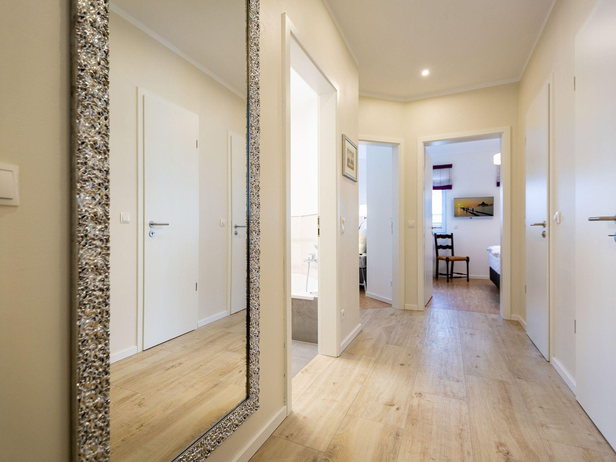 Das Appartement Nummer 8 in der 3. Etage setzt auf seinen 79 Quadratmetern gleich mehrere Akzente: Farbakzente, Lichtakzente und Designakzente. Alles zusammen sorgt dafür, dass sich die bis zu vier Personen in dem Drei-Zimmer-Urlaubsdomizil rundum wohlfühlen. Hier ist nichts 0815. Schon gar nicht die Farben. Dezent, aber dennoch präsent verleihen sie der Wohnung eine behagliche Atmosphäre: Von der lindgrünen Leder-Landschaft zum Faulenzen und Entspannen bis zum Indigo der Stühle rund um den Esstisch. Große, helle Räume sorgen für Leichtigkeit und Komfort. Treten Sie vom Wohnzimmer aus auf den sonnigen Süd-Ost-Balkon (6 Quadratmeter) und atmen Sie die gesunde Ostseeluft tief in sich ein. Ebenfalls an das geräumige Wohnzimmer angeschlossen, ist die offene Küche mit einer voll ausgestattete Küchenzeile und einem schönen Essplatz. Alle Geräte sind Markengeräte. Ein komplettes Geschirr-Service finden Sie in den Schränken. Auch die beiden Schlafzimmer empfangen den Gast mit modernem Design. Jedes verfügt über ein Boxspringdoppelbett (eines 1,80 m x 2,00 m, das zweite 1,60 m x 2,00 m) sowie einen extra angefertigten Kleiderschrank. Alle drei Zimmer des Appartements sind mit einem Flat-TV ausgestattet. In den beiden Badezimmern sind je eine Dusche und eine Toilette vorhanden. Darüber hinaus besitzt das Masterbad eine Badewanne und ein Bidet. Handtücher liegen selbstverständlich bereit und auch die Betten sind bereits bezogen. Zu dem Appartement gehört der Außenstellplatz Nummer 8 im Hof. In einem separaten und abschließbaren Kellerraum befindet sich eine Ladestation für E-Bikes. Der WLAN-Zugang ist kostenfrei. Sie brauchen also nur ankommen, mit dem Fahrstuhl in die 3. Etage fahren und schon sind Sie mitten im Urlaub.