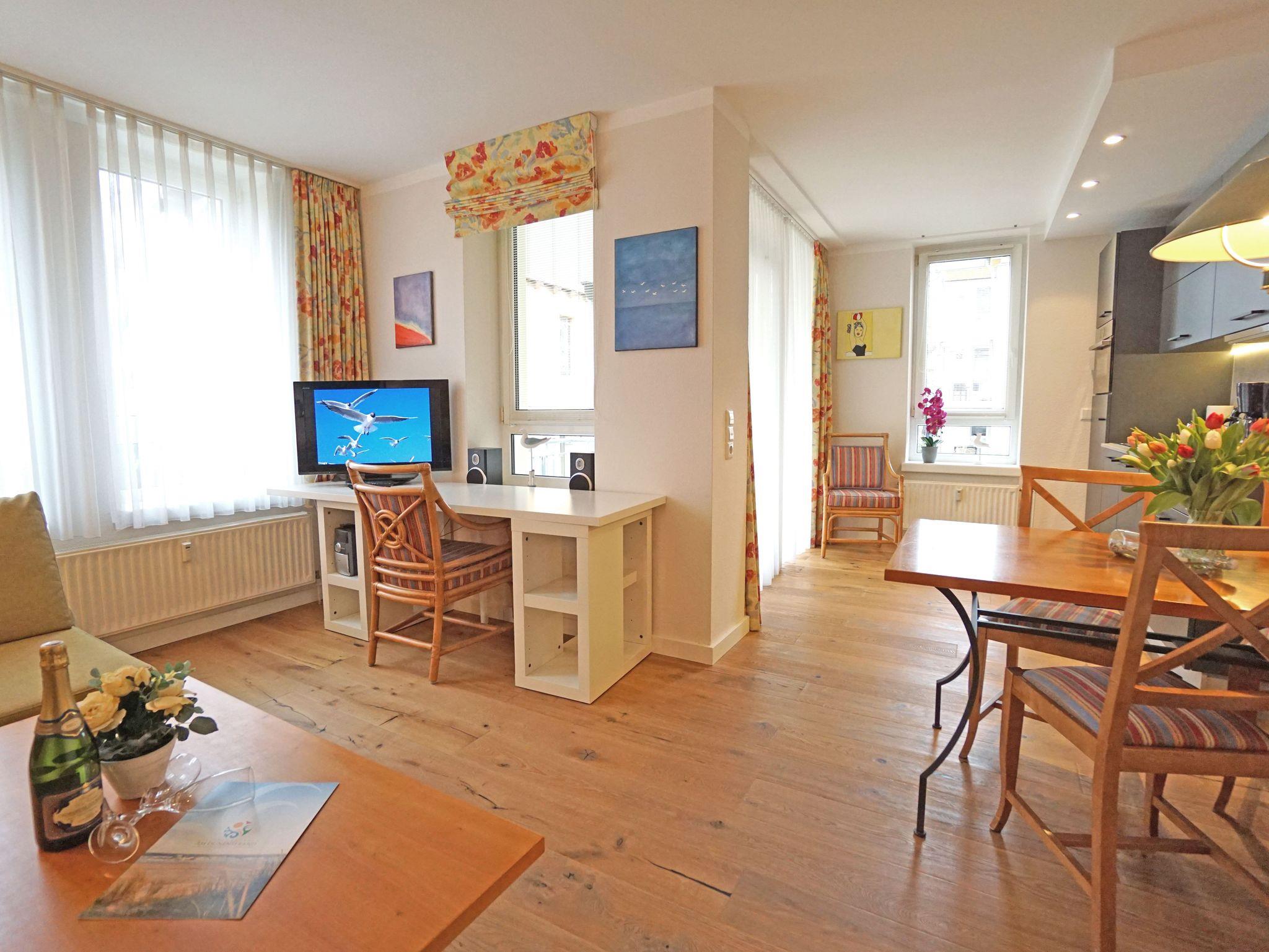 Freundliche,sehr helle Zweizimmer Ferienwohnung (45qm) für 2 - 4 Personen mit Balkon, direkt an der Promenade in gepflegtem Park mit altem Baumbestand gelegen. Die Wohnung hat neben dem Wohn- und Essbereich eine offene Küche mit Mikrowelle, Herd und Backofen. Das Schlafzimmer verfügt über ein Doppelbett, die Doppelschlafcouch im Wohnbereich ist für die 3. und 4. Person.