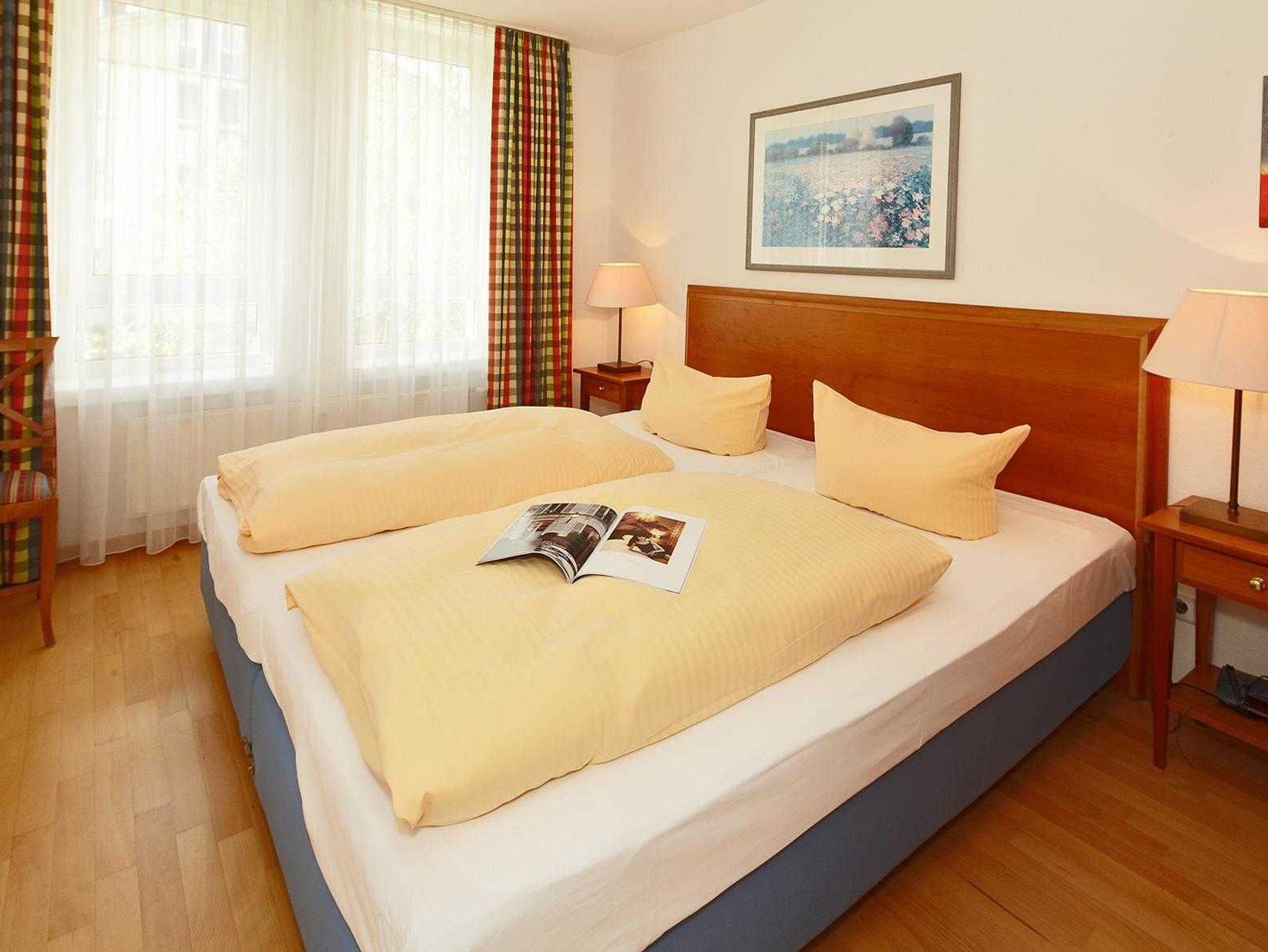 Freundliche,sehr helle Zweizimmer Ferienwohnung (45qm) für 2 - 4 Personen mit Balkon, direkt an der Promenade in gepflegtem Park mit altem Baumbestand gelegen. Die Wohnung hat neben dem Wohn- und Essbereich eine offene Küche mit Mikrowelle, Geschirrspüler, Herd und Backofen. Das Schlafzimmer verfügt über ein Doppelbett, die Doppelschlafcouch im Wohnbereich ist für die 3. und 4. Person.