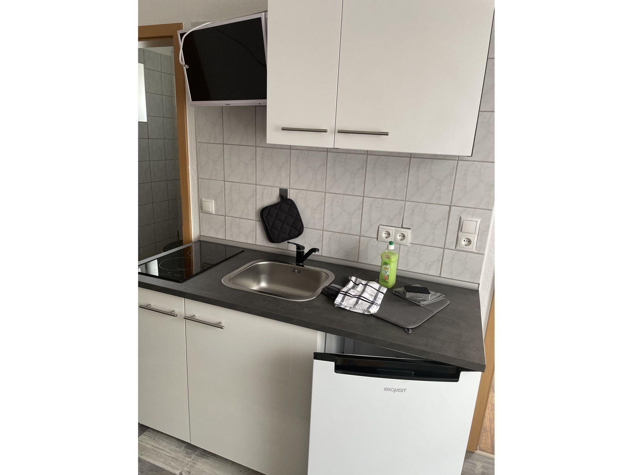 Im Erdgeschoss befindet sich der Wohn- und Kochbereich welcher mit einer Pantry-Küchenzeile mit 2-Kochstellen-Ceranfeld, Kühlschrank mit Gefrierfach, Wasserkocher, Kaffeemaschine, Toaster und Spüle sowie einem Ecksofa (Schlafcouch) und Flachbild-TV ausgestattet ist. Des Weiteren befindet sich im Erdgeschoss das Badezimmer mit Dusche/WC und Fön.