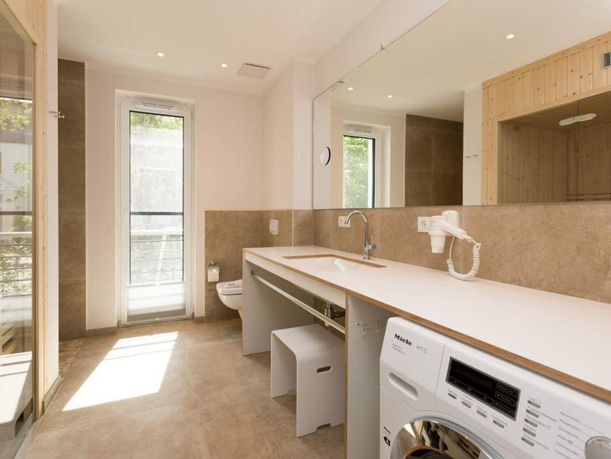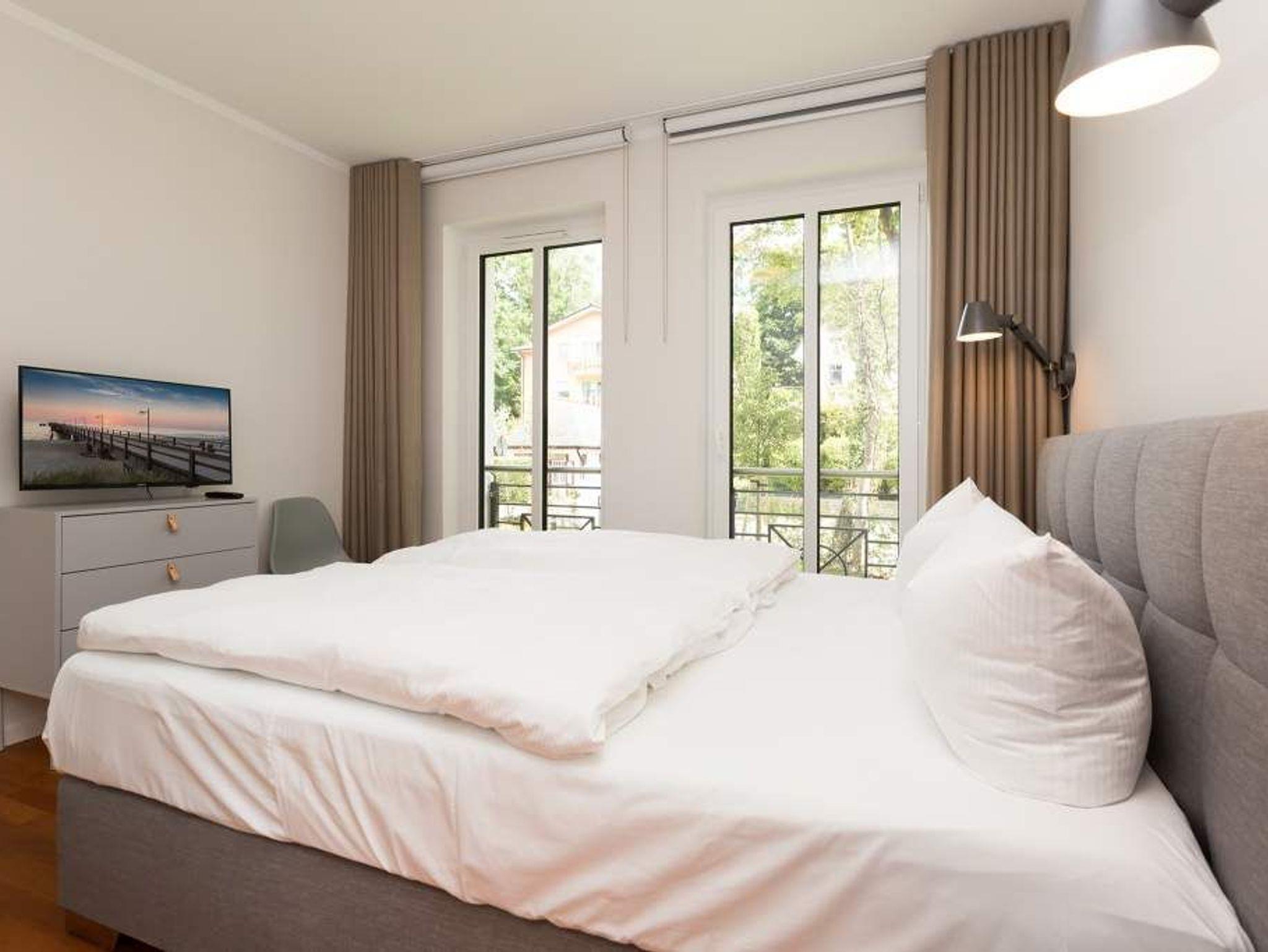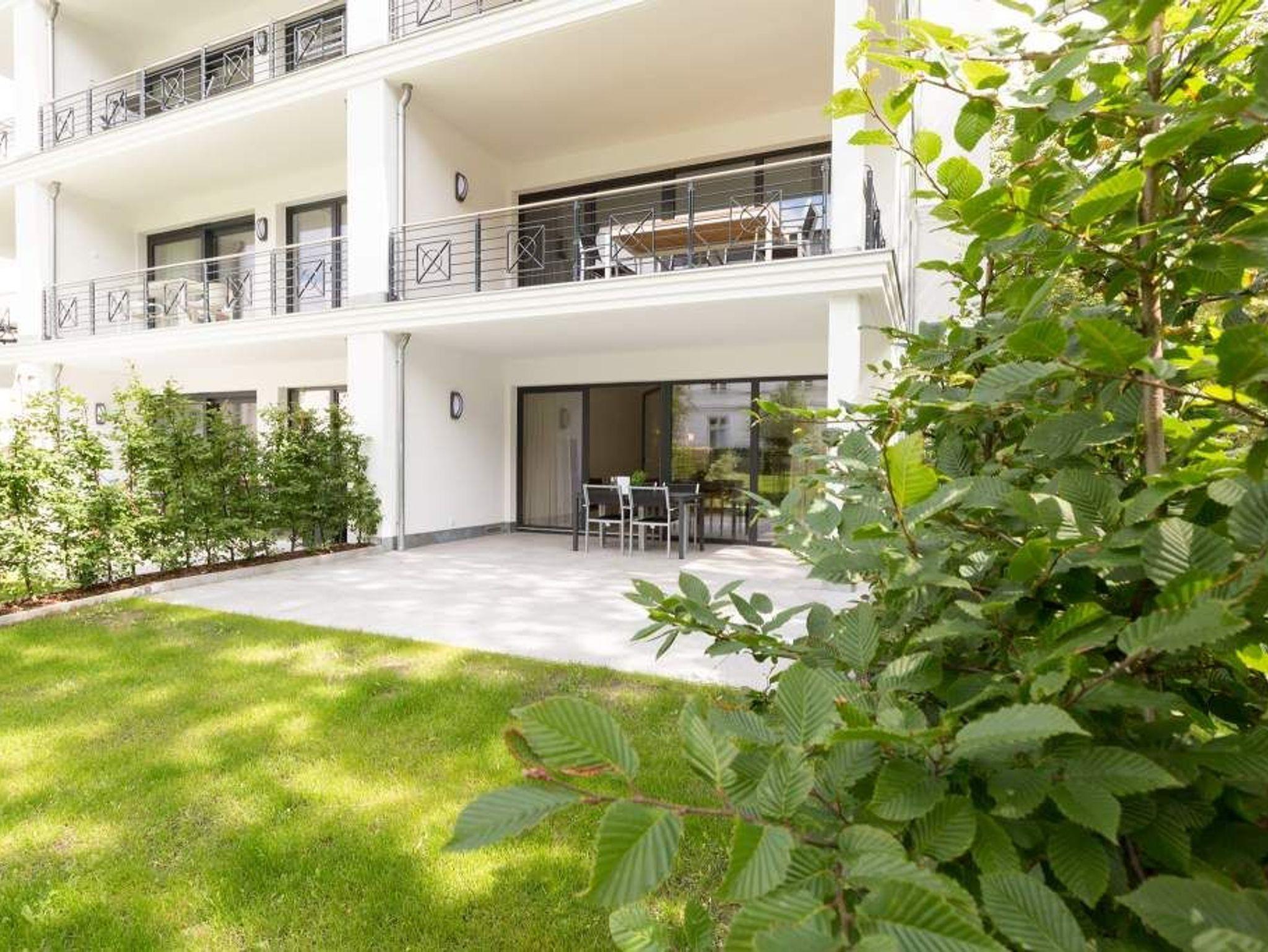 Vogelzwitschern und das sanfte Rauschen der Ostsee: Umgeben von wunderschönen, alten Bäumen atmet die 2017 fertig gestellte Villa Strandgrün das Flair der sie umgebenden Bädervillen. Mit seinen Balkonen und Erkern, die die Fassade untergliedern und auflockern, passt sich das strandnahe (100 Meter) Urlaubsdomizil angenehm in das Bild der aufwendig sanierten Villen um sie herum ein und wirkt selbst wie eine Weiterführung der einst mondänen Architektur des 19. Jahrhunderts. Das stilvolle Äußere setzt sich im exklusiven und eleganten Wohndesign im Inneren fort. Jede Ferienwohnung verfügt über eine Sonnenterrasse oder mehrere Balkone. Besondere Highlights eines jeden Appartements sind der Kamin, eine Sauna und je zwei Bäder bzw. ein zusätzliches Gäste WC. Die großzügigen 3- und 4-Raum-Suiten wurden mit allem Komfort konzipiert und ausgestattet. Vom ASA-Geschirr bis zu den hochwertigen Designmöbeln steht das Wohlfühlen an erster Stelle. In der Tiefgarage gibt es für jedes Appartement einen Stellplatz. Außerdem steht für jede Wohnung ein Briefkasten am Haus zur Verfügung.