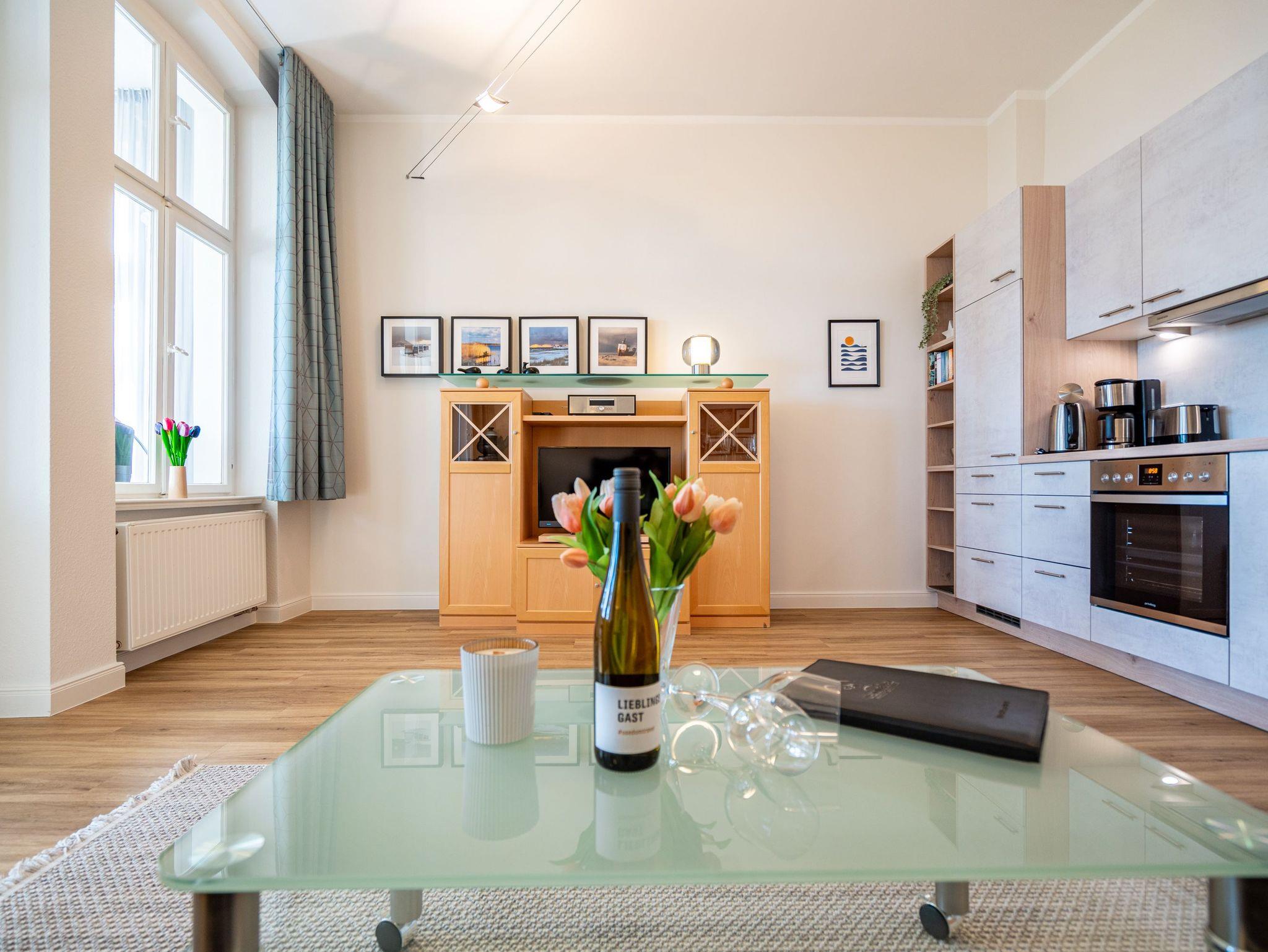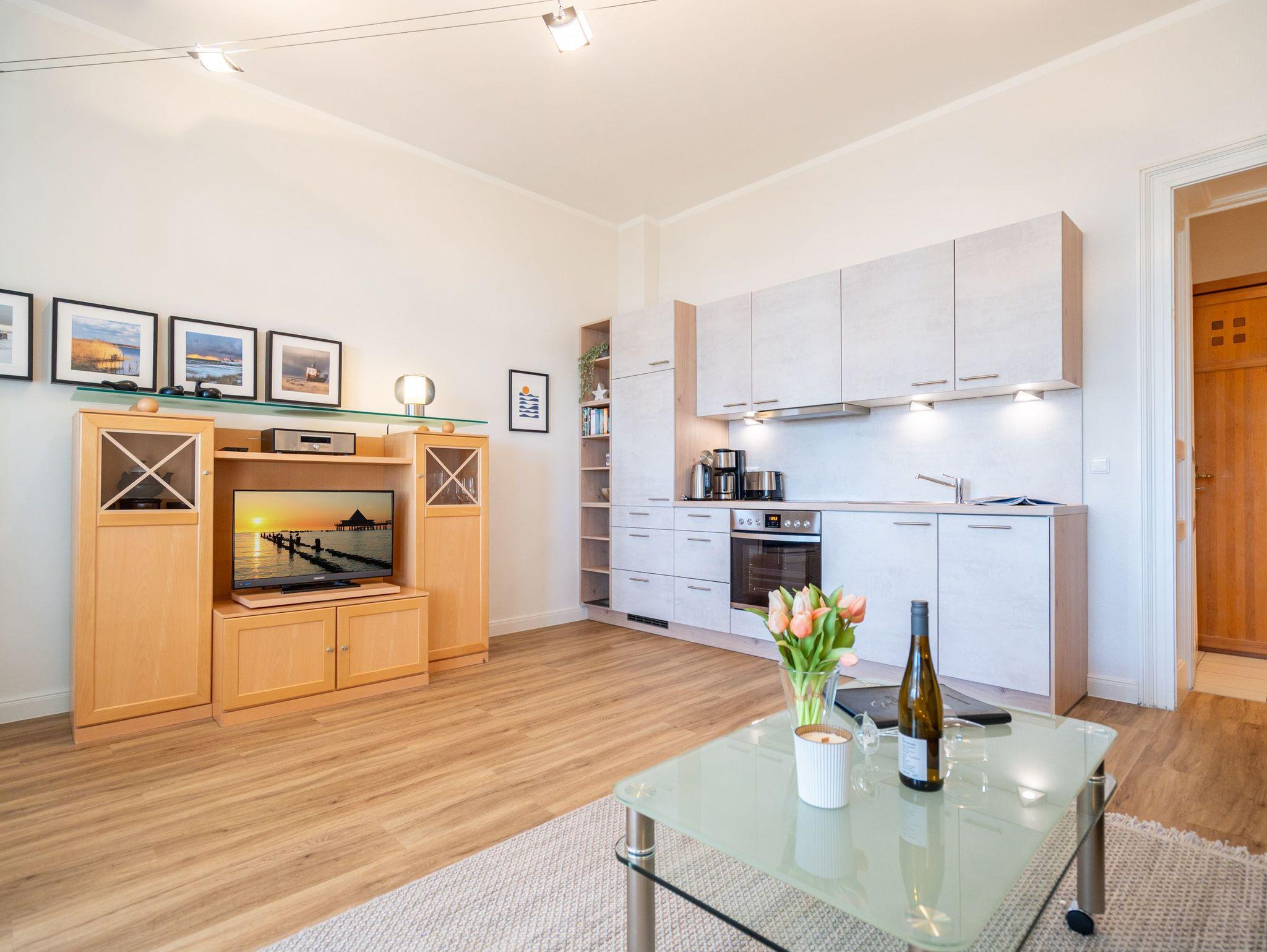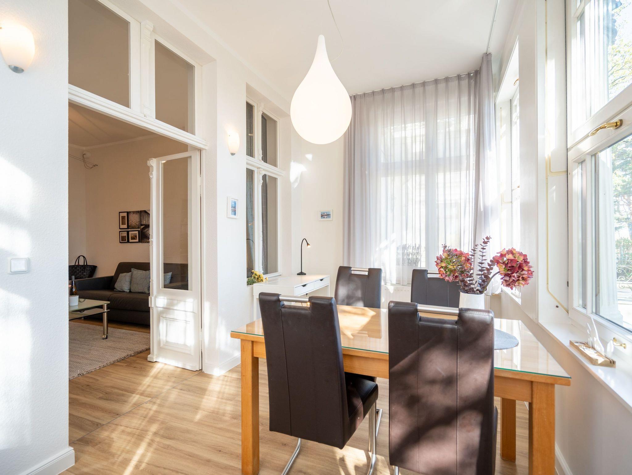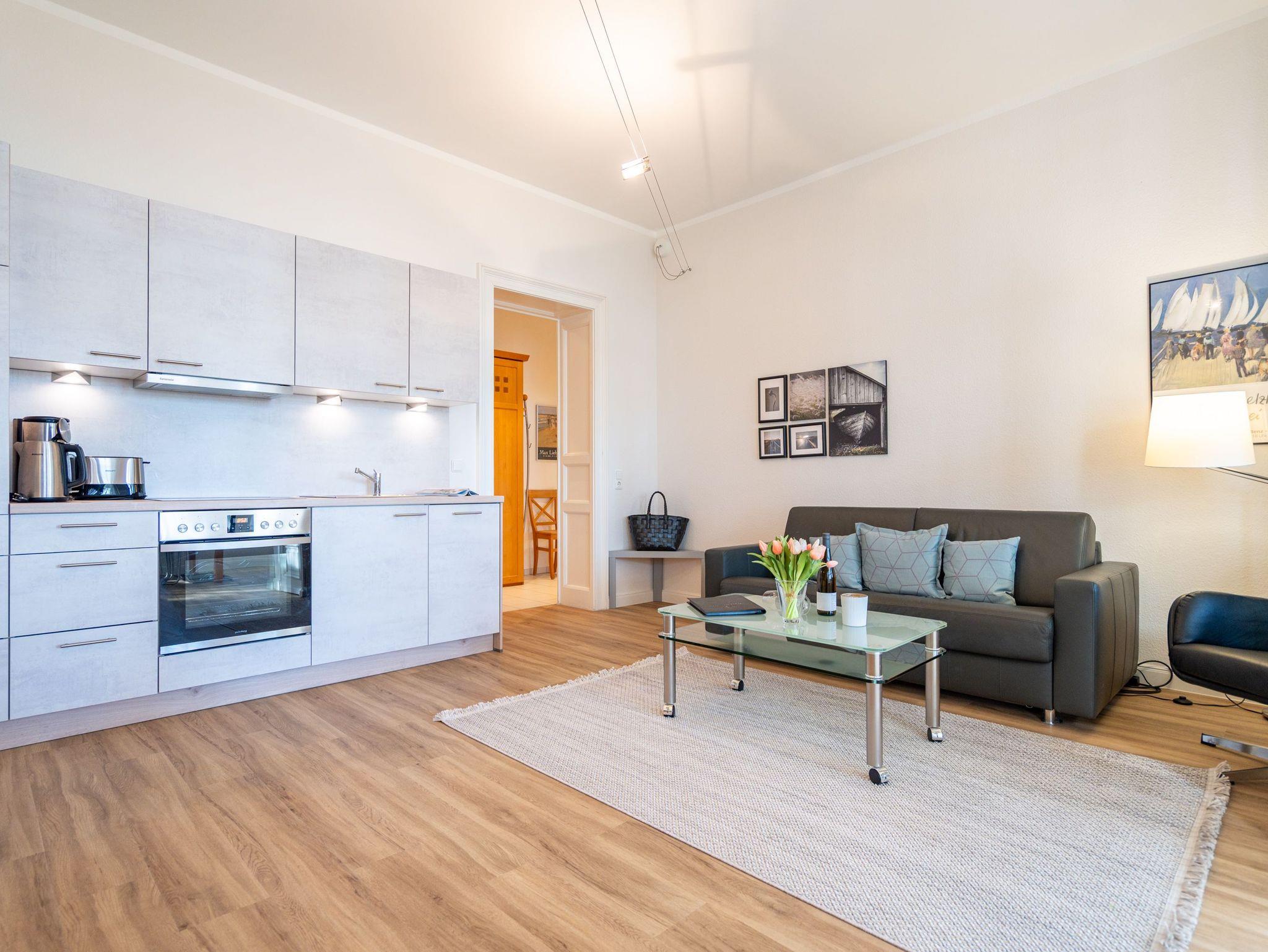 Wohnen nach Wunsch! Die 2-Raum-Ferienwohnung im Obergeschoss bietet Ihnen 58 qm Wohnfläche zum Wohlfühlen. Der Wohnbereich mit offener, komplett ausgestatteter Küchenzeile lässt keine Wünsche offen. Die vorgelagerte, verglaste Veranda verfügt über einen gemütlichen Essplatz und einen Lesesessel. Von hier hat man einen schönen Blick auf die Promenade und die Düne, durch die Bäume schimmert die Ostsee. Geschmackvolles Interieure, arrangiert mit liebevollen Details sorgen für eine entspannte, stimmungsvolle Urlaubsatmosphäre. Ein Schlafzimmer mit Doppelbett und ein Bad mit Dusche ergänzen die Wohnung. Auf Wunsch stellen wir für unsere kleinen Gäste ein Kinderreisebett (ohne zusätzliche Matratze [&] Bettzeug) und einen Kinderhochstuhl ( gegen einen Aufpreis) zur Verfügung. Für Ihren Komfort sind die Betten bei der Anreise bezogen und Handtücher liegen bereit (Erstausstattung). Das WLAN-Netz ist kostenfrei nutzbar.