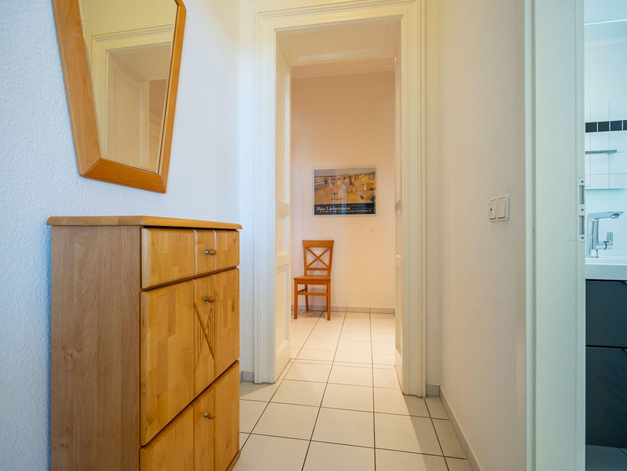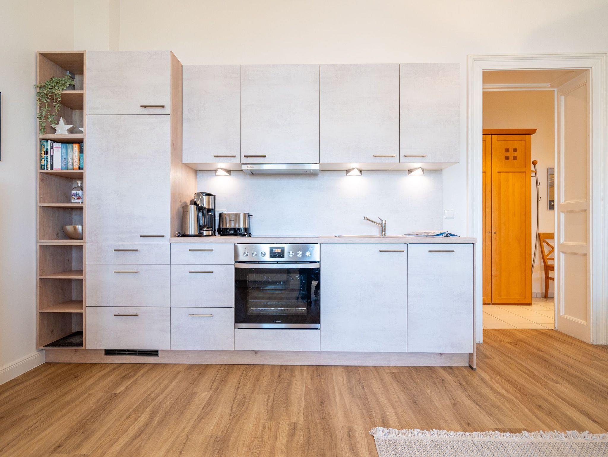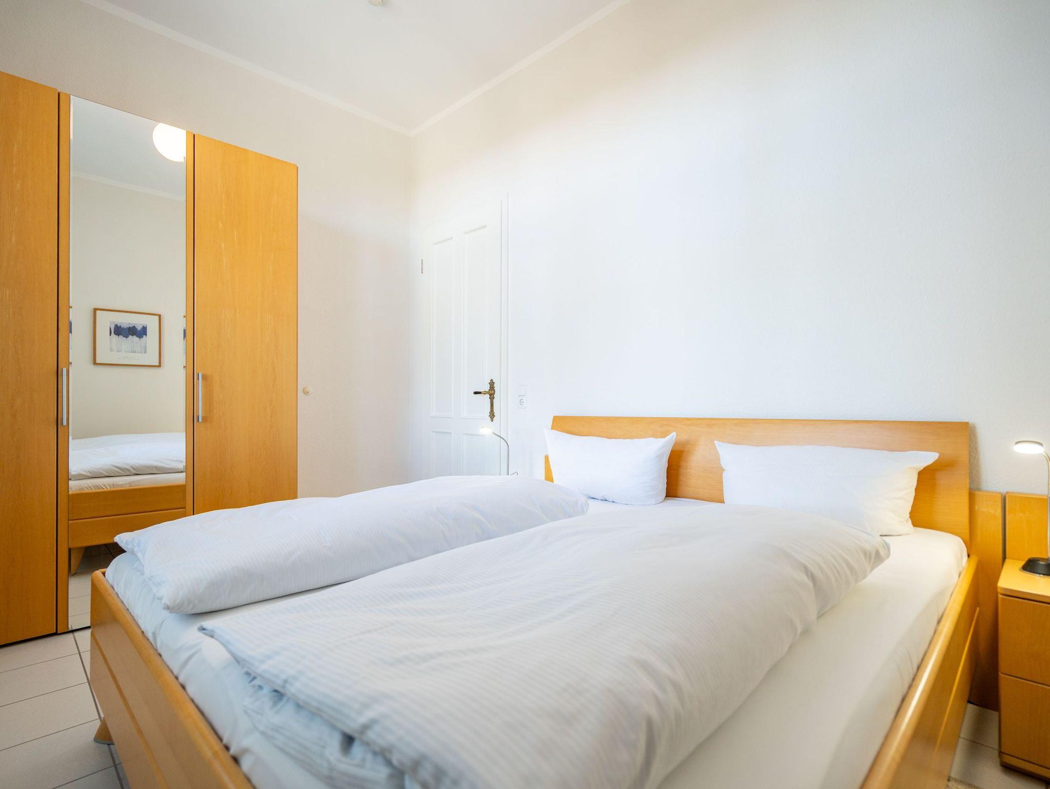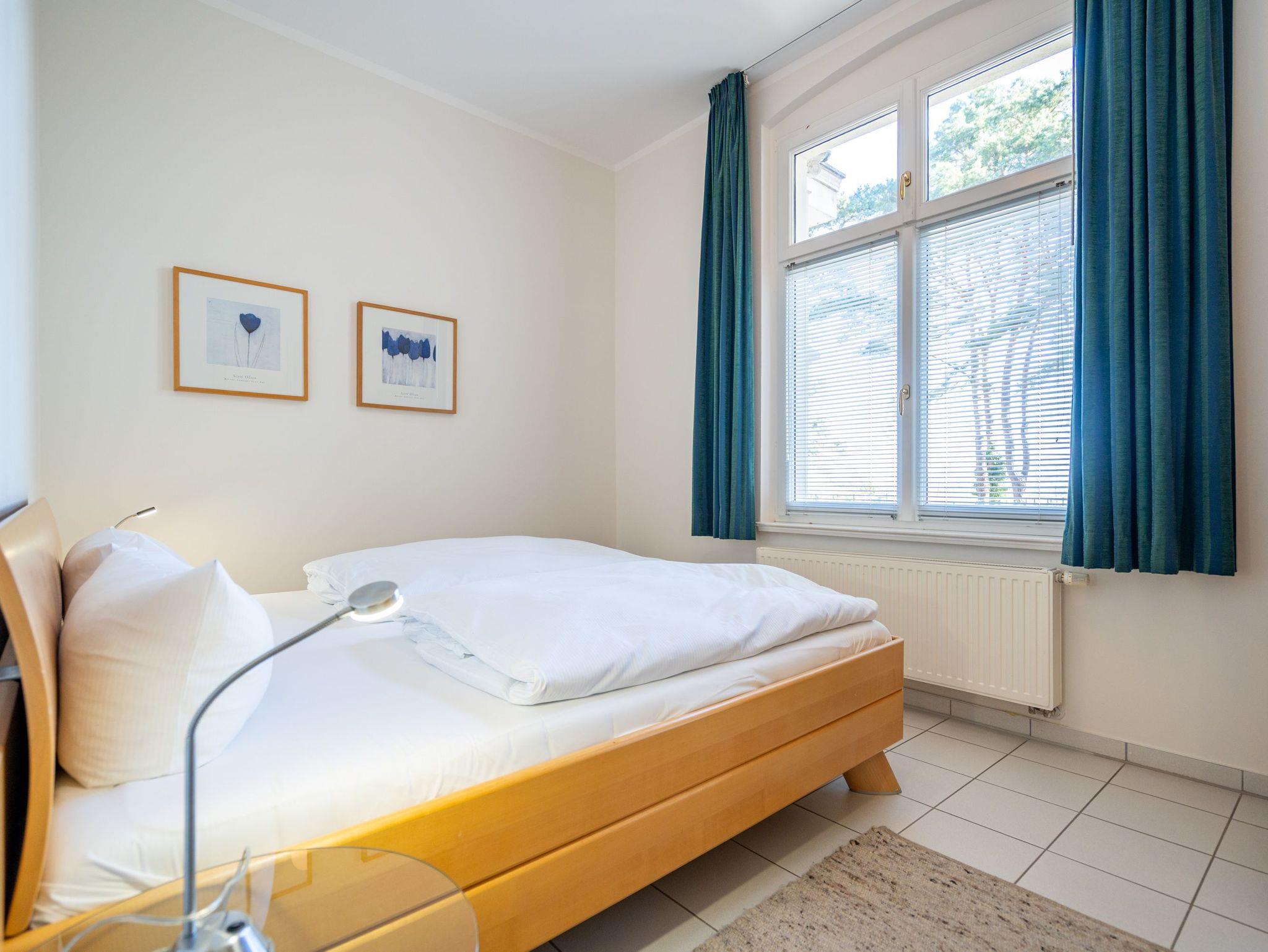 Wohnen nach Wunsch! Die 2-Raum-Ferienwohnung im Obergeschoss bietet Ihnen 58 qm Wohnfläche zum Wohlfühlen. Der Wohnbereich mit offener, komplett ausgestatteter Küchenzeile lässt keine Wünsche offen. Die vorgelagerte, verglaste Veranda verfügt über einen gemütlichen Essplatz und einen Lesesessel. Von hier hat man einen schönen Blick auf die Promenade und die Düne, durch die Bäume schimmert die Ostsee. Geschmackvolles Interieure, arrangiert mit liebevollen Details sorgen für eine entspannte, stimmungsvolle Urlaubsatmosphäre. Ein Schlafzimmer mit Doppelbett und ein Bad mit Dusche ergänzen die Wohnung. Auf Wunsch stellen wir für unsere kleinen Gäste ein Kinderreisebett (ohne zusätzliche Matratze [&] Bettzeug) und einen Kinderhochstuhl ( gegen einen Aufpreis) zur Verfügung. Für Ihren Komfort sind die Betten bei der Anreise bezogen und Handtücher liegen bereit (Erstausstattung). Das WLAN-Netz ist kostenfrei nutzbar.