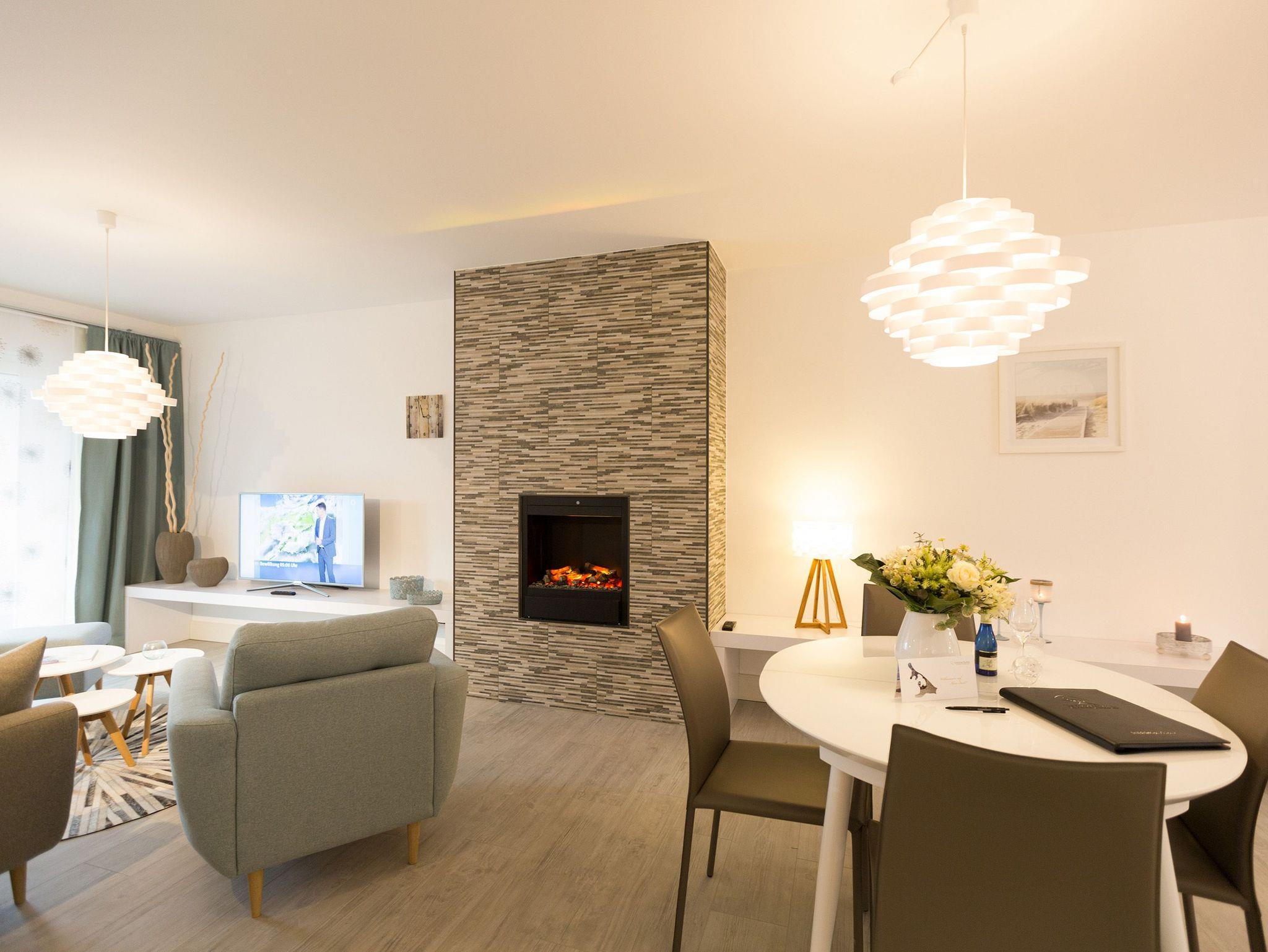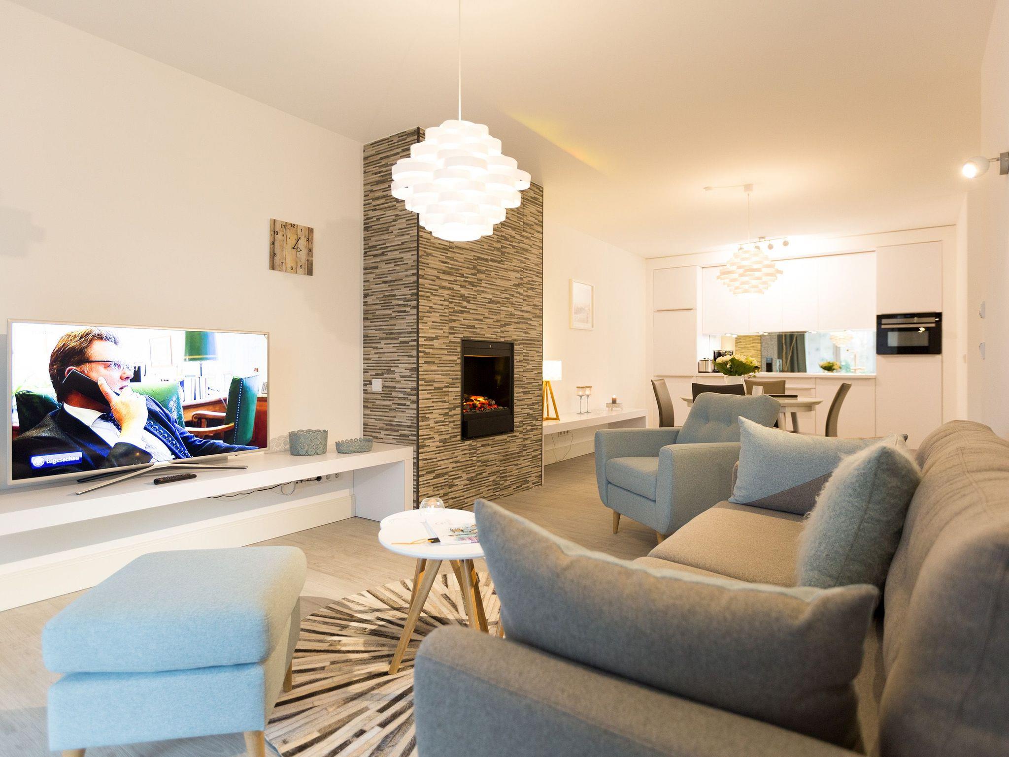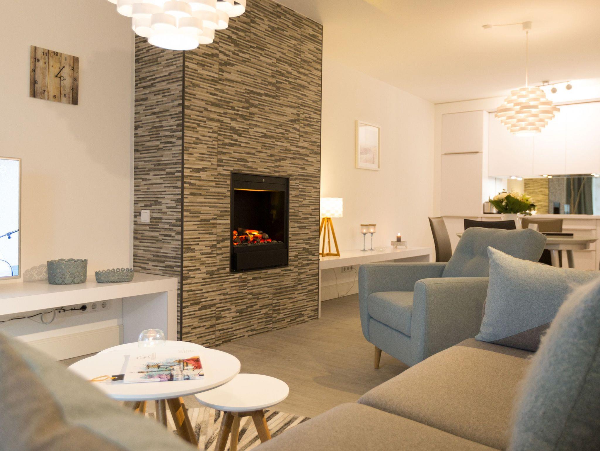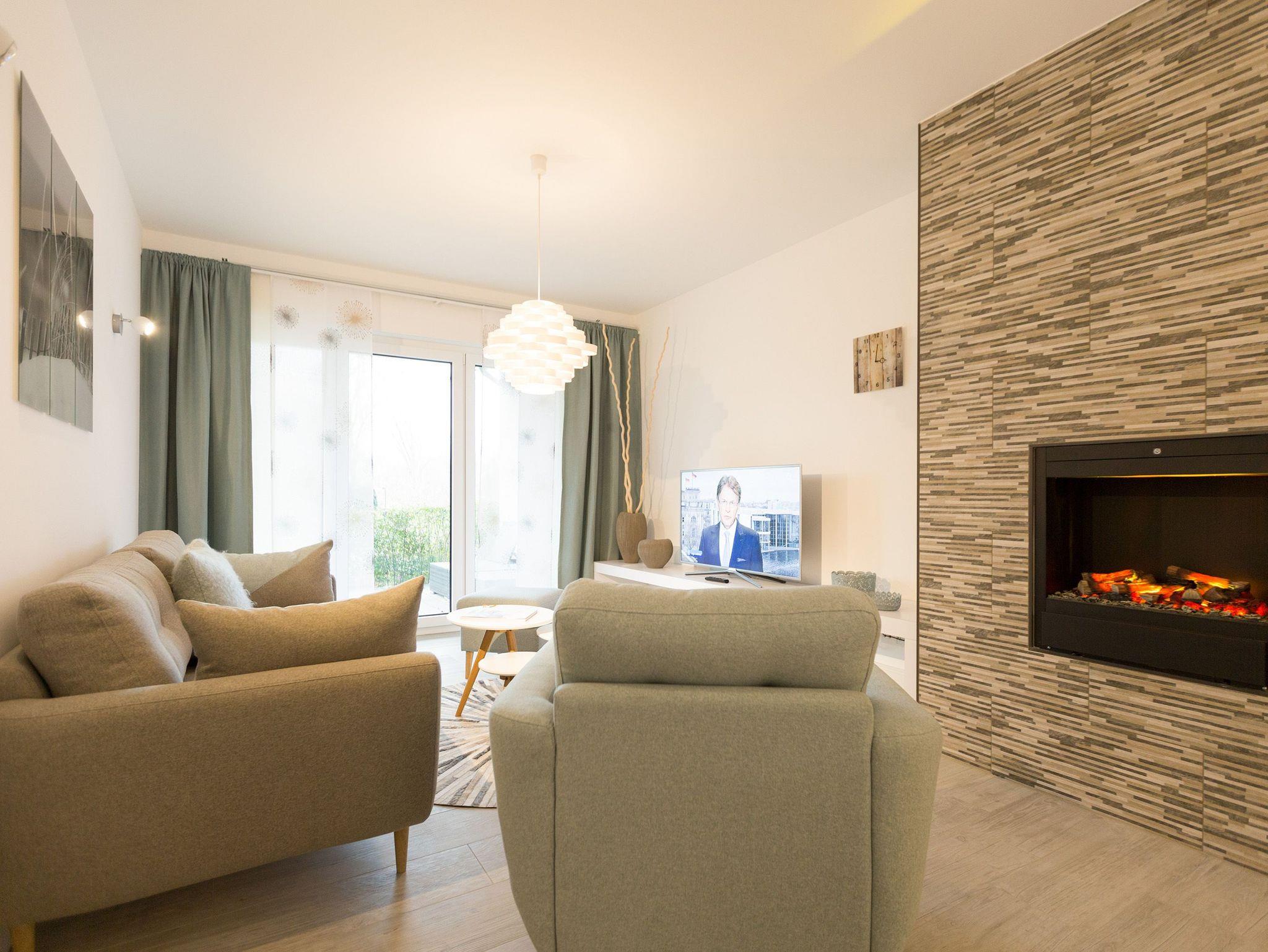 Er ist ein echter Hingucker schon beim Eintreten in dieses elegante und stilvolle Urlaubsappartement im Erdgeschoss der Dünenresidenz Heringsdorf ? der große, in Stein gefasste Elektro-Kamin. Sein warmes Licht sorgt nicht nur an kühlen Tagen für wohlige Behaglichkeit. Es wartet eine Wohlfühlwelt auf Sie, die auf 80 Quadratmetern reichlich Platz für bis zu vier Erwachsene bietet. Das gesamte Interieur ist harmonisch aufeinander abgestimmt. Stylisch sind auf alle Fälle die nordischen Design-Lampen. Abschalten und den Alltagsstress vergessen, lässt es sich auf der Sitzgruppe mit gemütlicher Couch und Blick auf den Kamin oder den großen Flat-TV wunderbar. Machen Sie die großen, bodentiefen Wohnzimmerfenster auf, lassen sie das Meeresrauschen vom nur 50 Meter entfernten Ostseestrand und die lichten Sonnenstrahlen in ihr Domizil oder entspannen Sie auf der 20 Quadratmeter großen Südterrasse. Zum Wohnbereich gehört eine helle, offene Küche mit großem Esstisch. Mit allem ausgestattet, was das Kochherz höher schlagen lässt, können Sie hier das gemütliche Zusammensitzen und Schlemmen wahrhaft zelebrieren. Haben Sie Spaß und einen erholsamen Schlaf in den beiden Schlafzimmern. Denn hier locken bequeme Doppelboxspringbetten (einmal 1,80 m x 2,00 m und einmal 1,60 m x 2,00 m), um Ihnen die Nächte zu versüßen. Das Badezimmer ist sehr geräumig und mit Waschtisch, WC und großer Echtglas-Dusche ausgestattet. Die Betten sind bezogen und Handtücher liegen bei Ankunft bereit. Zu der Wohnung gehört ein Pkw-Stellplatz in der Tiefgarage (max. Einfahrtshöhe 1,85 m).