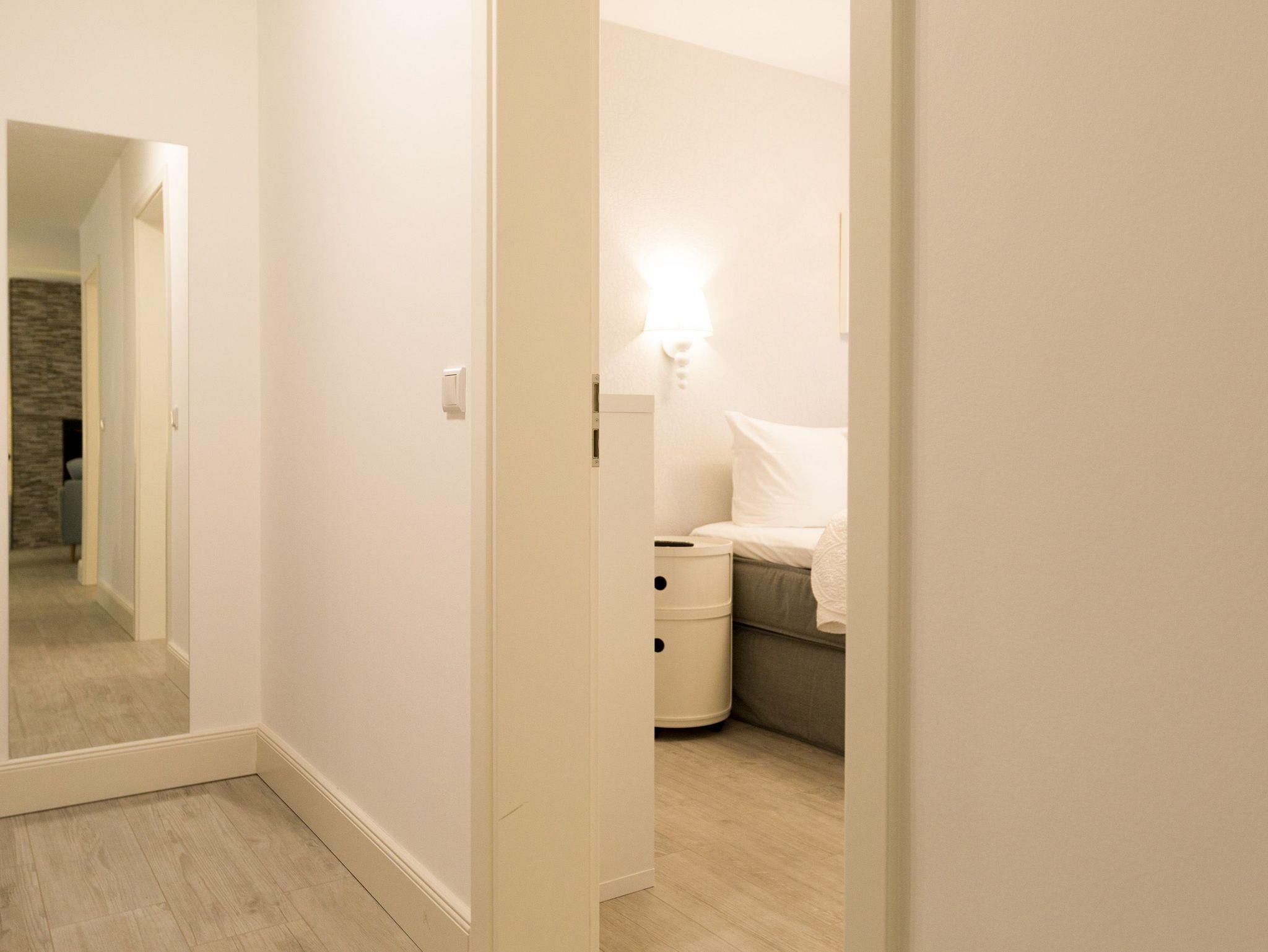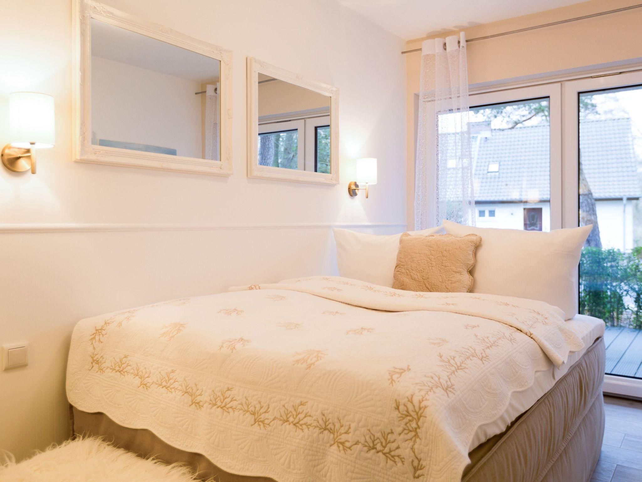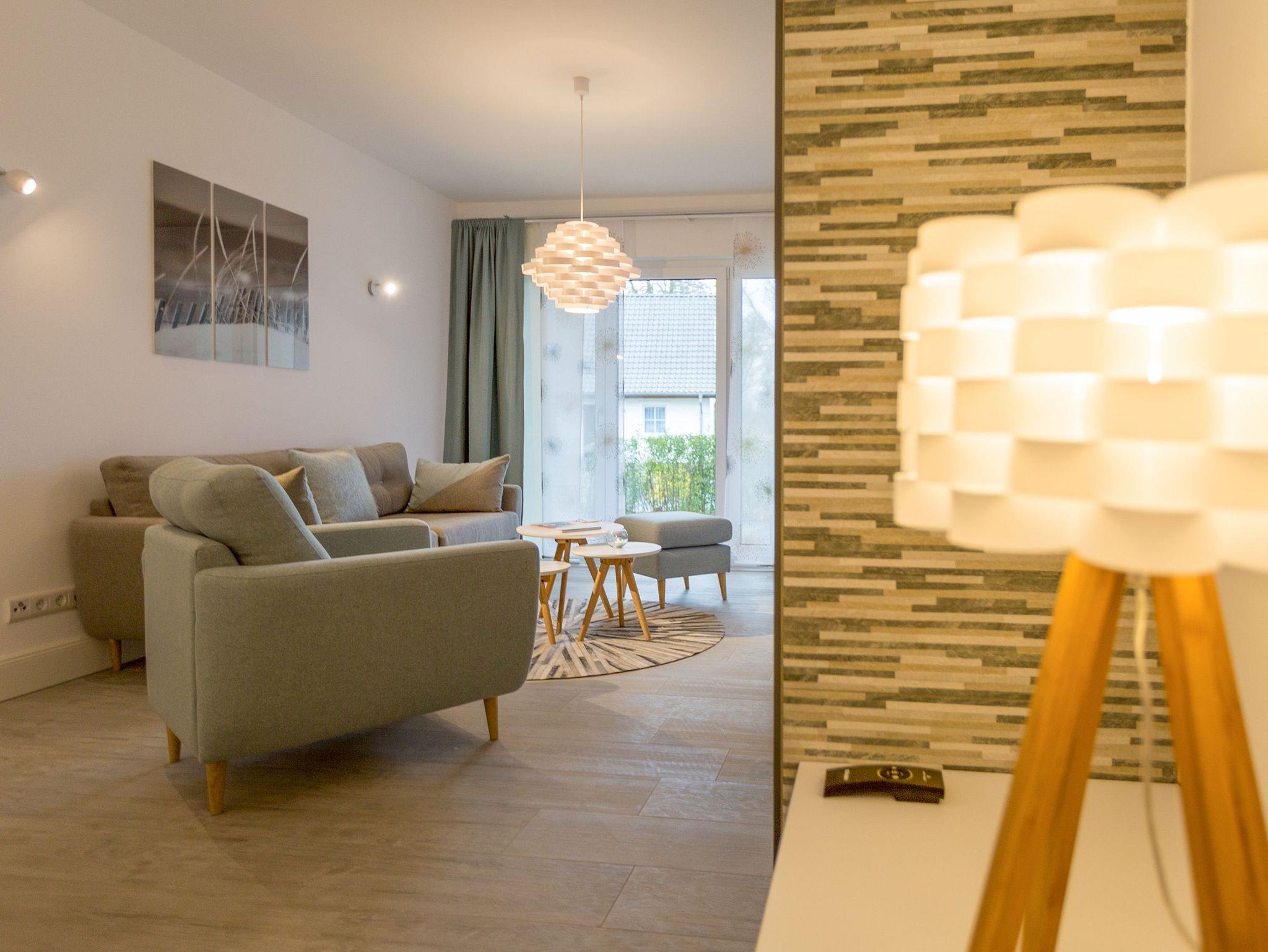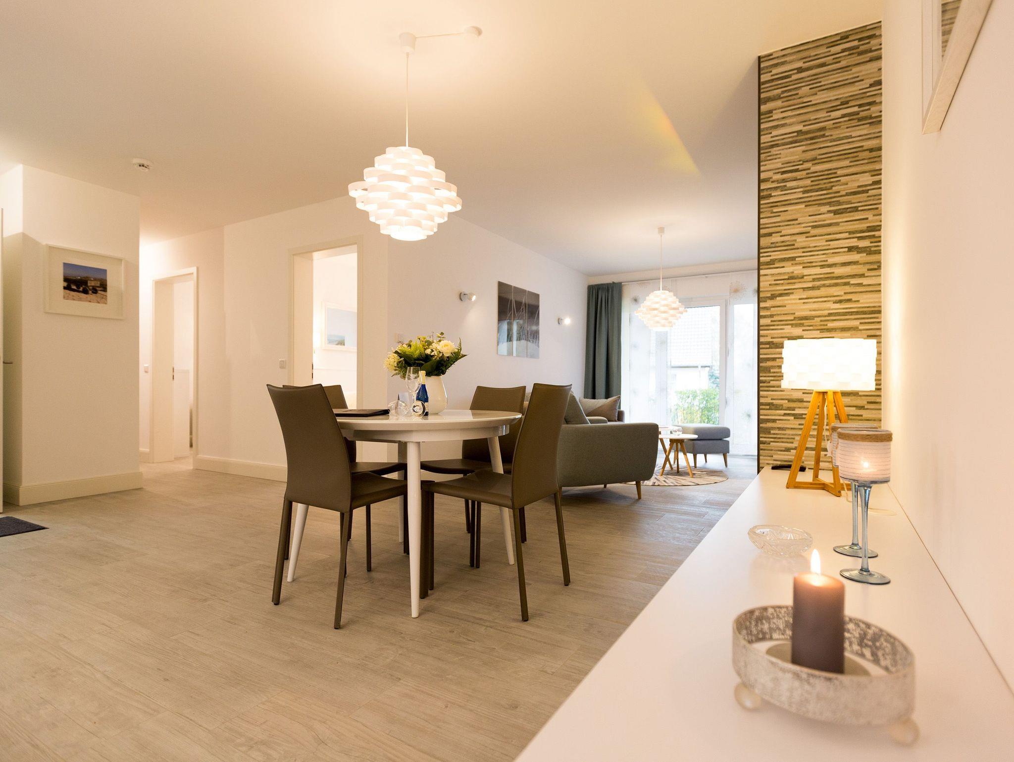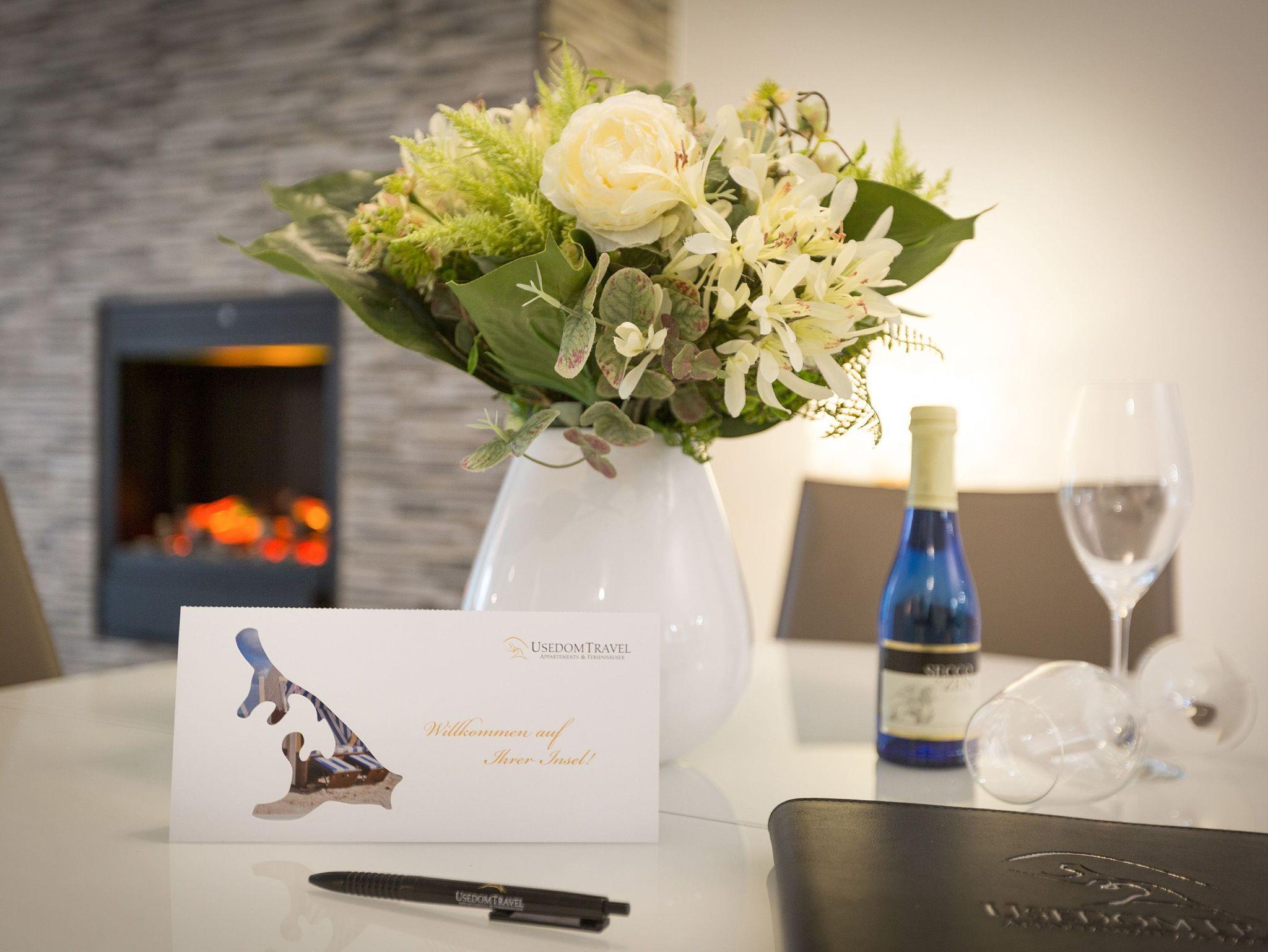 Er ist ein echter Hingucker schon beim Eintreten in dieses elegante und stilvolle Urlaubsappartement im Erdgeschoss der Dünenresidenz Heringsdorf ? der große, in Stein gefasste Elektro-Kamin. Sein warmes Licht sorgt nicht nur an kühlen Tagen für wohlige Behaglichkeit. Es wartet eine Wohlfühlwelt auf Sie, die auf 80 Quadratmetern reichlich Platz für bis zu vier Erwachsene bietet. Das gesamte Interieur ist harmonisch aufeinander abgestimmt. Stylisch sind auf alle Fälle die nordischen Design-Lampen. Abschalten und den Alltagsstress vergessen, lässt es sich auf der Sitzgruppe mit gemütlicher Couch und Blick auf den Kamin oder den großen Flat-TV wunderbar. Machen Sie die großen, bodentiefen Wohnzimmerfenster auf, lassen sie das Meeresrauschen vom nur 50 Meter entfernten Ostseestrand und die lichten Sonnenstrahlen in ihr Domizil oder entspannen Sie auf der 20 Quadratmeter großen Südterrasse. Zum Wohnbereich gehört eine helle, offene Küche mit großem Esstisch. Mit allem ausgestattet, was das Kochherz höher schlagen lässt, können Sie hier das gemütliche Zusammensitzen und Schlemmen wahrhaft zelebrieren. Haben Sie Spaß und einen erholsamen Schlaf in den beiden Schlafzimmern. Denn hier locken bequeme Doppelboxspringbetten (einmal 1,80 m x 2,00 m und einmal 1,60 m x 2,00 m), um Ihnen die Nächte zu versüßen. Das Badezimmer ist sehr geräumig und mit Waschtisch, WC und großer Echtglas-Dusche ausgestattet. Die Betten sind bezogen und Handtücher liegen bei Ankunft bereit. Zu der Wohnung gehört ein Pkw-Stellplatz in der Tiefgarage (max. Einfahrtshöhe 1,85 m).