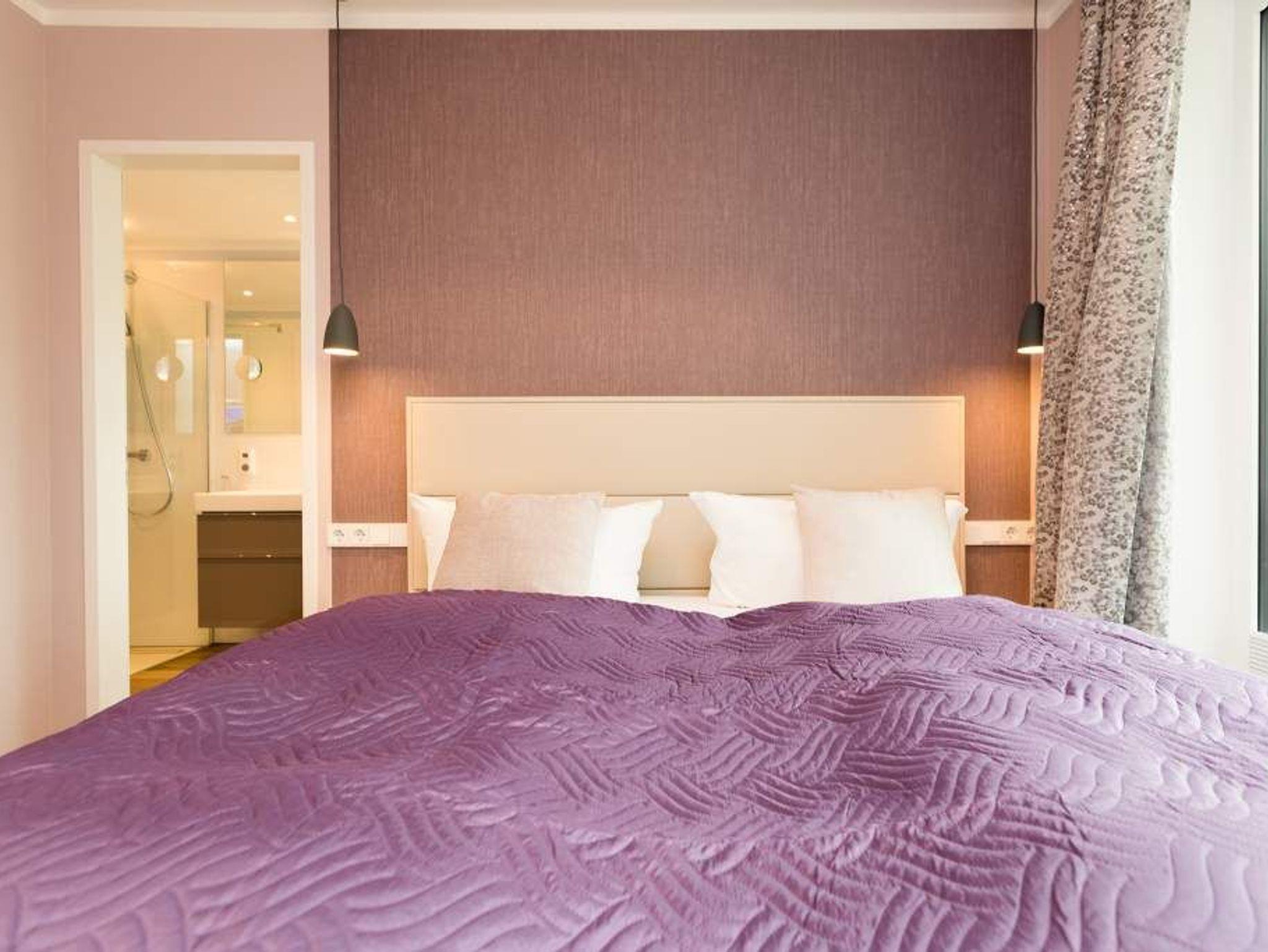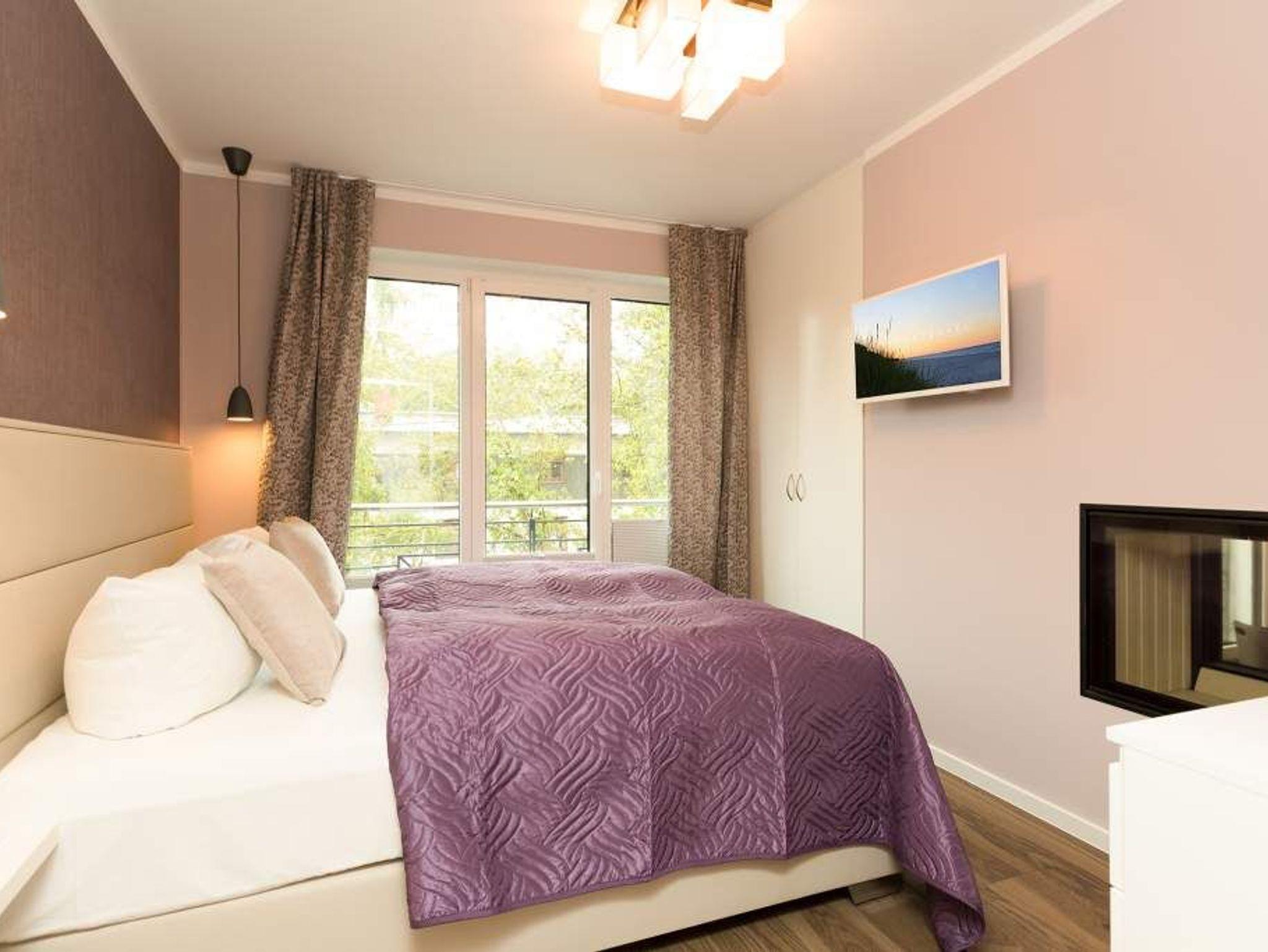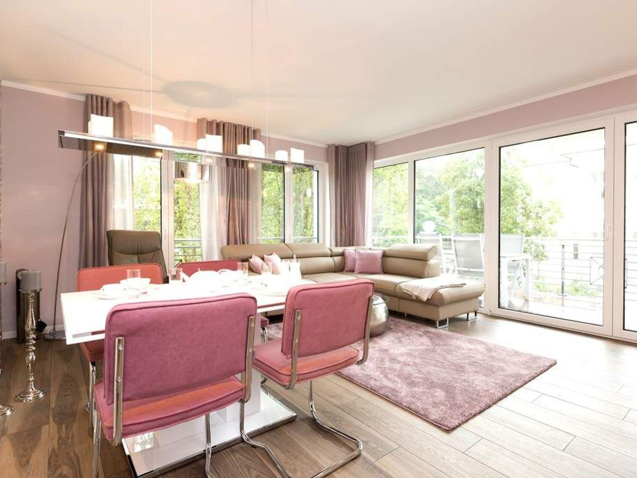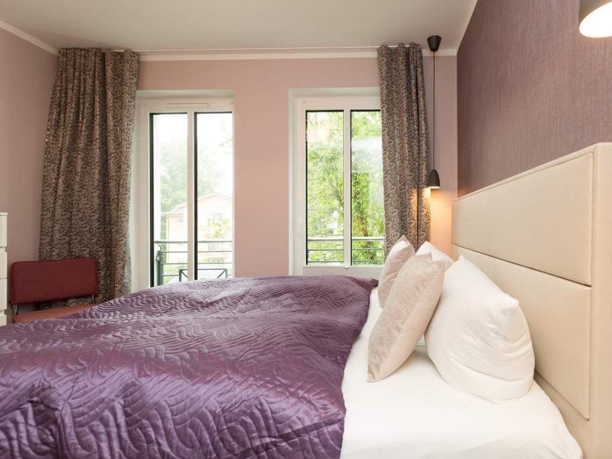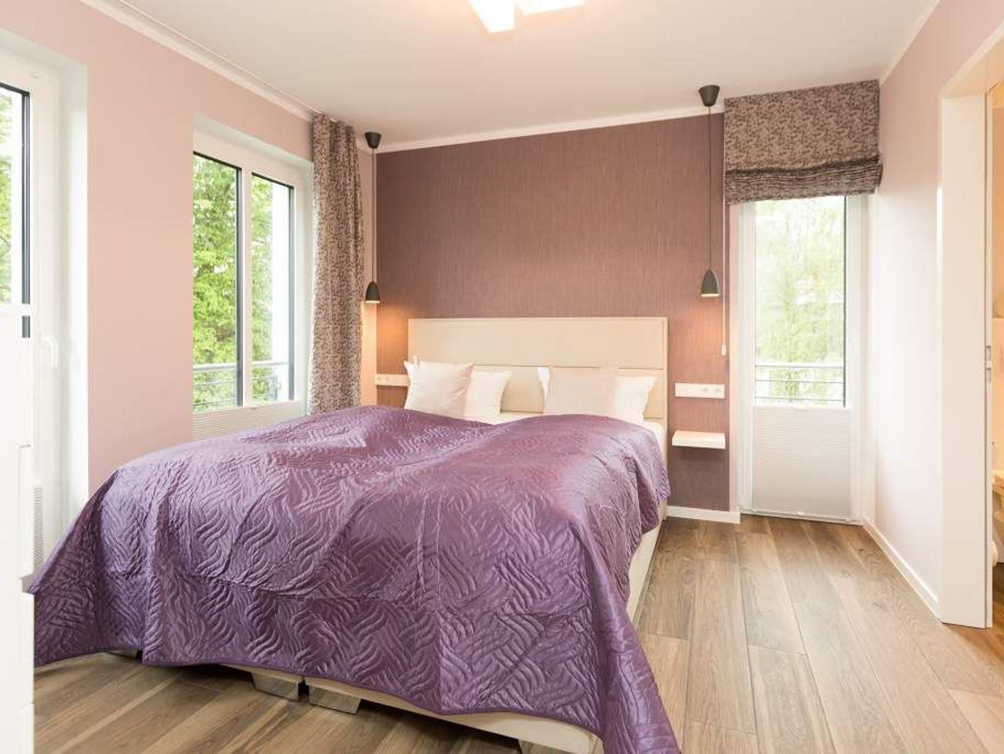 Der perfekte Urlaub beginnt mit dem perfekten Aufwachen in einer Wohnung, in der man sich rundum wohlfühlt. Eingekuschelt in die weißen Laken, noch einmal räkeln und ausstrecken in den herrlich bequemen Doppelboxspringbetten (1,80 m x 2,00 m) der beiden wunderbar lichtdurchfluteten Schlafzimmer ? schöner kann der Start in den Urlaubstag nicht sein. Die 87 Quadratmeter große Wohlfühlwelt der Wohnung Nummer 9 im zweiten Obergeschoss der Villa Strandgrün bietet in ihren drei Räumen Platz für vier Personen und ein Kleinkind im Kinderreisebett. Großzügig, hell und in zarten Rosé- und Violett-Tönen gehalten, strahlt das Appartement Eleganz und Leichtigkeit aus. Ob auf der komfortablen Sofalandschaft, dem gemütlichen Lesesessel oder am stylischen Designer-Esstisch ? hier kann man es sich gut gehen lassen. Ein absolut außergewöhnliches Highlight ist der Kaminofen, dessen romantisches Flackern sowohl vom Wohnzimmer als auch von einem der beiden Schlafzimmer aus genossen werden kann. Flat-TVs gibt es in jedem der drei Zimmer. Vom Wohnzimmer aus geht es auf den großen Südbalkon mit Gartenmöbeln, Sonnenliege und Blick auf den begrünten Garten und die umliegenden Bädervillen. Die offene Küche mit Metrofliesen ist mit hochwertigen Geräten und Design-Geschirr ausgestattet. Jedes Schlafzimmer verfügt über Einbauschränke und ein eigenes Bad mit Dusche, Waschtisch und WC. Natürlich können die Schlafzimmer verdunkelt werden. Eine geräumige Panorama-Sauna auf dem Flur lädt zum wohligen Abschalten an kühlen Tagen und Abenden ein. Ein kleiner Hauswirtschaftsraum bietet Stauraum. Damit Sie sich so richtig entspannen können, sind die Betten bezogen und Handtücher liegen für Sie bereit. In der Tiefgarage ist ein Stellplatz reserviert. Im wohnungseigenen Kellerraum ist Platz für maximal 2 Fahrräder.