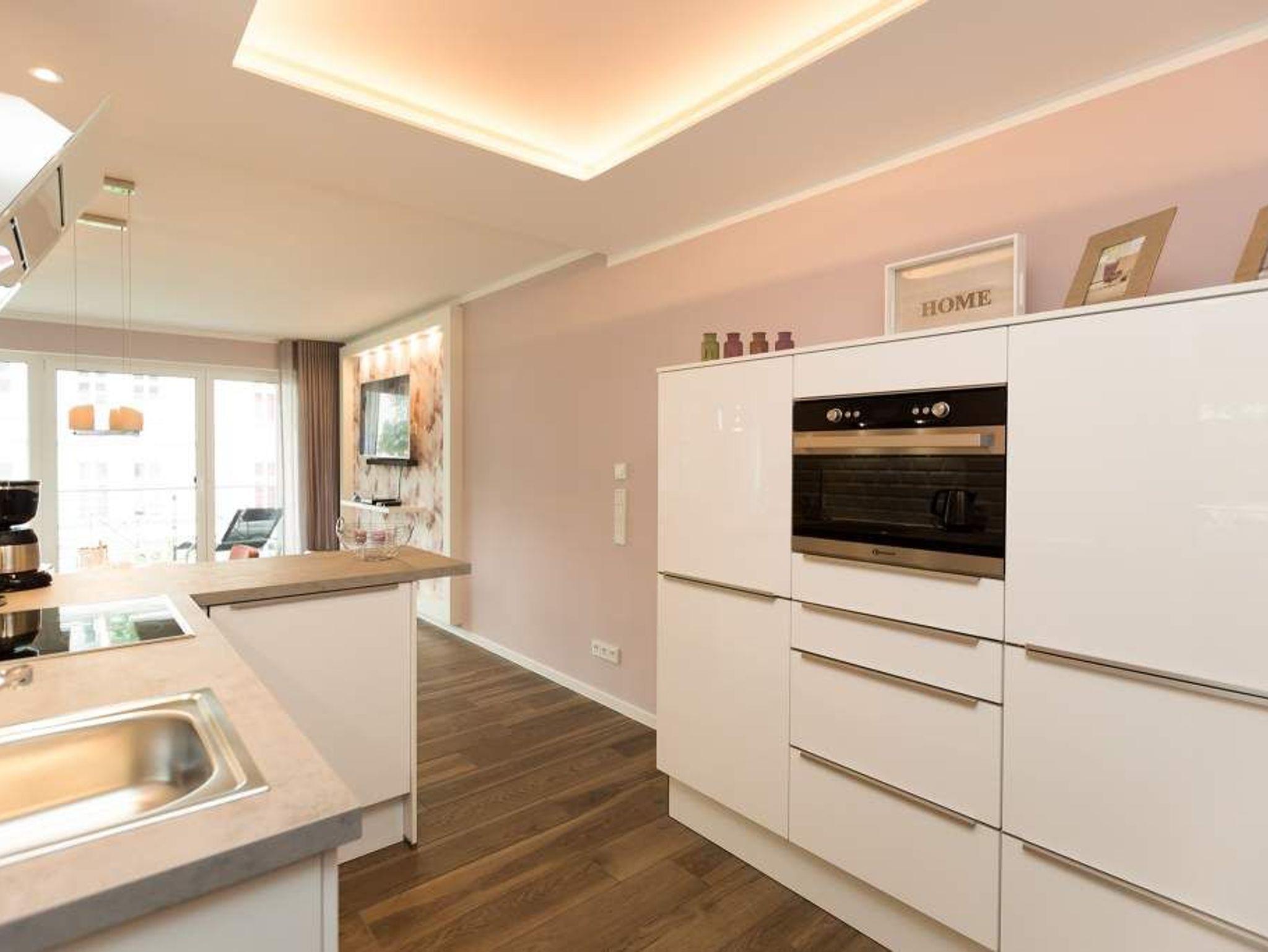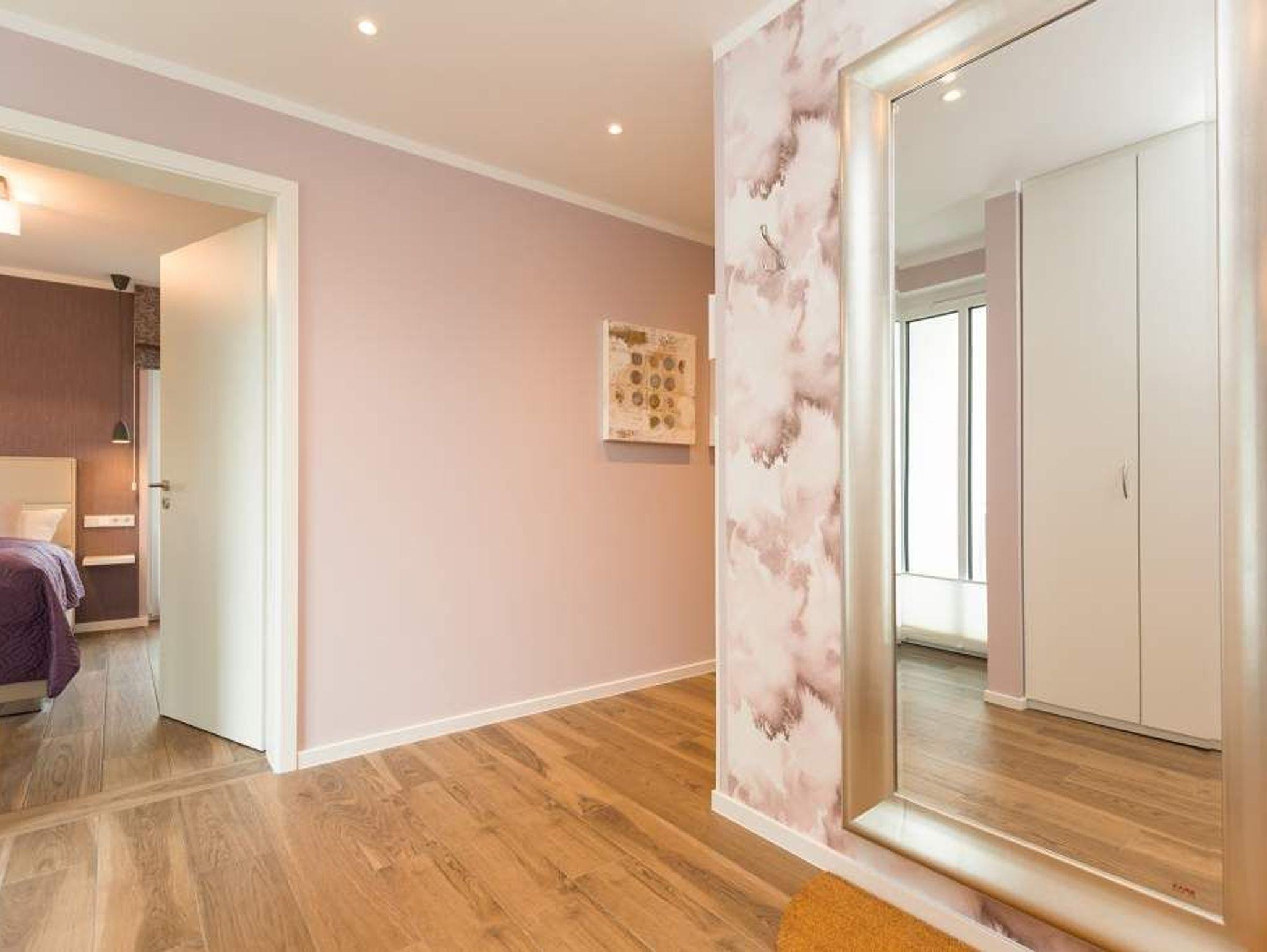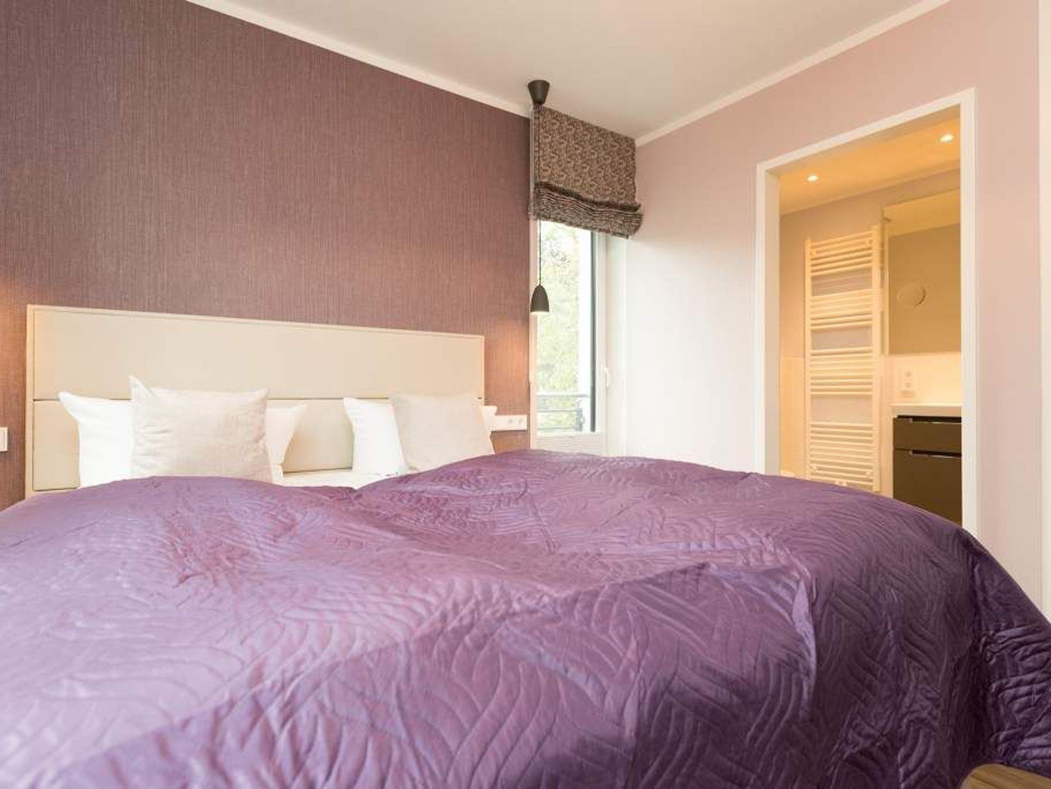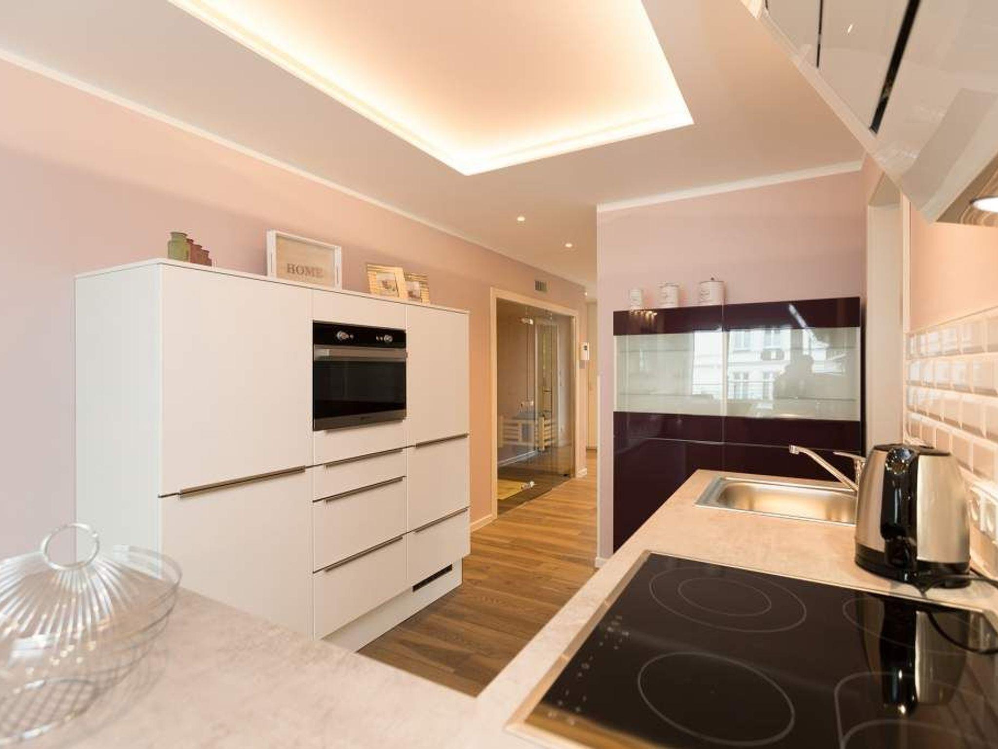 Der perfekte Urlaub beginnt mit dem perfekten Aufwachen in einer Wohnung, in der man sich rundum wohlfühlt. Eingekuschelt in die weißen Laken, noch einmal räkeln und ausstrecken in den herrlich bequemen Doppelboxspringbetten (1,80 m x 2,00 m) der beiden wunderbar lichtdurchfluteten Schlafzimmer ? schöner kann der Start in den Urlaubstag nicht sein. Die 87 Quadratmeter große Wohlfühlwelt der Wohnung Nummer 9 im zweiten Obergeschoss der Villa Strandgrün bietet in ihren drei Räumen Platz für vier Personen und ein Kleinkind im Kinderreisebett. Großzügig, hell und in zarten Rosé- und Violett-Tönen gehalten, strahlt das Appartement Eleganz und Leichtigkeit aus. Ob auf der komfortablen Sofalandschaft, dem gemütlichen Lesesessel oder am stylischen Designer-Esstisch ? hier kann man es sich gut gehen lassen. Ein absolut außergewöhnliches Highlight ist der Kaminofen, dessen romantisches Flackern sowohl vom Wohnzimmer als auch von einem der beiden Schlafzimmer aus genossen werden kann. Flat-TVs gibt es in jedem der drei Zimmer. Vom Wohnzimmer aus geht es auf den großen Südbalkon mit Gartenmöbeln, Sonnenliege und Blick auf den begrünten Garten und die umliegenden Bädervillen. Die offene Küche mit Metrofliesen ist mit hochwertigen Geräten und Design-Geschirr ausgestattet. Jedes Schlafzimmer verfügt über Einbauschränke und ein eigenes Bad mit Dusche, Waschtisch und WC. Natürlich können die Schlafzimmer verdunkelt werden. Eine geräumige Panorama-Sauna auf dem Flur lädt zum wohligen Abschalten an kühlen Tagen und Abenden ein. Ein kleiner Hauswirtschaftsraum bietet Stauraum. Damit Sie sich so richtig entspannen können, sind die Betten bezogen und Handtücher liegen für Sie bereit. In der Tiefgarage ist ein Stellplatz reserviert. Im wohnungseigenen Kellerraum ist Platz für maximal 2 Fahrräder.