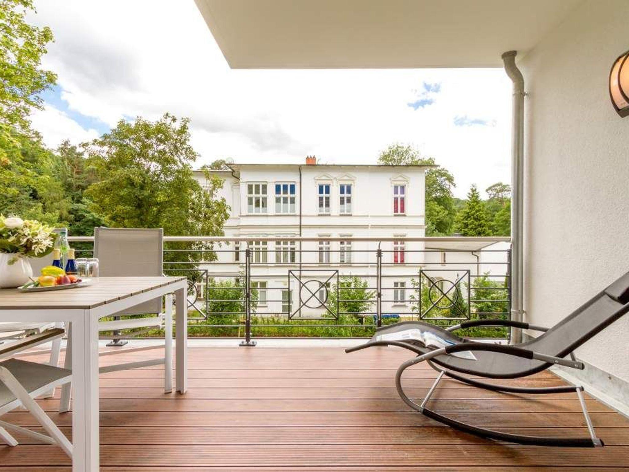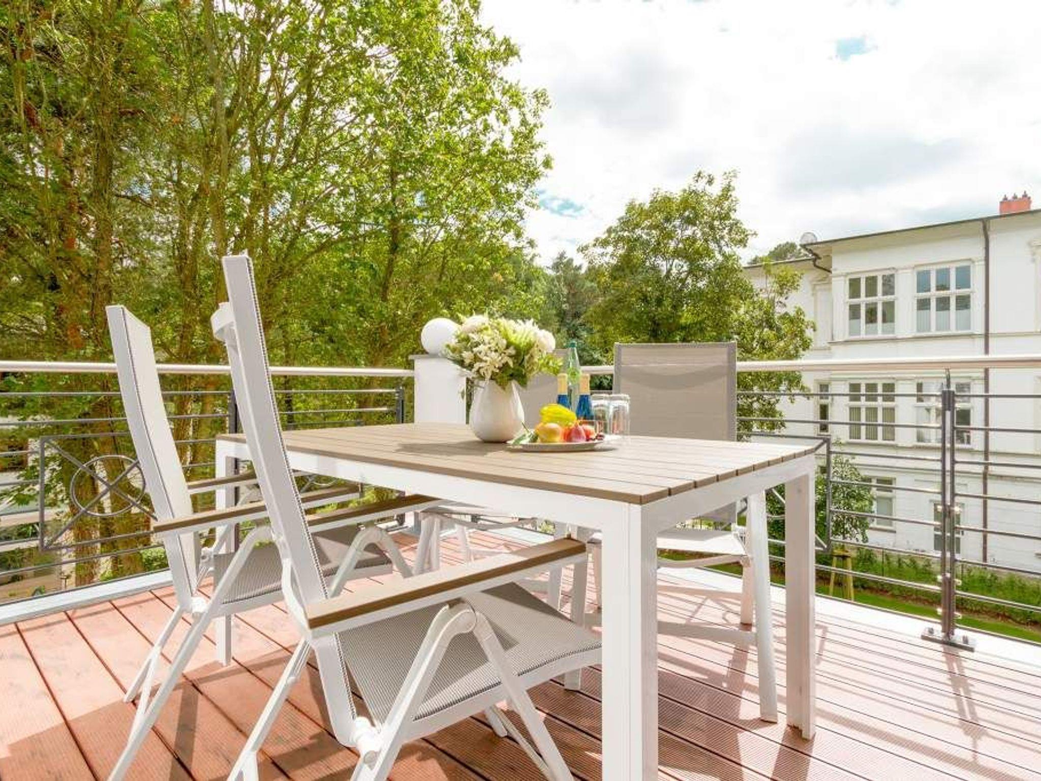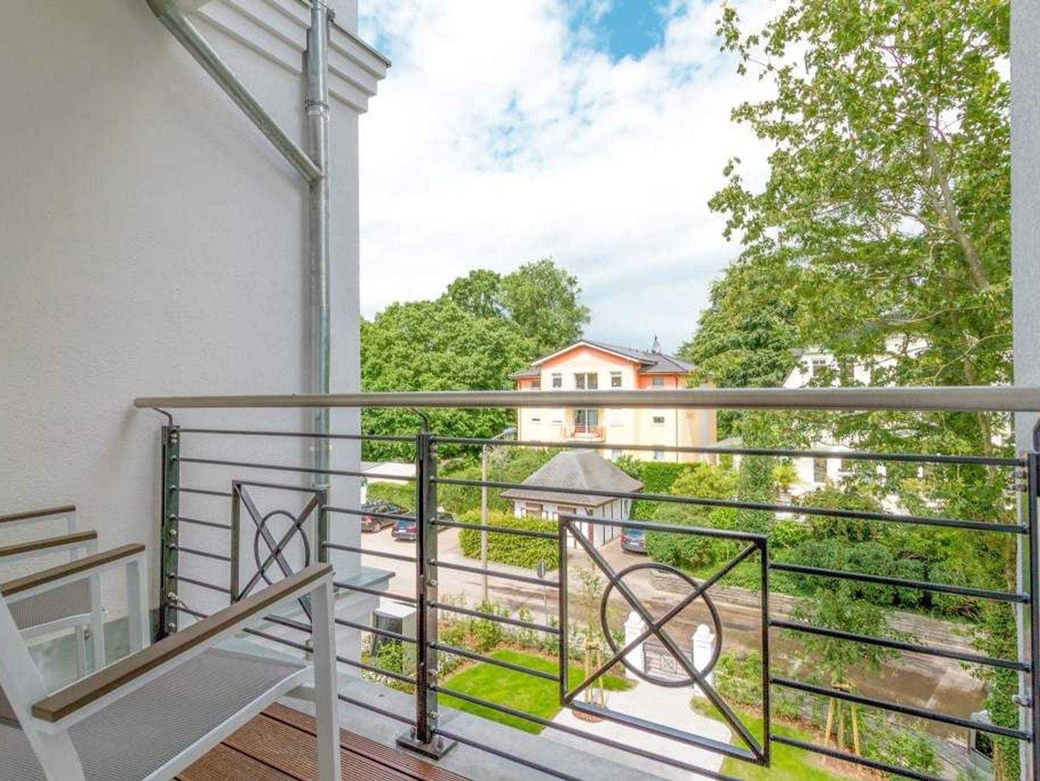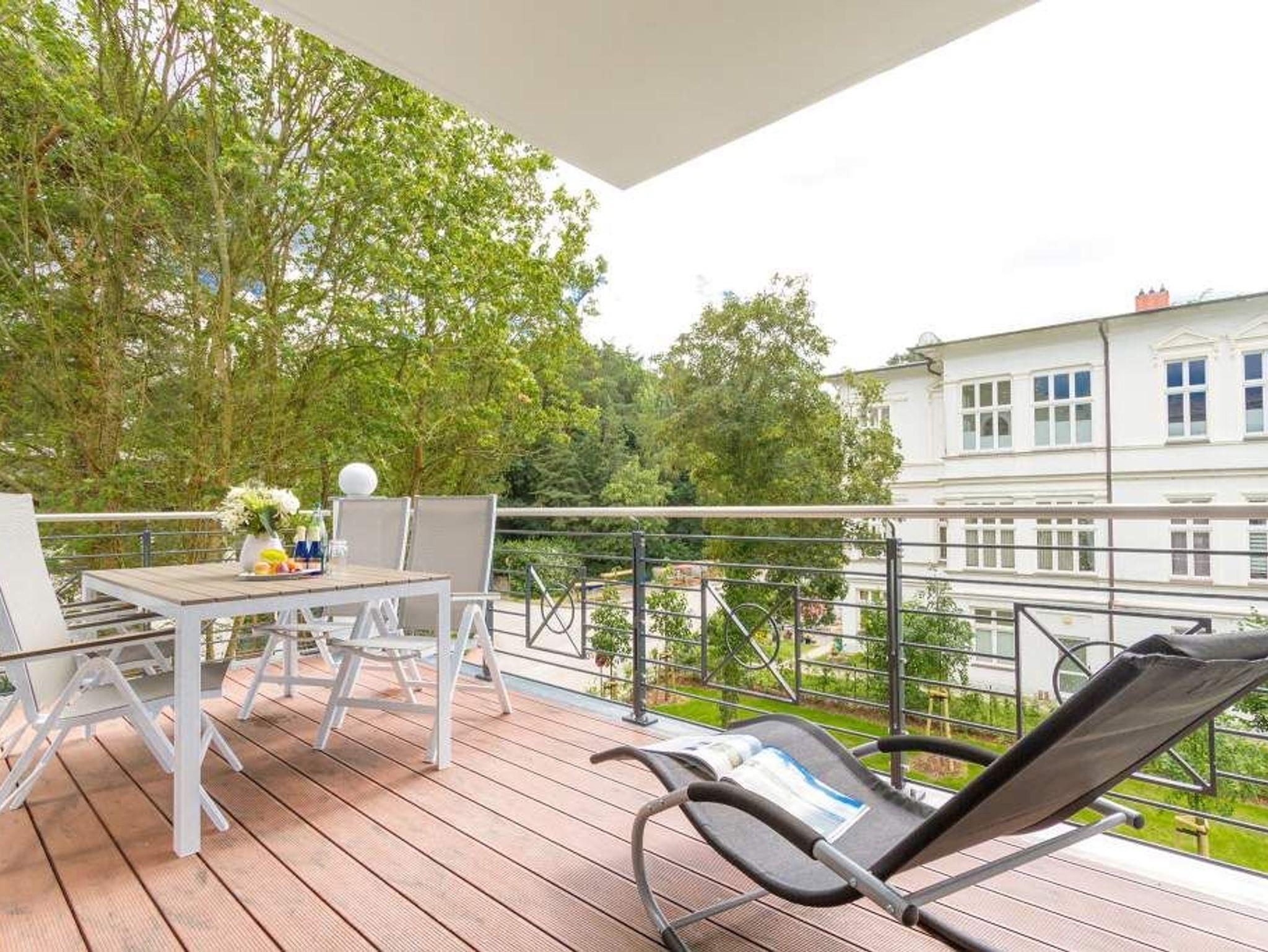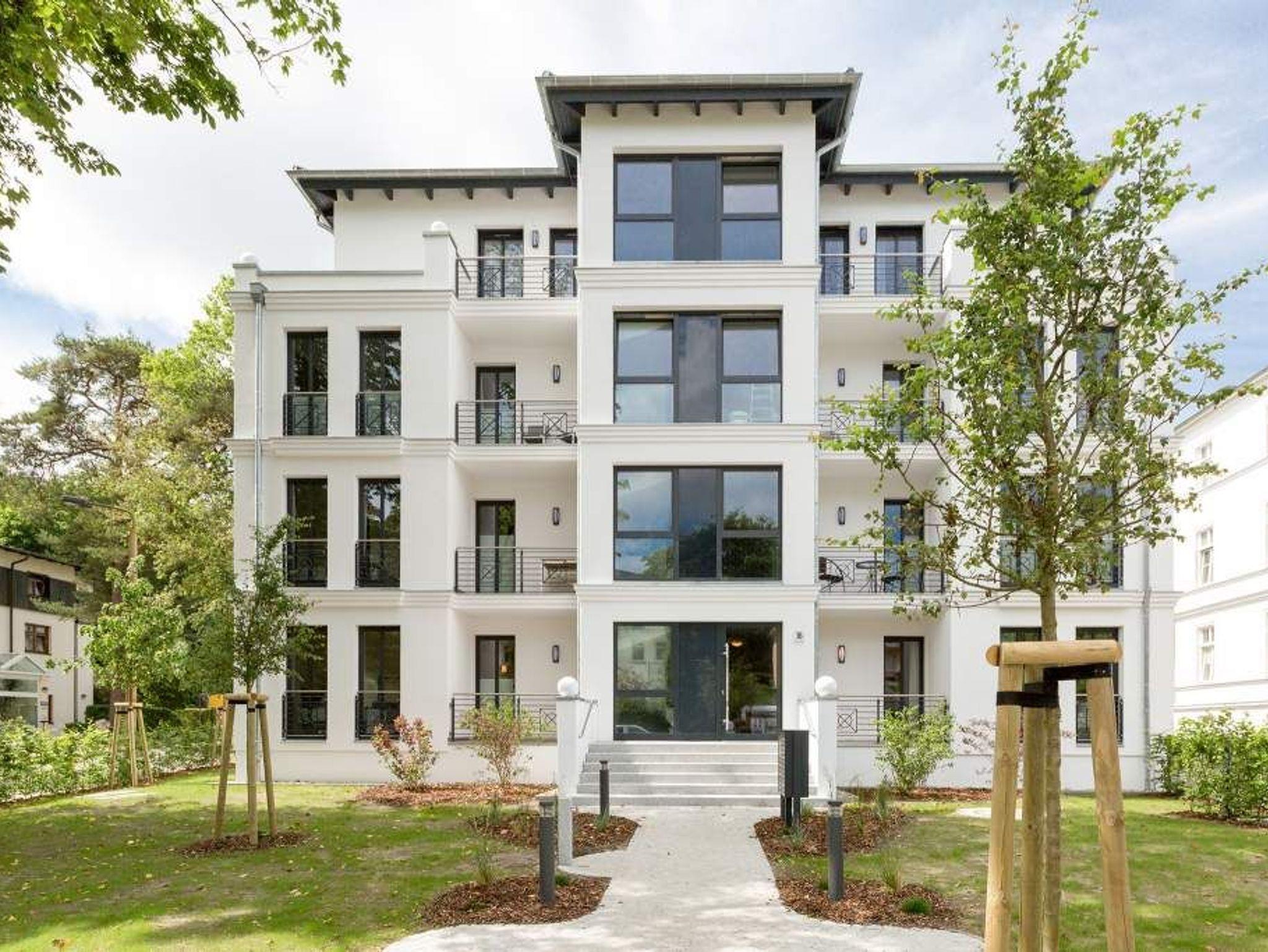 Vogelzwitschern und das sanfte Rauschen der Ostsee: Umgeben von wunderschönen, alten Bäumen atmet die 2017 fertig gestellte Villa Strandgrün das Flair der sie umgebenden Bädervillen. Mit seinen Balkonen und Erkern, die die Fassade untergliedern und auflockern, passt sich das strandnahe (100 Meter) Urlaubsdomizil angenehm in das Bild der aufwendig sanierten Villen um sie herum ein und wirkt selbst wie eine Weiterführung der einst mondänen Architektur des 19. Jahrhunderts. Das stilvolle Äußere setzt sich im exklusiven und eleganten Wohndesign im Inneren fort. Jede Ferienwohnung verfügt über eine Sonnenterrasse oder mehrere Balkone. Besondere Highlights eines jeden Appartements sind der Kamin, eine Sauna und je zwei Bäder bzw. ein zusätzliches Gäste WC. Die großzügigen 3- und 4-Raum-Suiten wurden mit allem Komfort konzipiert und ausgestattet. Vom ASA-Geschirr bis zu den hochwertigen Designmöbeln steht das Wohlfühlen an erster Stelle. In der Tiefgarage gibt es für jedes Appartement einen Stellplatz. Außerdem steht für jede Wohnung ein Briefkasten am Haus zur Verfügung.