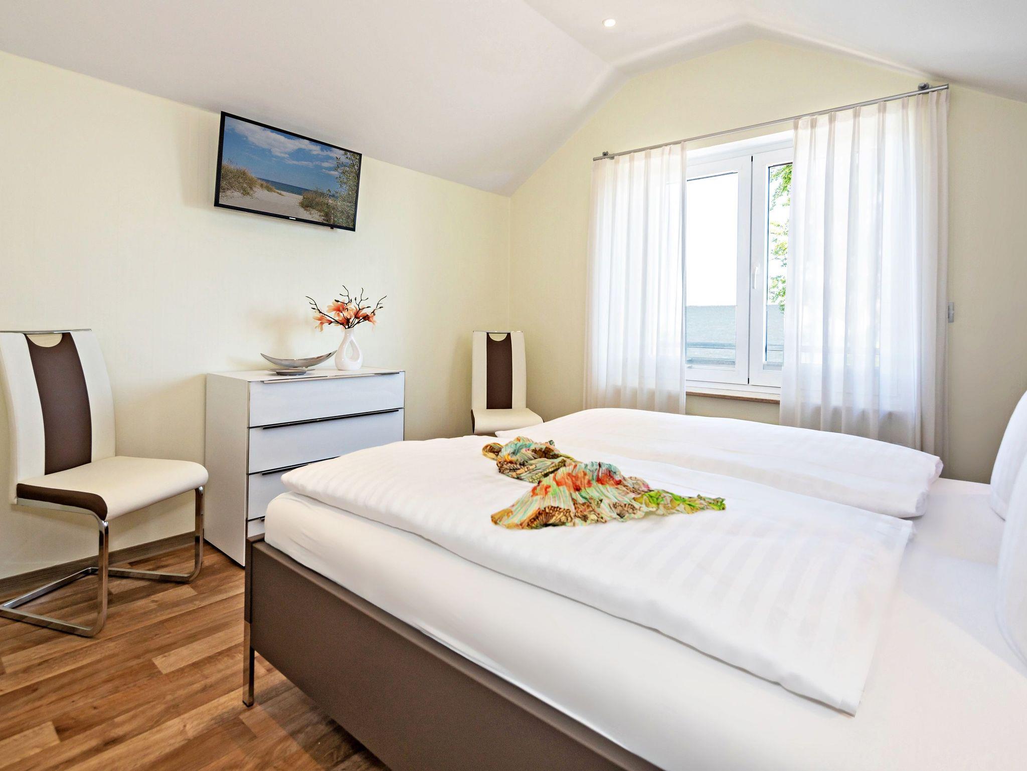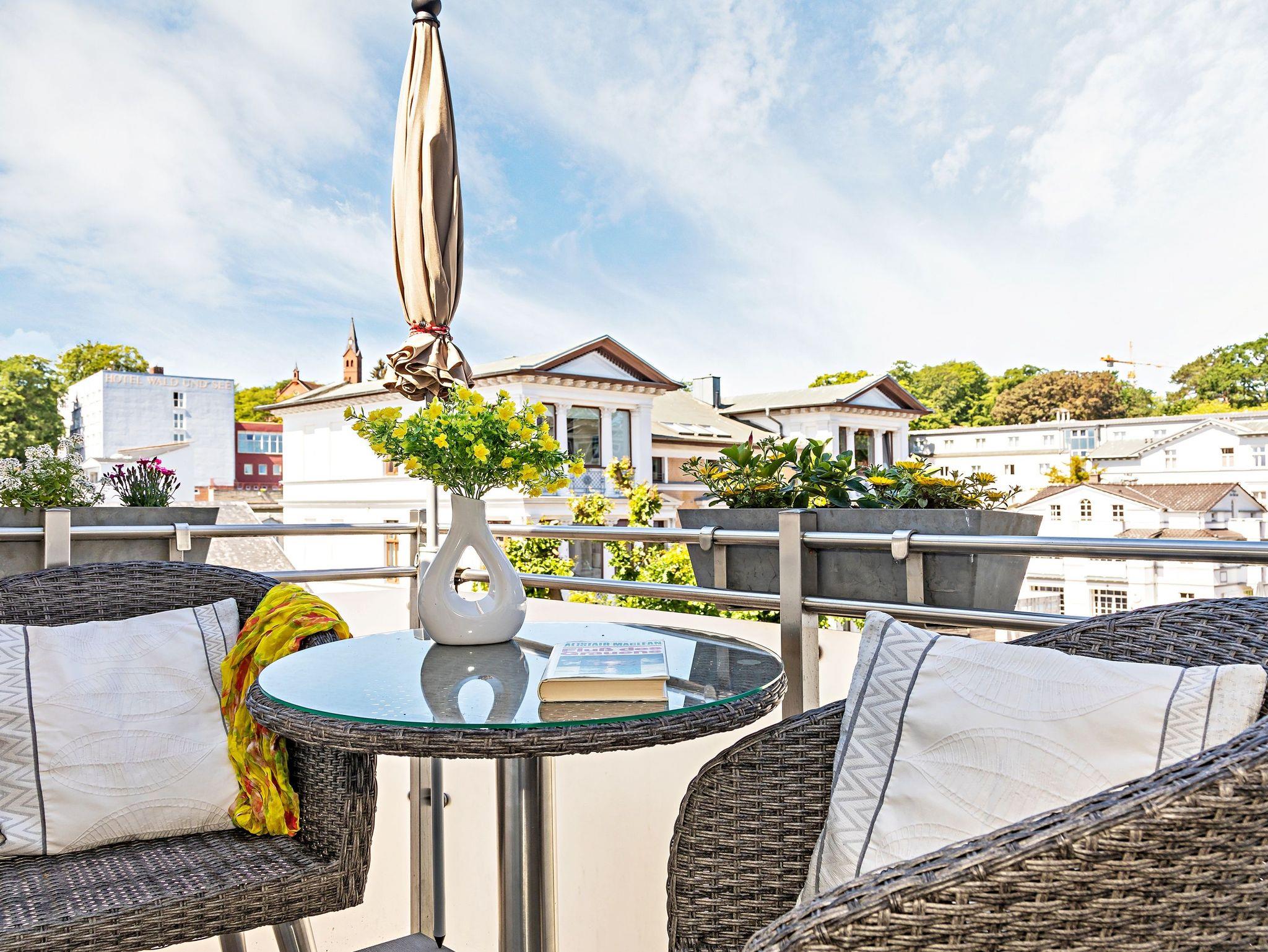 Die komfortable und moderne Ferienwohnung mit ca. 65 qm befindet sich im 1.Obergeschoss des Restaurants & Cafés, welches seit 1938 in Familienbesitz ist und sich direkt im Zentrum von Heringsdorf befindet. Die Wohnung erstreckt sich über 2 Etagen. In der 1. Etage befindet sich ein Schlafzimmer mit einem Einzelbett, Flachbild-TV und unverbautem Meerblick. Die Wohnung verfügt in der 2. Etage über ein zweites Schlafzimmer mit Doppelbett, Flachbild-TV und wiederum unverbautem Meerblick. Das helle gemütliche Wohnzimmer ist mit einer Couch und Flachbild-TV ausgestattet. Von hier aus gelangen Sie auf den Südbalkon mit Blick auf die umliegenden Villen. Die moderne Küche mit Ceranherd, Backofen, Geschirrspüler, Mikrowelle, Kaffeemaschine, Wasserkocher und Toaster lässt keine Wünsche offen. Das helle freundliche Tageslicht-Bad verfügt über DU/WC sowie einen Kosmetikspiegel. Die Wohnung ist mit Außenrollläden versehen. Die Erstausstattung Bettwäsche und Handtücher ist inklusive. Auf Wunsch kann ein Parkplatz vor Ort gegen eine Gebühr von 10,00 € pro Nacht dazugebucht werden.