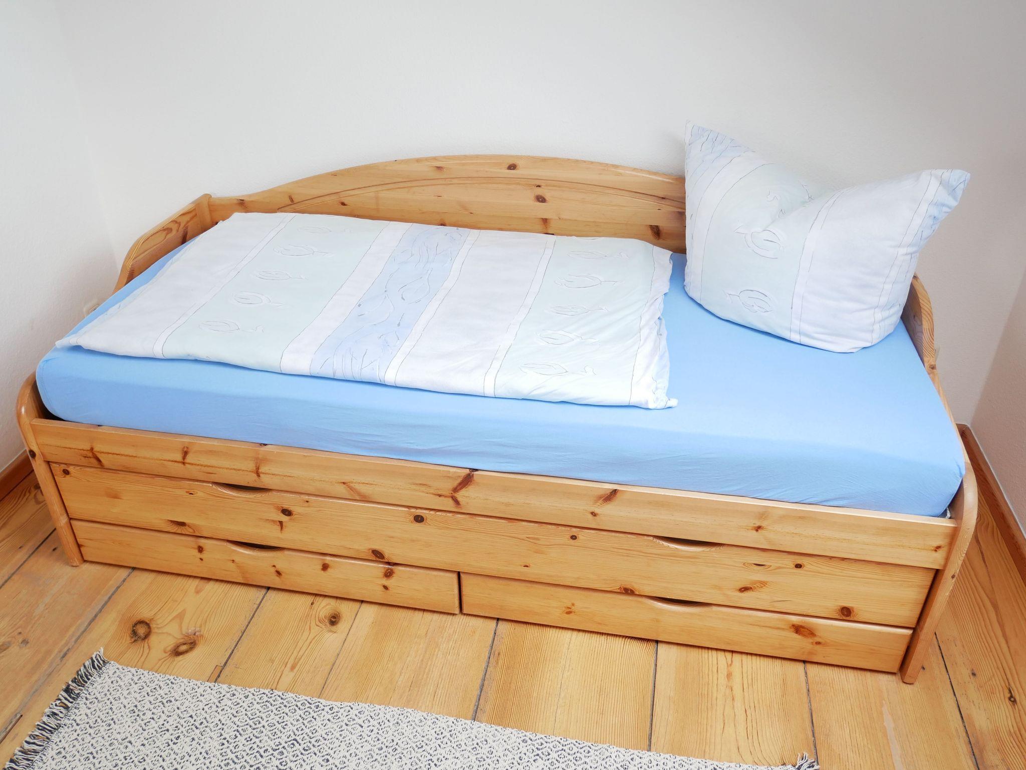 Der 2. Schlafraum ist mit einem ausziehbaren Einzelbett (Bettkasten Rollbett Aufbettung), einem Kleiderschrank und einem Stuhl eingerichtet.