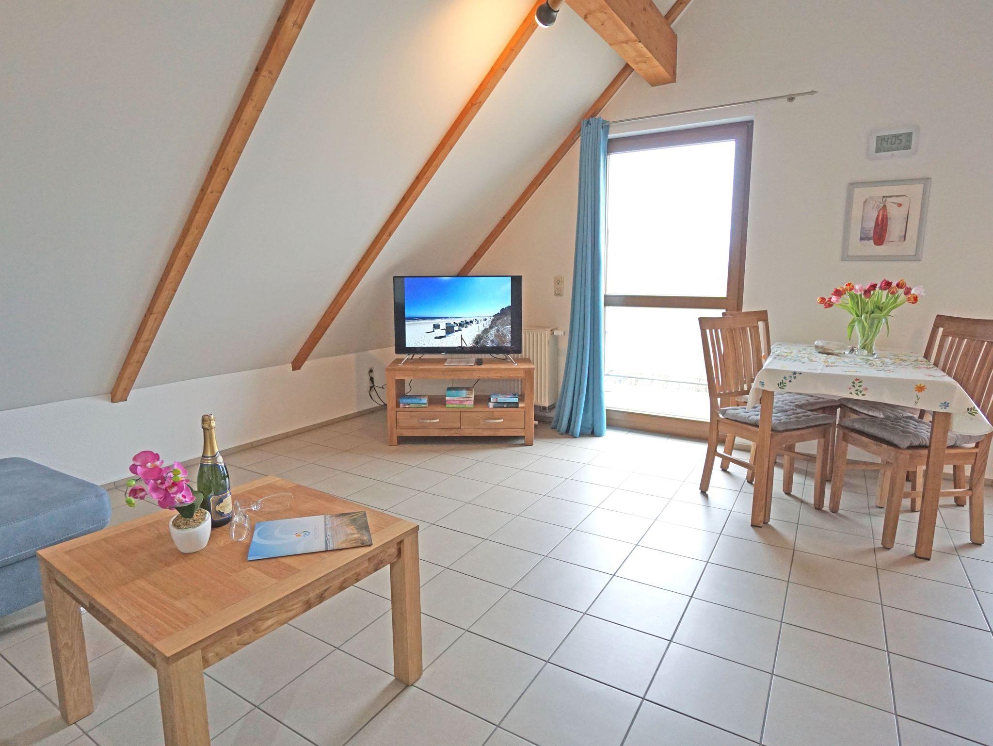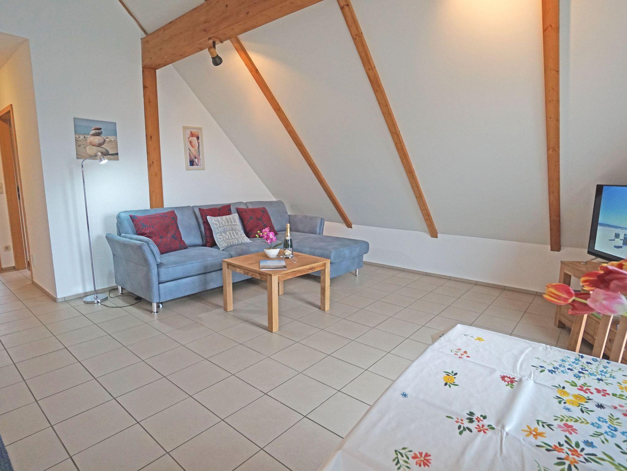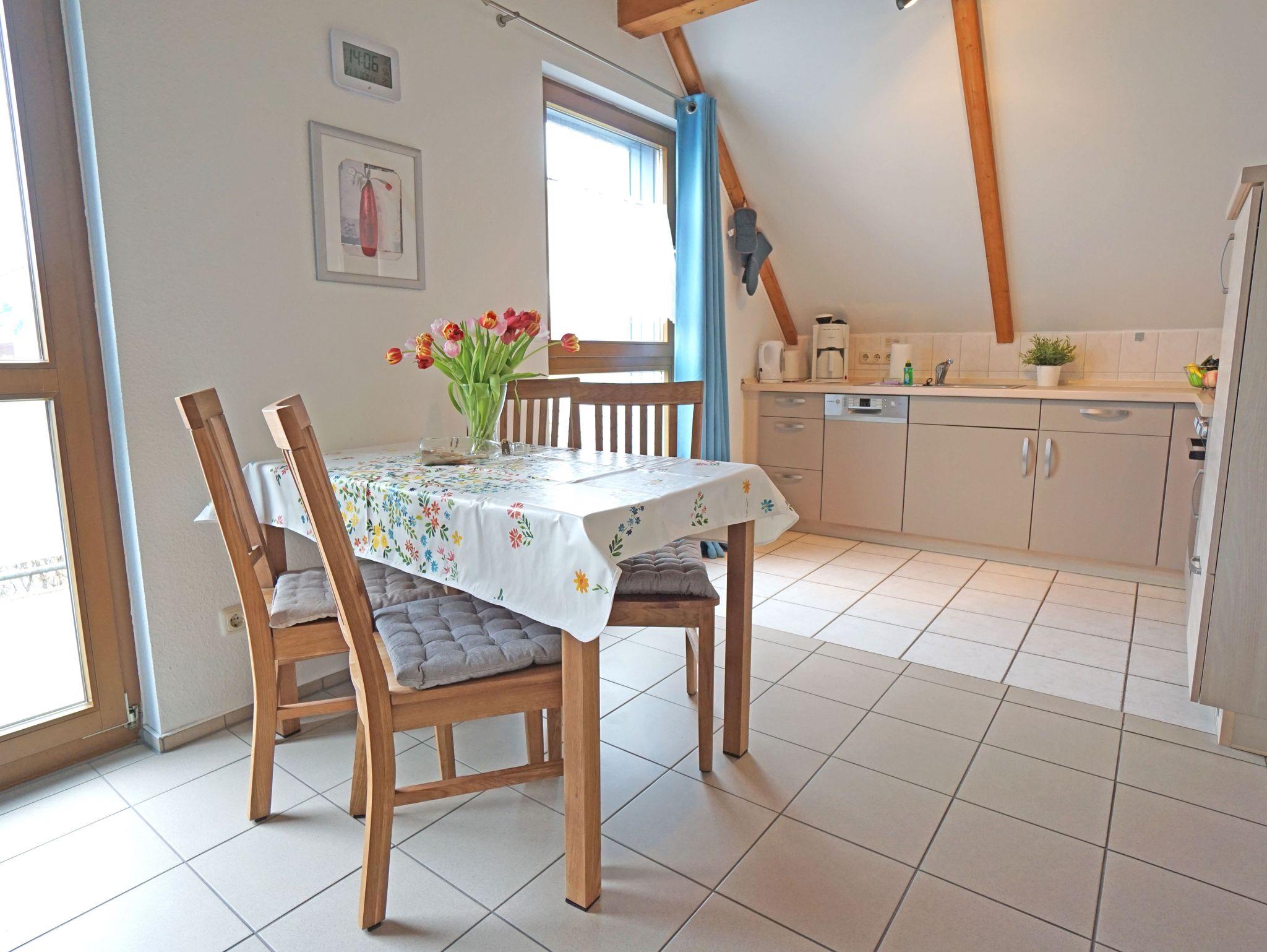 Die Wohnungen im Dachgeschoss bieten Platz für 2 Personen und sind ca. 45 m ² groß. Sie sind aufgeteilt in ein Schlafzimmer, einen Wohnraum mit Einliegerküche, ein komfortables Bad und ein Balkon.