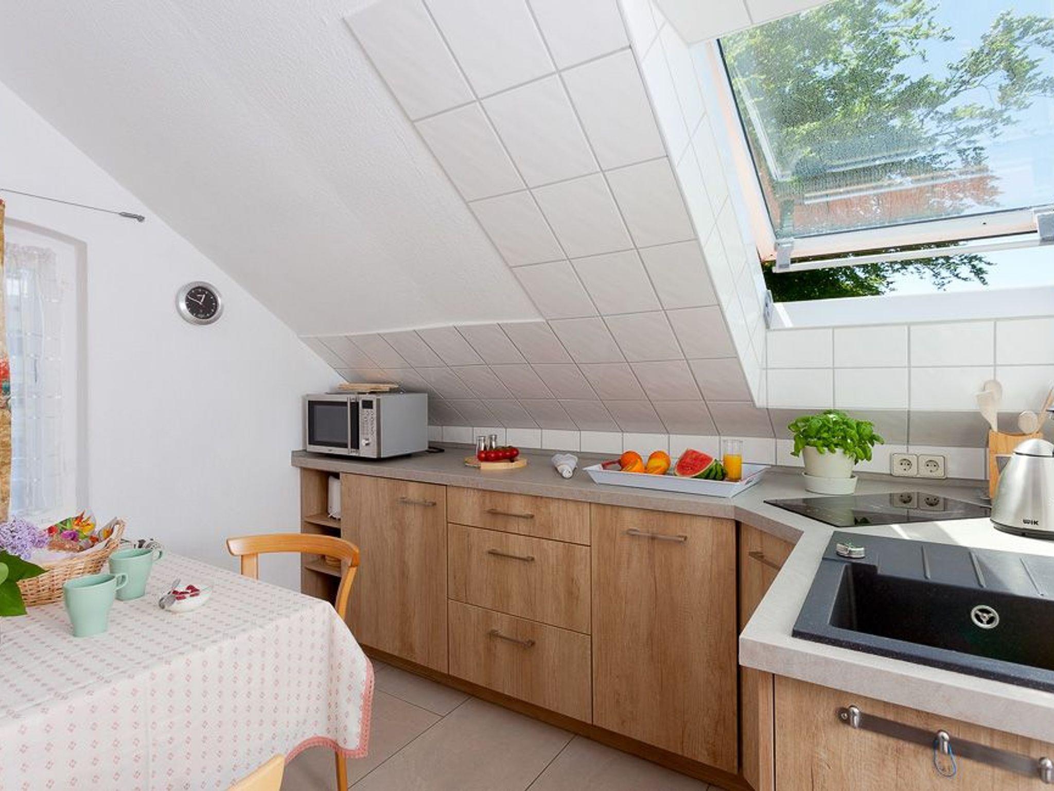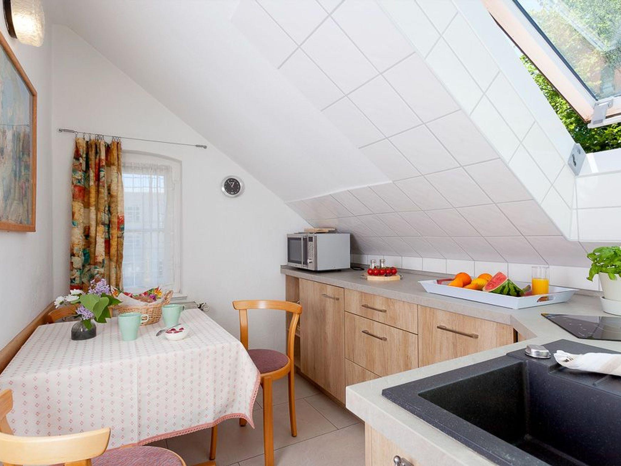 Die separate Küche mit Induktionskochfeld, Mikrowelle mit Grillfunktion, Kühlschrank mit Gefrierfach, Toaster, Wasserkocher, Kaffeemaschine und Geschirrspüler sowie Essplatz für drei Personen unterstreicht die Annehmlichkeiten dieses Appartements.