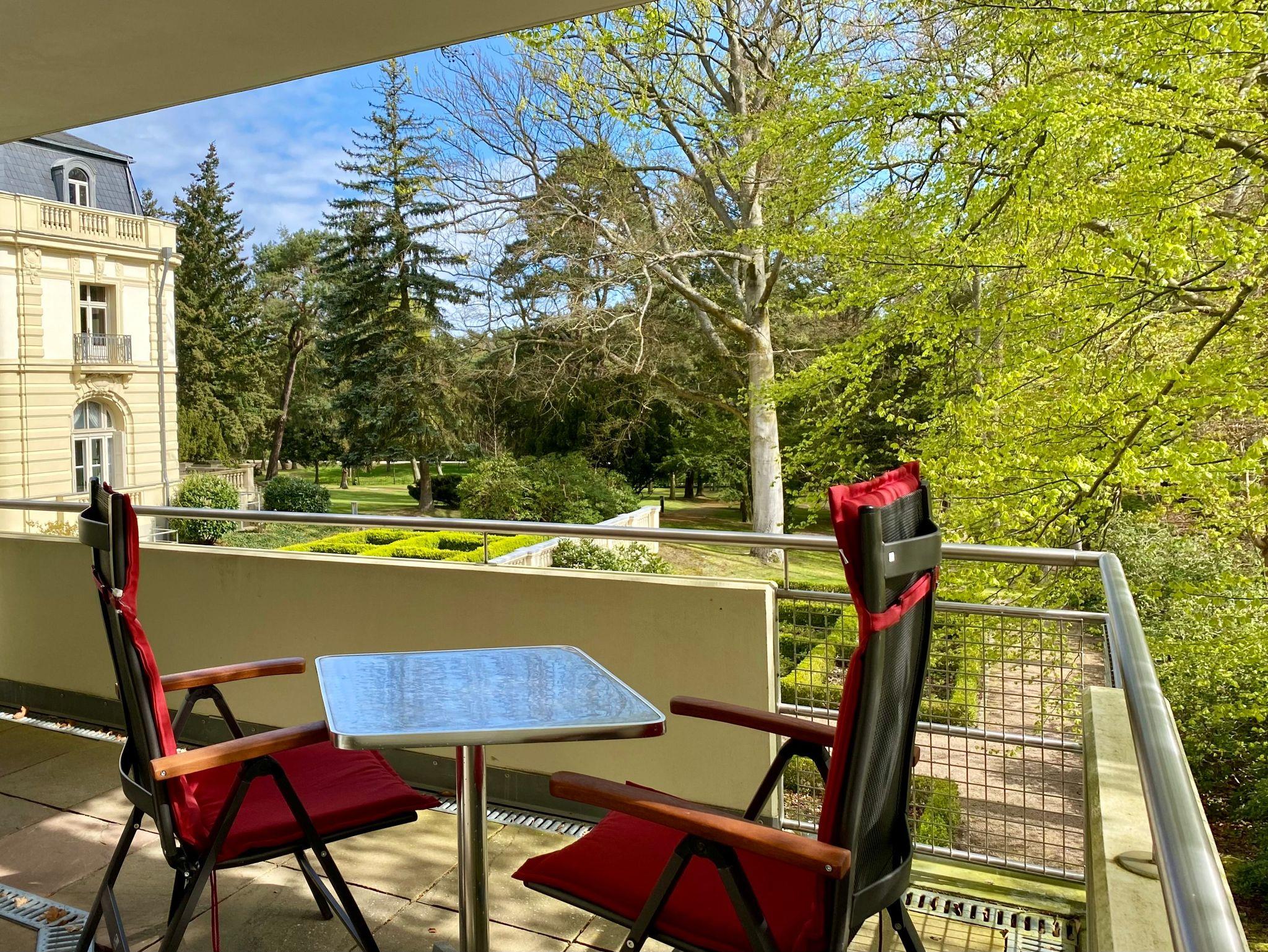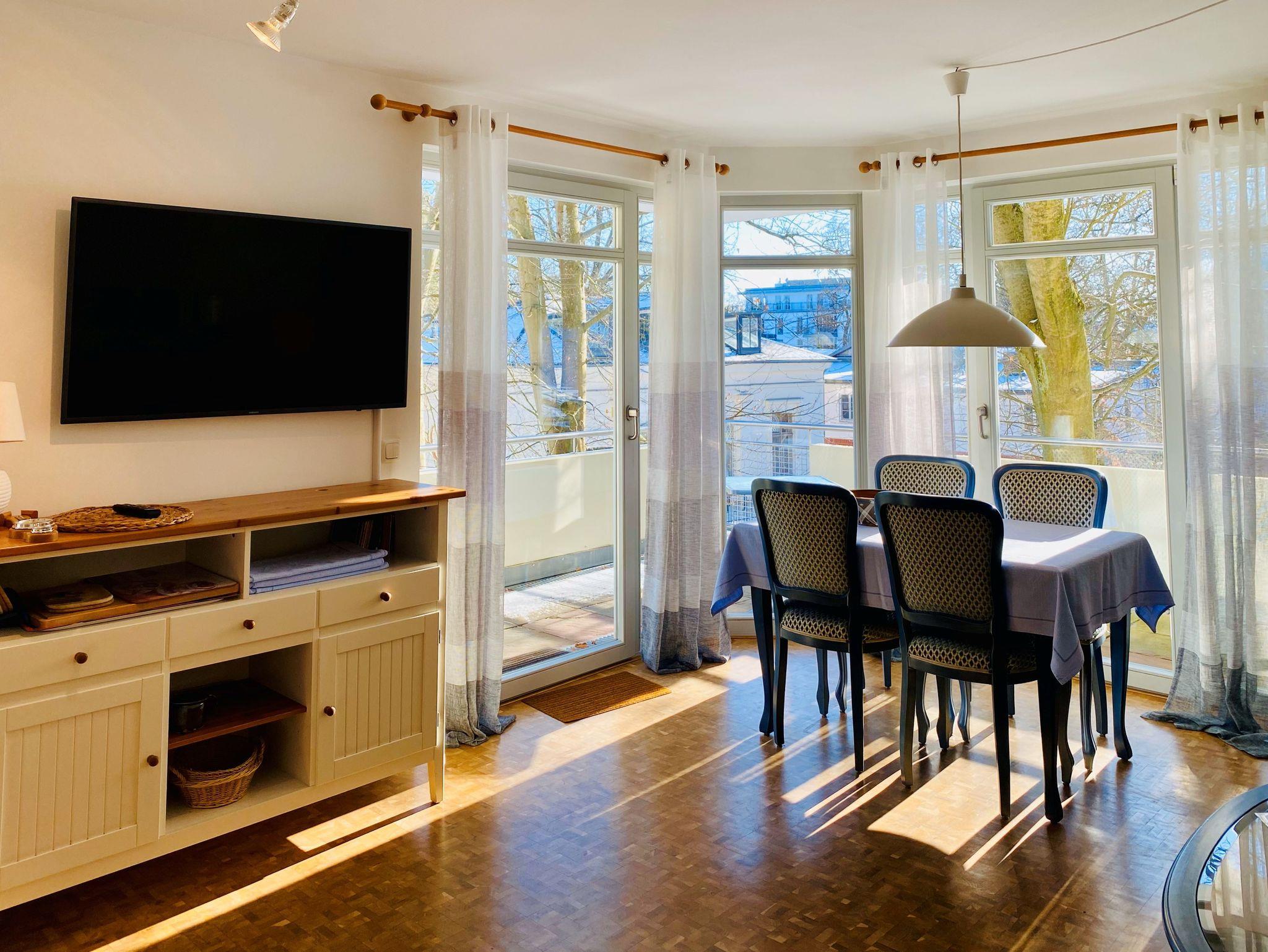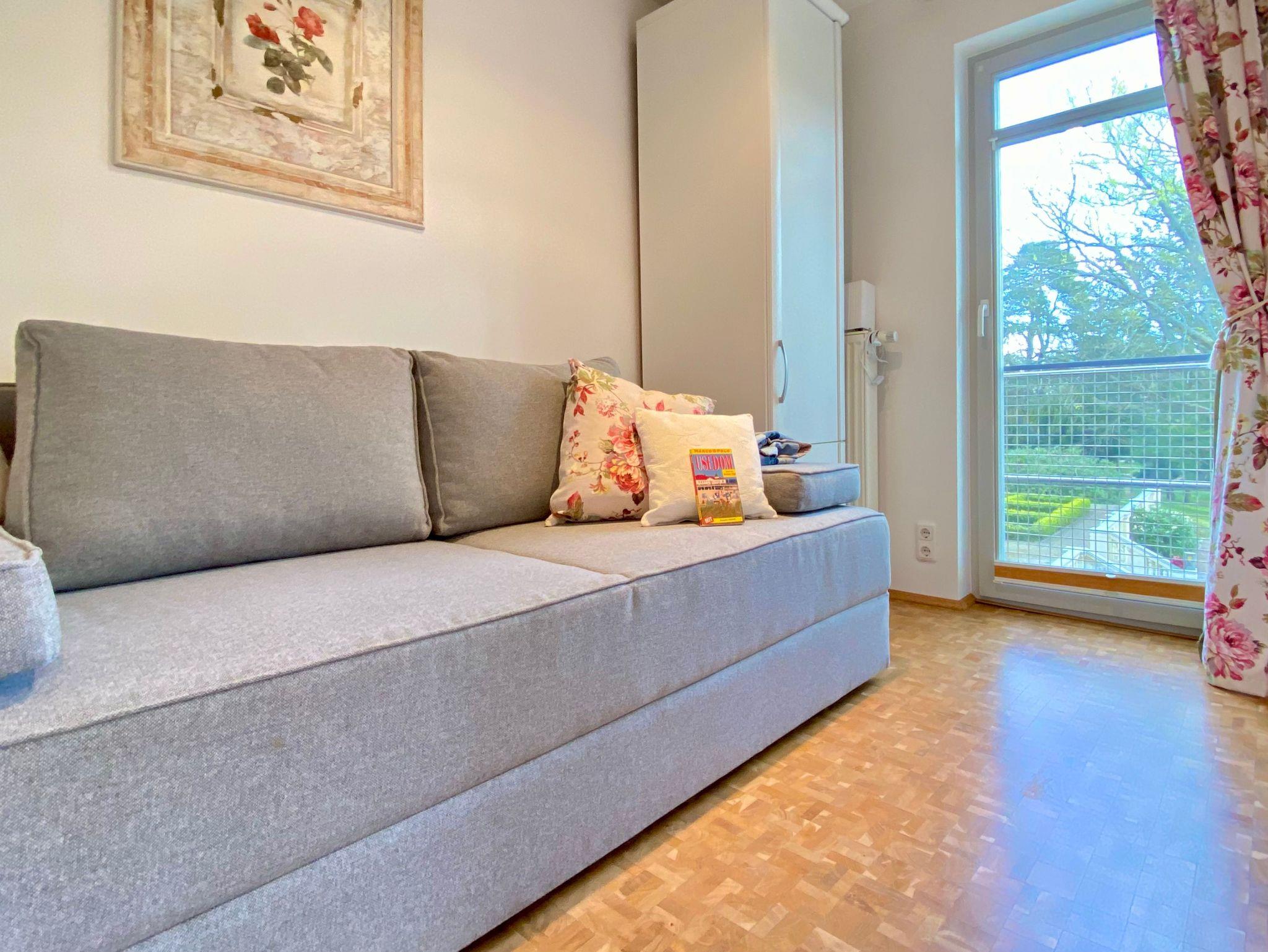 Ferienwohnung 28 ist eine schöne, wohnliche 3-Raumwohnung im 1.OG der Villa Rosengarten und mit Fahrstuhl erreichbar. Das Apartment besteht aus einem kombinierten Wohn- Essraum mit Küchenzeile ( Geschirrspüler, Mikrowelle, Ceranfeld), einem Schlazimmer mit Doppelbett und genügend Stauraum für Ihre Kleidung, einem kleinen Schlafzimmer mit 160er Schlafcouch und einem Bad mit Dusche. Die Wohnung hat zwei moderne Flachbildfernseher (Kabel-TV) sowie jede Menge Bücher, Spiele, CDs. Zu ihr gehört auch ein überdachter Balkon mit Möbeln, von dem Sie den Blick in den Park und Rosengarten genießen können.