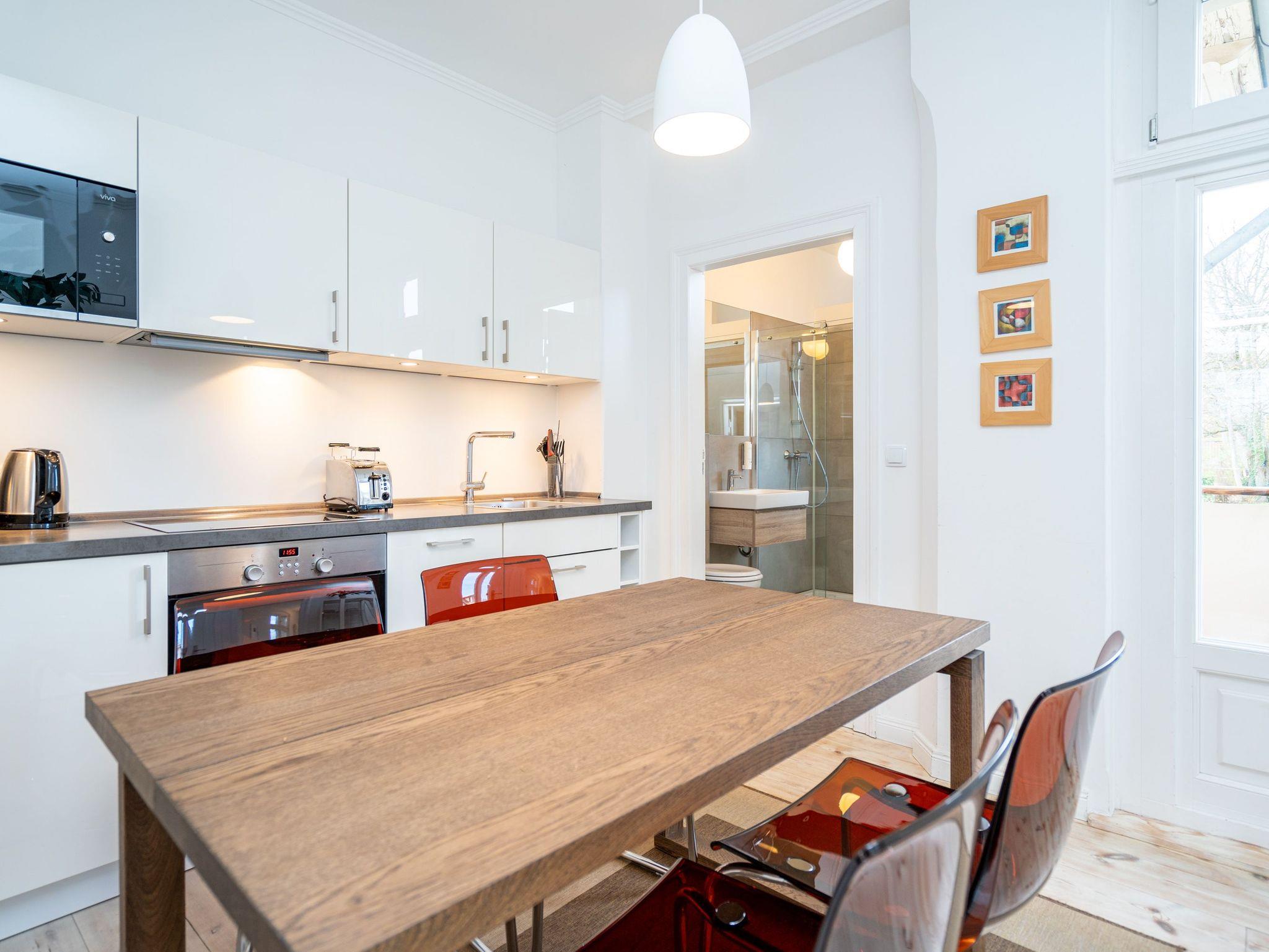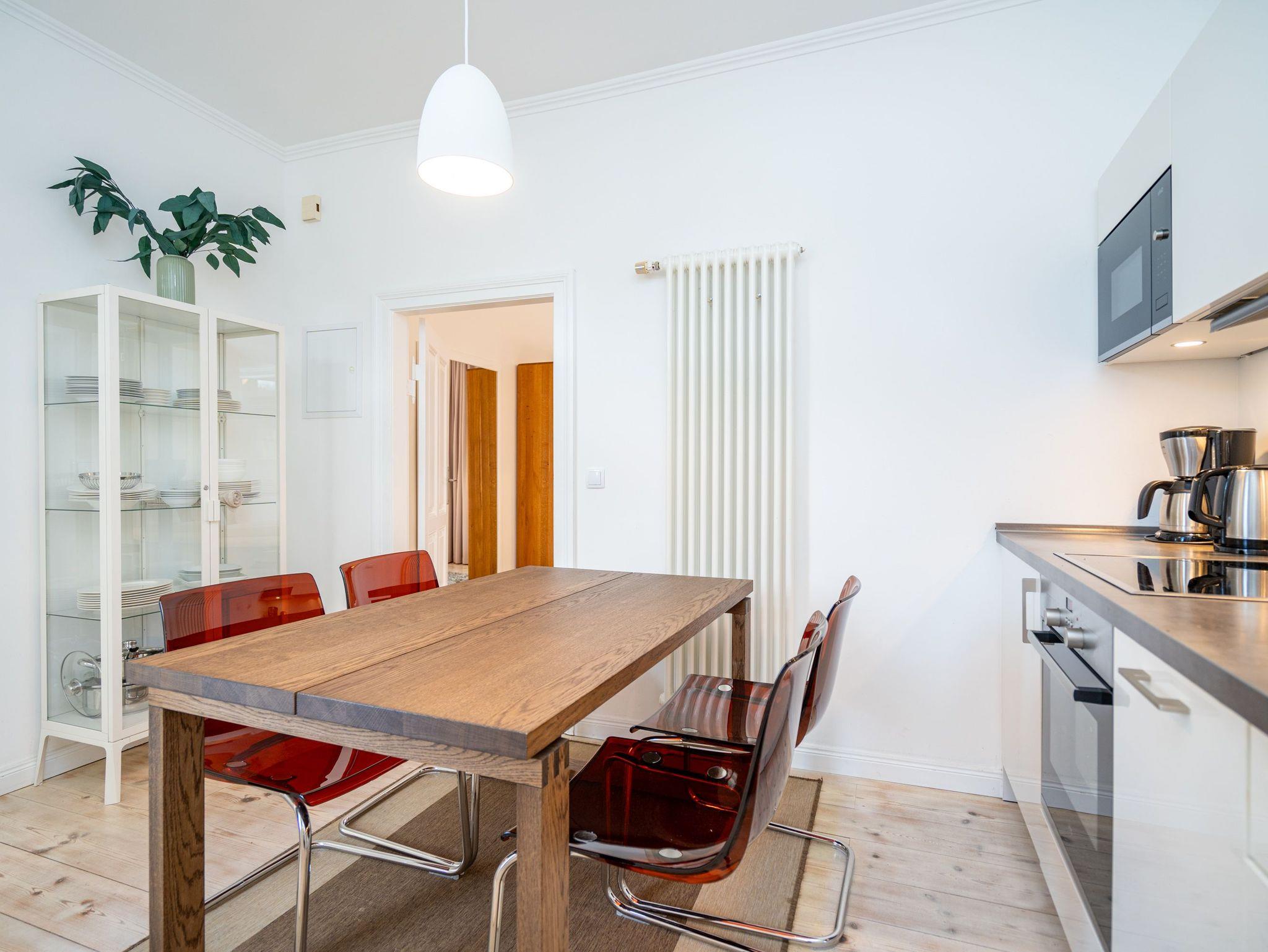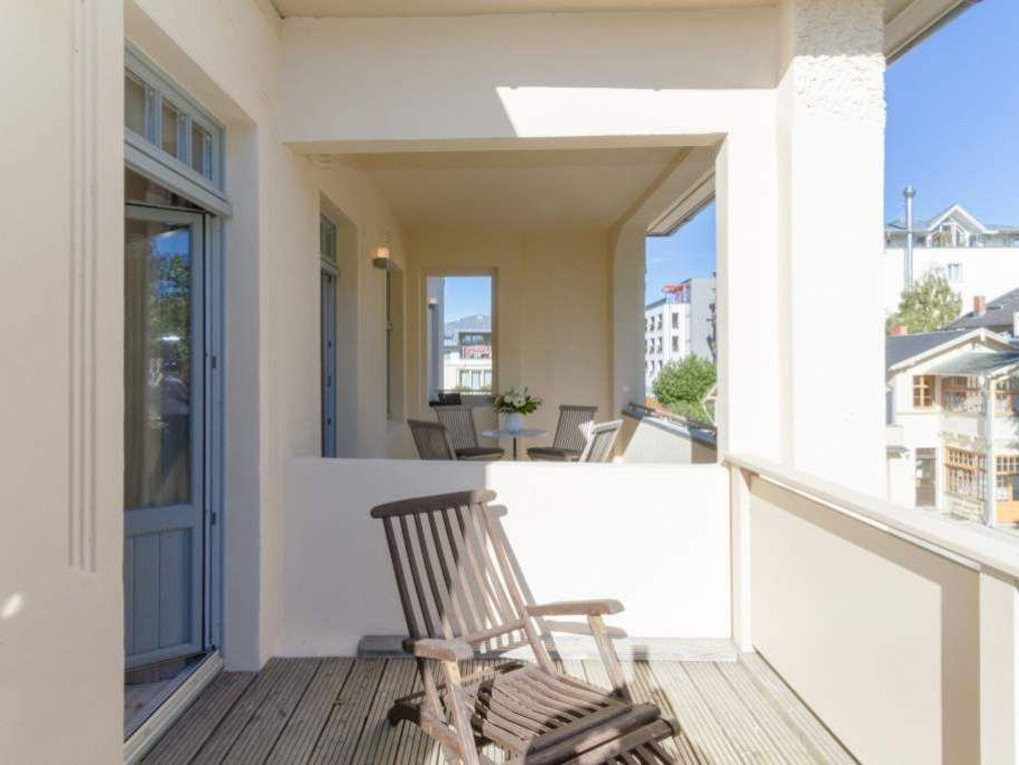 Moderner Lifestyle vom Feinsten: Erfrischend, pur, clean und entspannt macht das Interieur-Design dieses Ferienparadieses Freude und gibt ihm das gewisse Etwas. Hell und licht und mit viel Weiß lädt das Appartement 2 im Obergeschoss der Villa Diehl zum Ausspannen und Wohlfühlen ein. Bis zu 4 Personen haben in den großzügig geschnittenen 102 Quadratmetern dieser Wohnung jede Menge Platz. Ein wunderschöner Wohnbereich mit weiß gekälktem Echtholzdielenboden, flauschigem Hochflorteppich, einer stylischen Design-Sitzgruppe aus Sofa und Sesseln, dem gemütlichen Gas-Kamin und großem Flat-TV mit Blue-Ray-Player machen die Auszeit zu etwas Besonderem. Von hier aus geht es auf die sonnenüberflutete, offene Loggia mit Blick auf die begrünte Anlage hinaus. Lässt es sich schöner frühstücken als hier, wo die Ostsee sanft ins Ohr rauscht? Auch die beiden Schlafzimmer mit bequemen Doppelboxspringbetten und großen Schränken haben jeweils eigene Balkone. Die Küche ist mit hochwertigen Geräten voll ausgestattet. Nehmen Sie Platz am großen Esstisch und lassen Sie es sich schmecken. Highlight des geräumigen Badezimmers ist neben Waschtisch, WC und Echtglas-Dusche die kleine Infrarot-Sauna für zwei Personen. Hier wird es an kühlen Tagen und Abenden so richtig muschelig warm. Zur Wohnung gehört ein separates Gäste-WC. Damit Sie sich in Ihrem Urlaub wirklich um nichts kümmern müssen, liegen Handtücher für Sie bereit und die Betten sind bezogen. Sie haben im Appartement einen kostenfreien WLAN-Zugang. Auf dem Hof ist ein Pkw-Stellplatz für Sie reserviert.