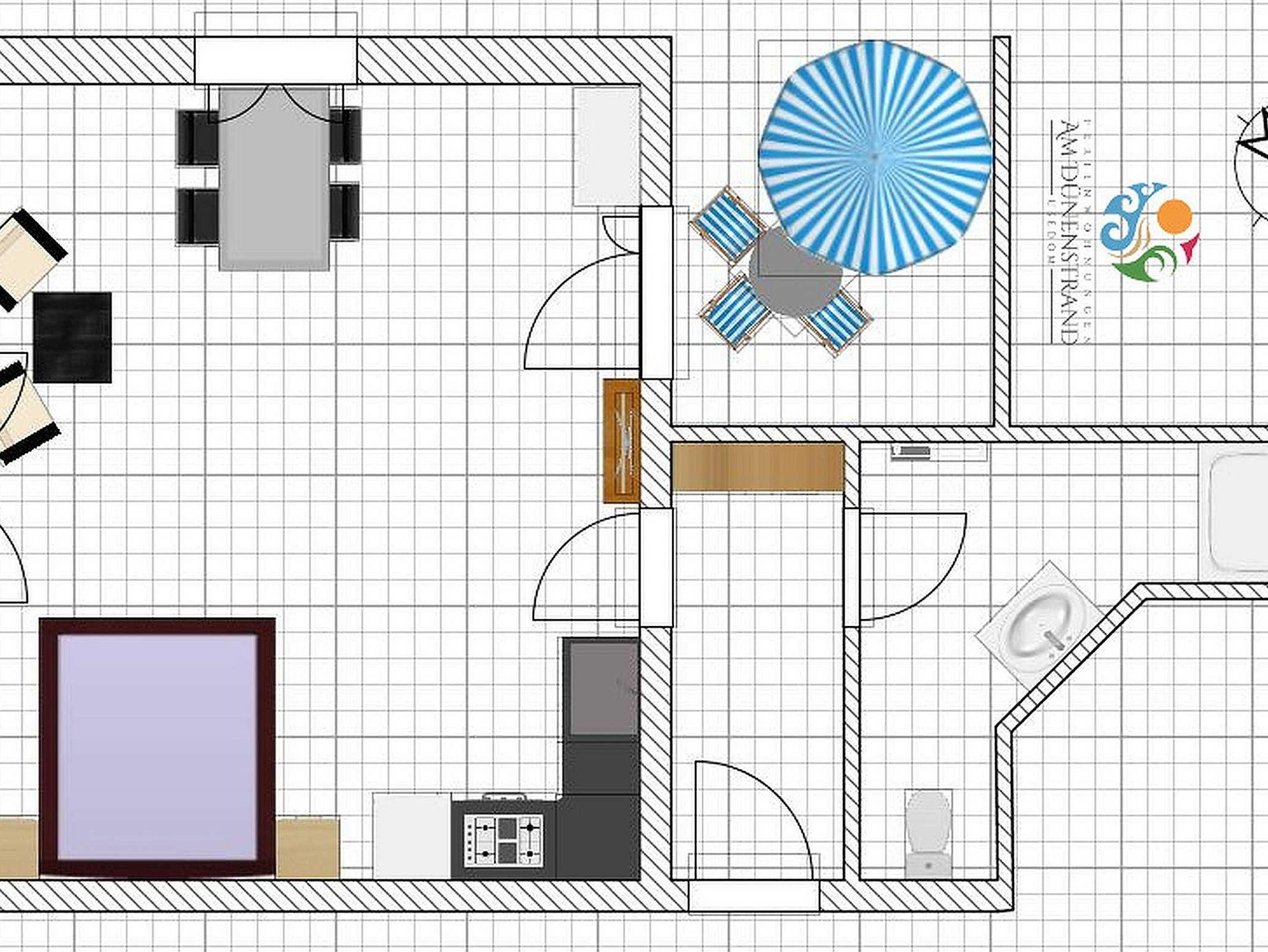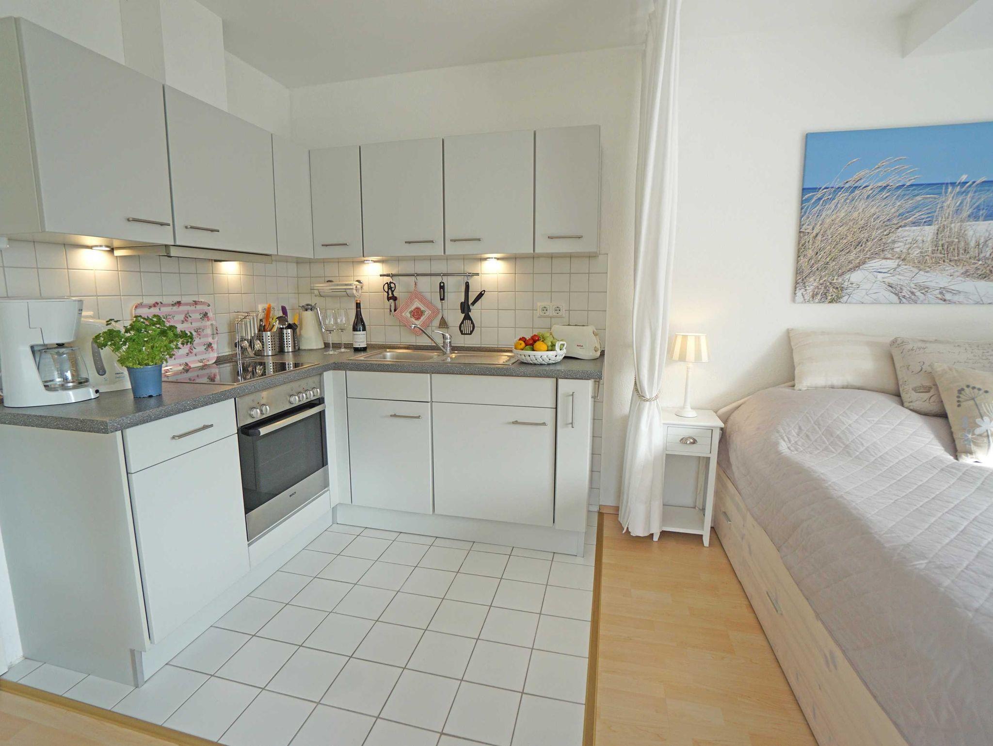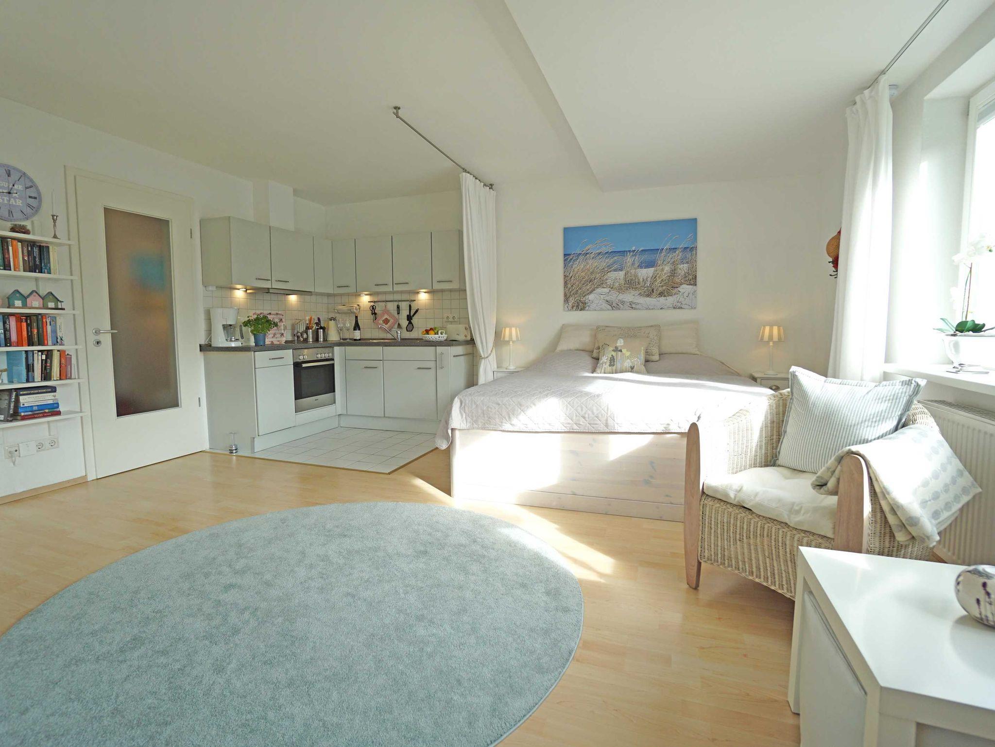 Die komfortable 1-Zimmerwohnung im Dachgeschoss (2.Etage) des Hauses ist 40 qm groß und bietet zwei Personen Platz. Die Wohnung verfügt über ein komplettes Wohnzimmer mit Esstisch, Radio, Smart-TV, einem Doppelbett mit Komforthöhe (1,80 m Liegefläche), sowie eine komplett ausgestattete Küchenzeile mit Geschirrspüler, Herd mit Ceranfeld. usw. und eine sonnige Loggia in Südlage mit münzbetriebenem Heizstrahler und Gartenmöbeln.