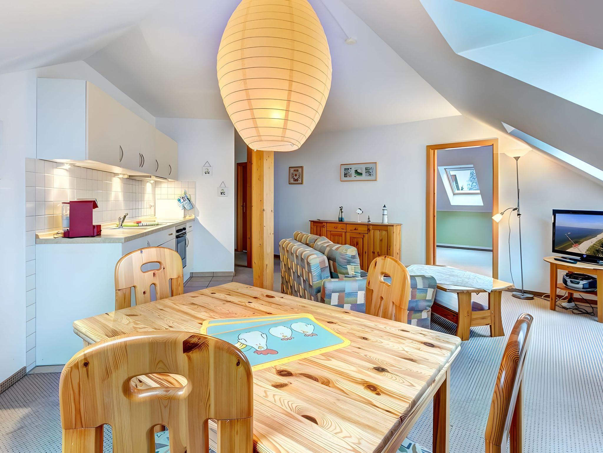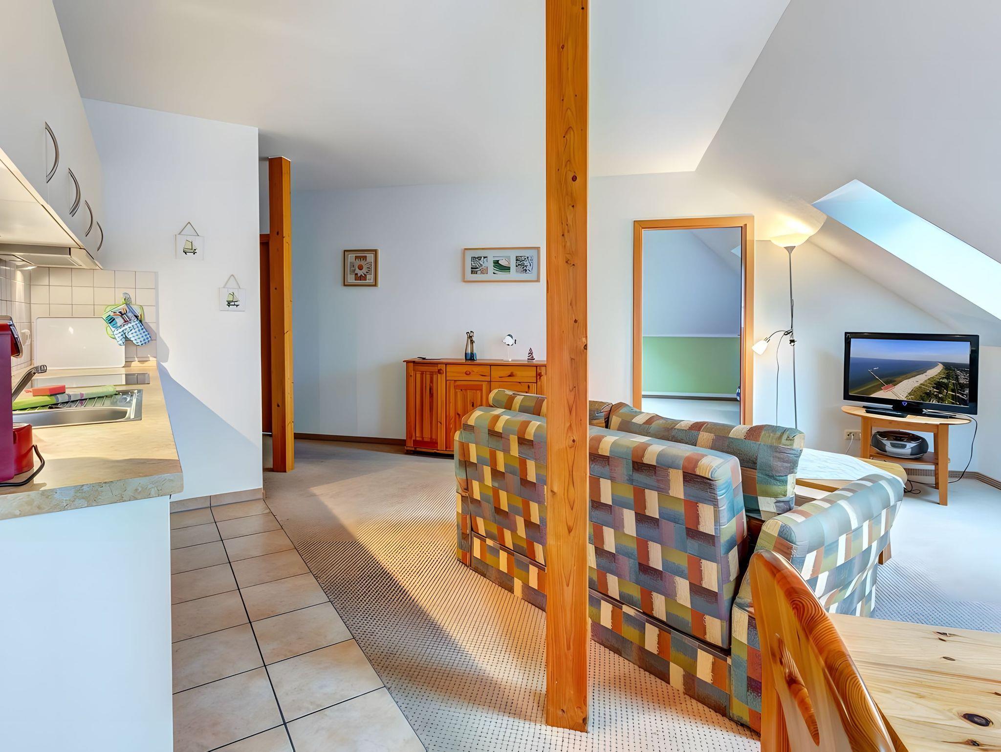 Der Wohn-/ Essbereich ist mit einem Tisch, einer gemütlichen Schlafcouch, natürlich auch mit einem Flachbild-TV ausgestattet. Die gut ausgestattete offene Küche bietet Ihnen alle Annehmlichkeiten vom Elektroherd, über eine Kaffeemaschine bis hin zum Kühlschrank.