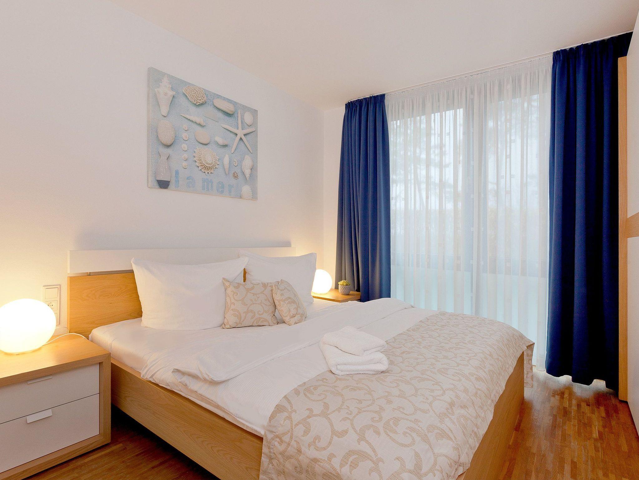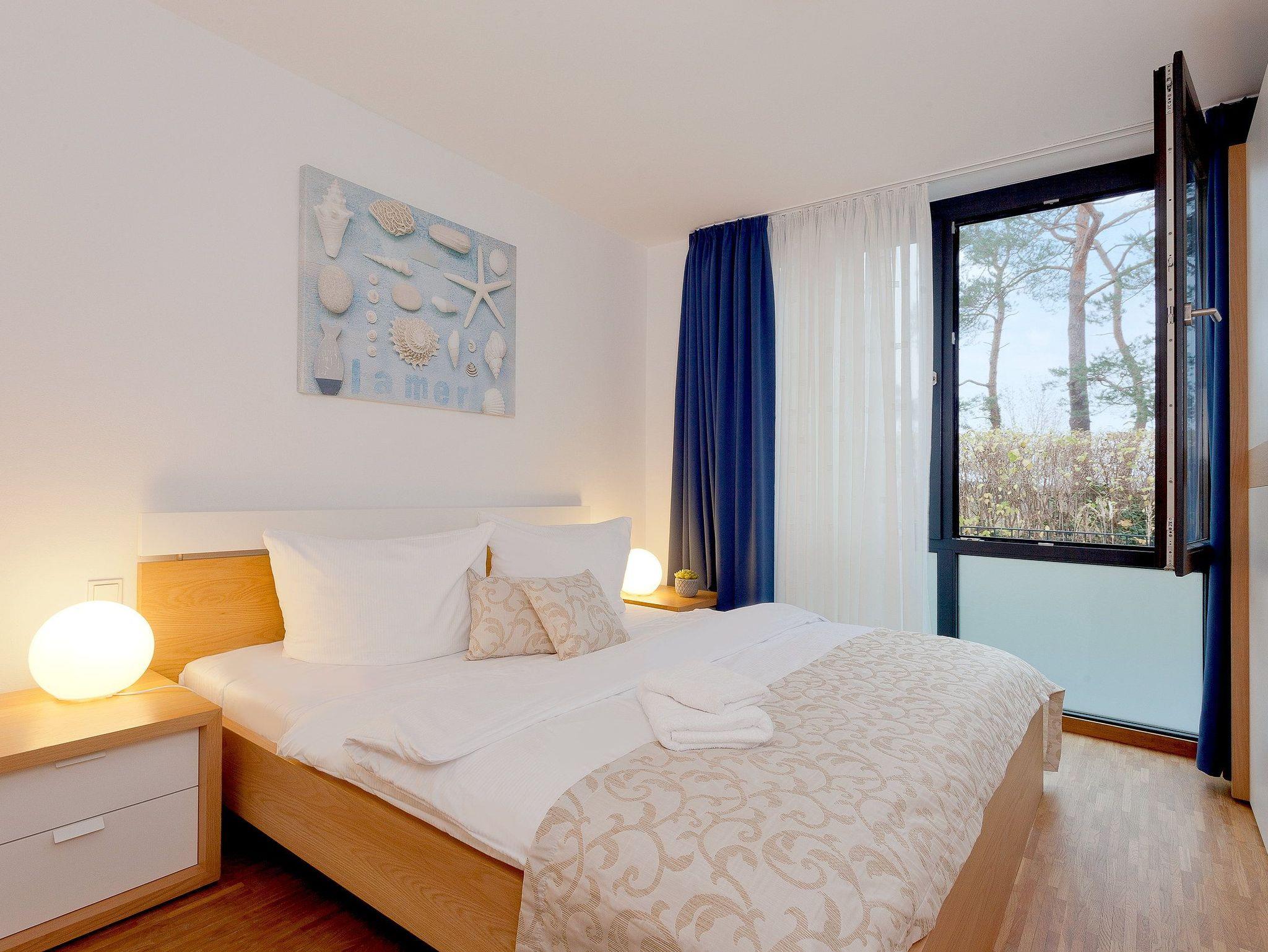 Über eine Treppe gelangen Sie in die obere Etage der Wohnung. Von der Galerie haben Sie Zugang zu den beiden Schlafzimmern, dem Badezimmer und dem Balkon. Das erste Schlafzimmer ist freundlich eingerichetet und mit einem bequemen Doppelbett (180 x 200cm / zwei getrennte Matratzen) und verdunkelnden Gardinen ausgestattet. Für zwei weitere Urlaubsgäste stehen im zweiten Schlafzimmer zwei Einzelbetten (je 90x200cm) für eine erholsame Nachtruhe und einen guten Start in den neuen Urlaubstag bereit.