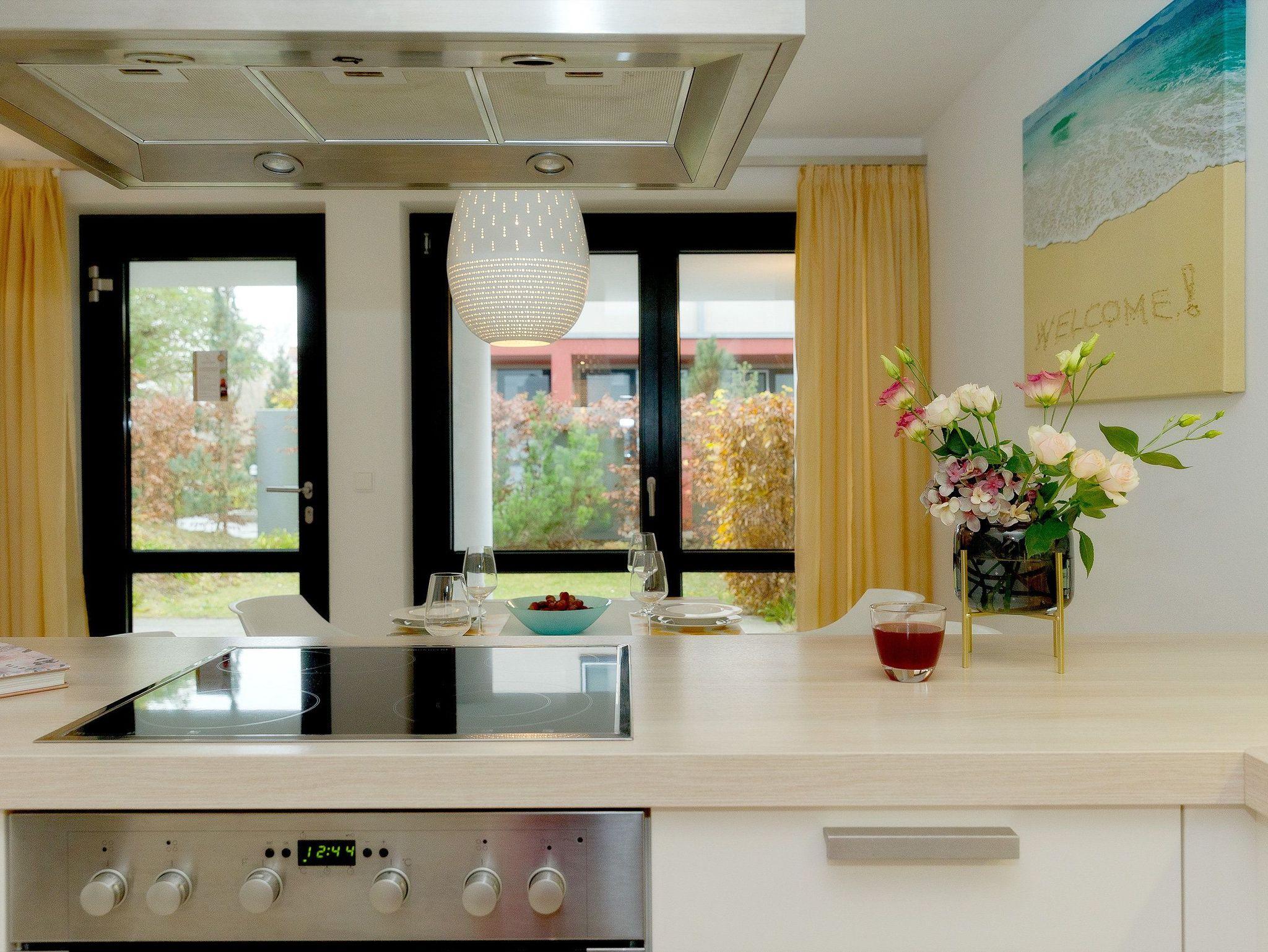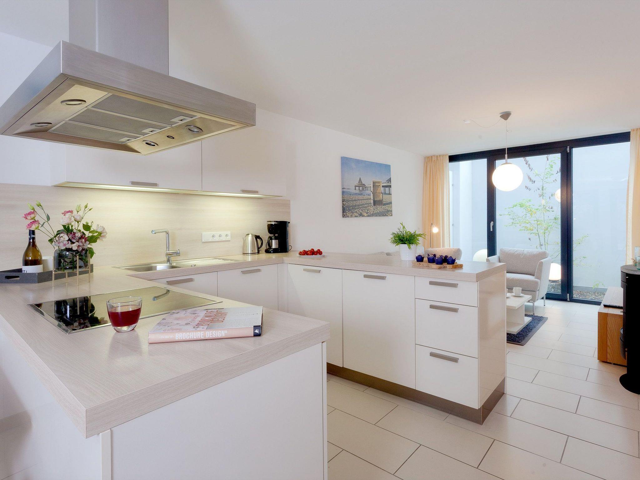 Der stilvolle Wohnbereich verfügt über ein komfortables Sofa und einen Sessel. Die hochwertige Ausstattung mit Bio-Ethanol-Kamin und Flat TV sorgt nicht nur in der ungemütlichen Jahreszeit für behagliche Stunden nach einem erholsamen Strandspaziergang. Im Erdgeschoss befindet sich zudem die moderne Einbauküche, die für die Zubereitung Ihrer Lieblingsspeisen rundum ausgestattet ist (inkl. Ceranfeld, Backofen, Kühlschrank mit Gefrierfach, Geschirrspüler, Wasserkocher, Toaster und Kaffeemaschine). An dem großzügigem Essplatz kann die ganze Familie in geselliger Runde die zubereiteten Speisen genießen. Vom Wohnzimmer erreichen Sie Ihre private Südterrasse, die zum Sonnenbaden oder zur abendlichen Spielrunde mit Blick ins Grüne einlädt.