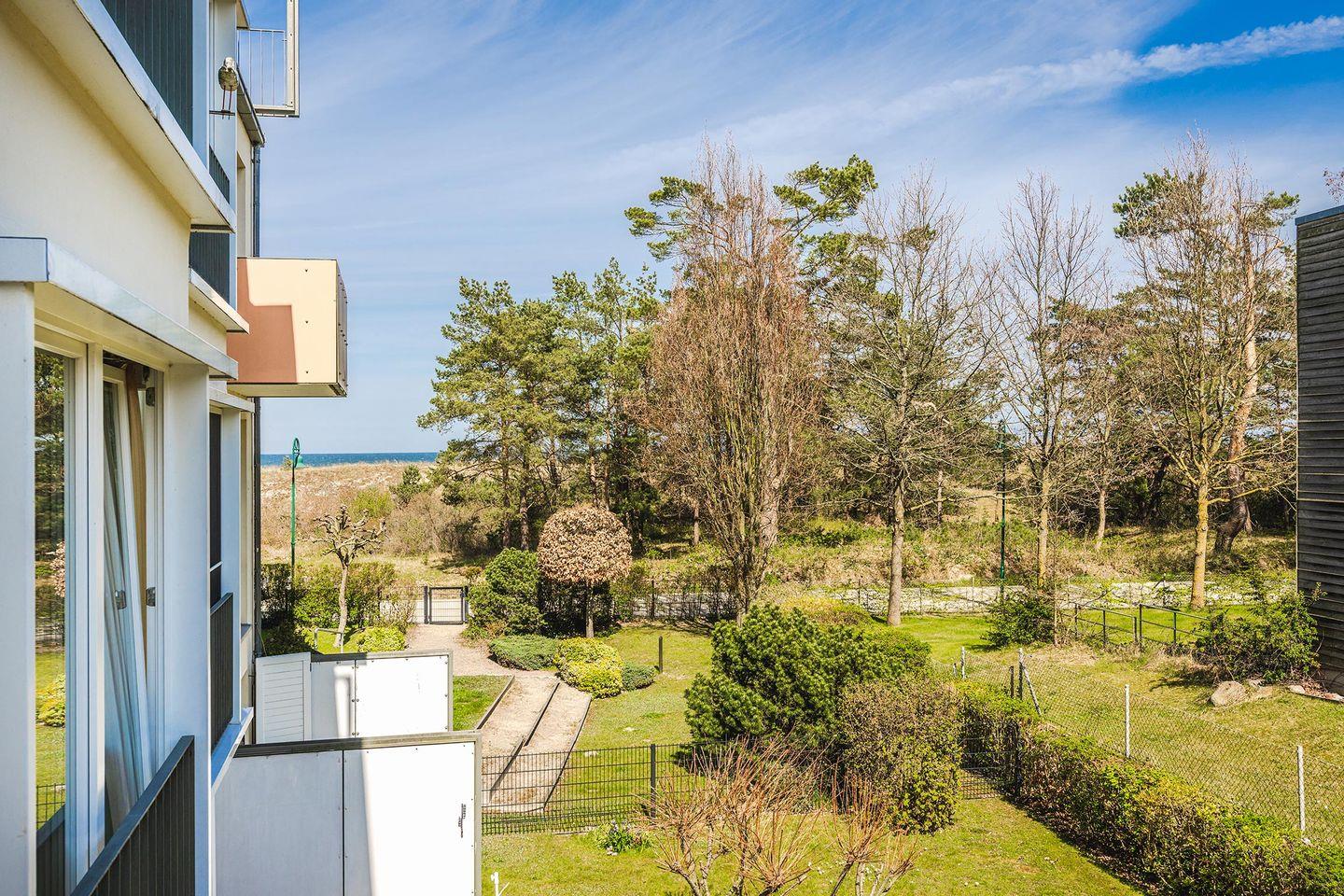 Von hier aus gelangen Sie auf die sonnige Terrasse mit südöstlicher Ausrichtung, die mit Gartenmöbeln und Sonnenschirm ausgestattet ist und sich ideal für das Frühstück im Freien oder entspannte Stunden an der frischen Ostseeluft eignet. Über eine stilvolle Holz-Schwebetreppe erreichen Sie die obere Wohnebene. Dort erwartet Sie das Schlafzimmer mit komfortablem Boxspring-Doppelbett (1,80 m x 2,00 m), offenem Fußende, großzügigem Kleiderschrank und einem weiteren TV-Gerät. Besonders charmant ist der französische Balkon mit seitlichem Blick in Richtung Promenade und Ostsee, der dem Raum eine luftige, maritime Atmosphäre verleiht. In den Sommermonaten ist der Blick durch üppige Vegetation geprägt und unterstreicht den grünen Charakter der Anlage.