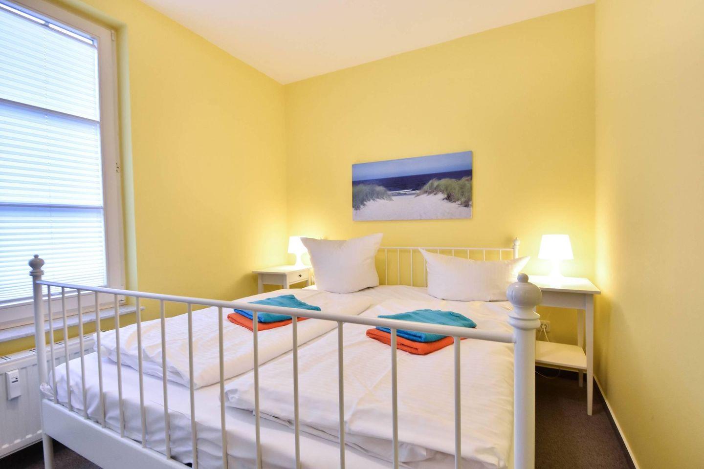 Das separate Schlafzimmer ist mit einem komfortablen französischen Doppelbett (160 cm x 200 cm) und einem geräumigen Schrank ausgestattet. Das innenliegende Badezimmer verfügt über eine Dusche und ein Waschbecken. Ein separates WC mit Waschbecken bietet zusätzlichen Komfort.