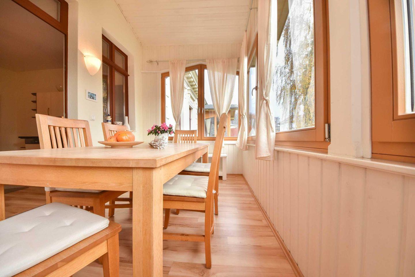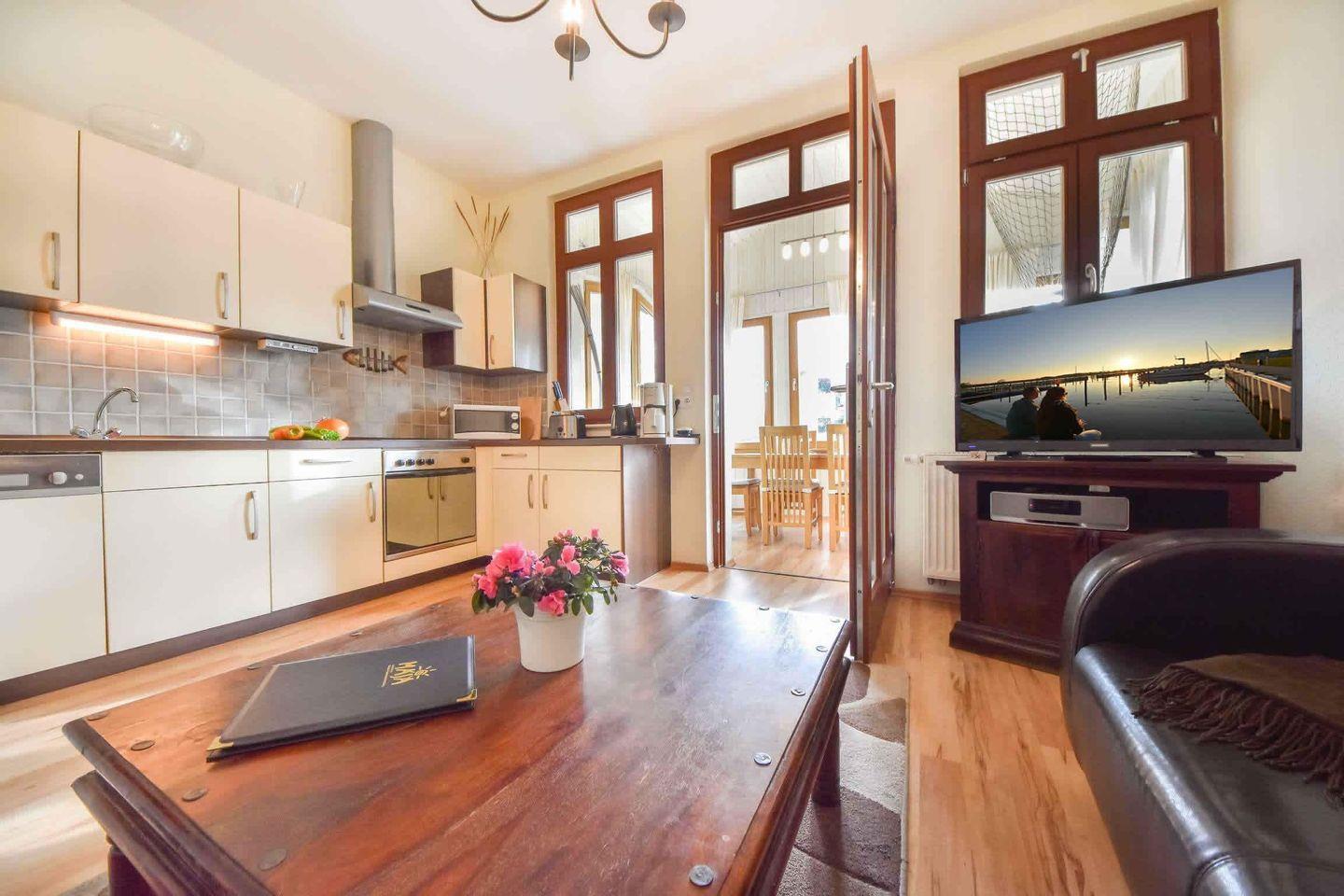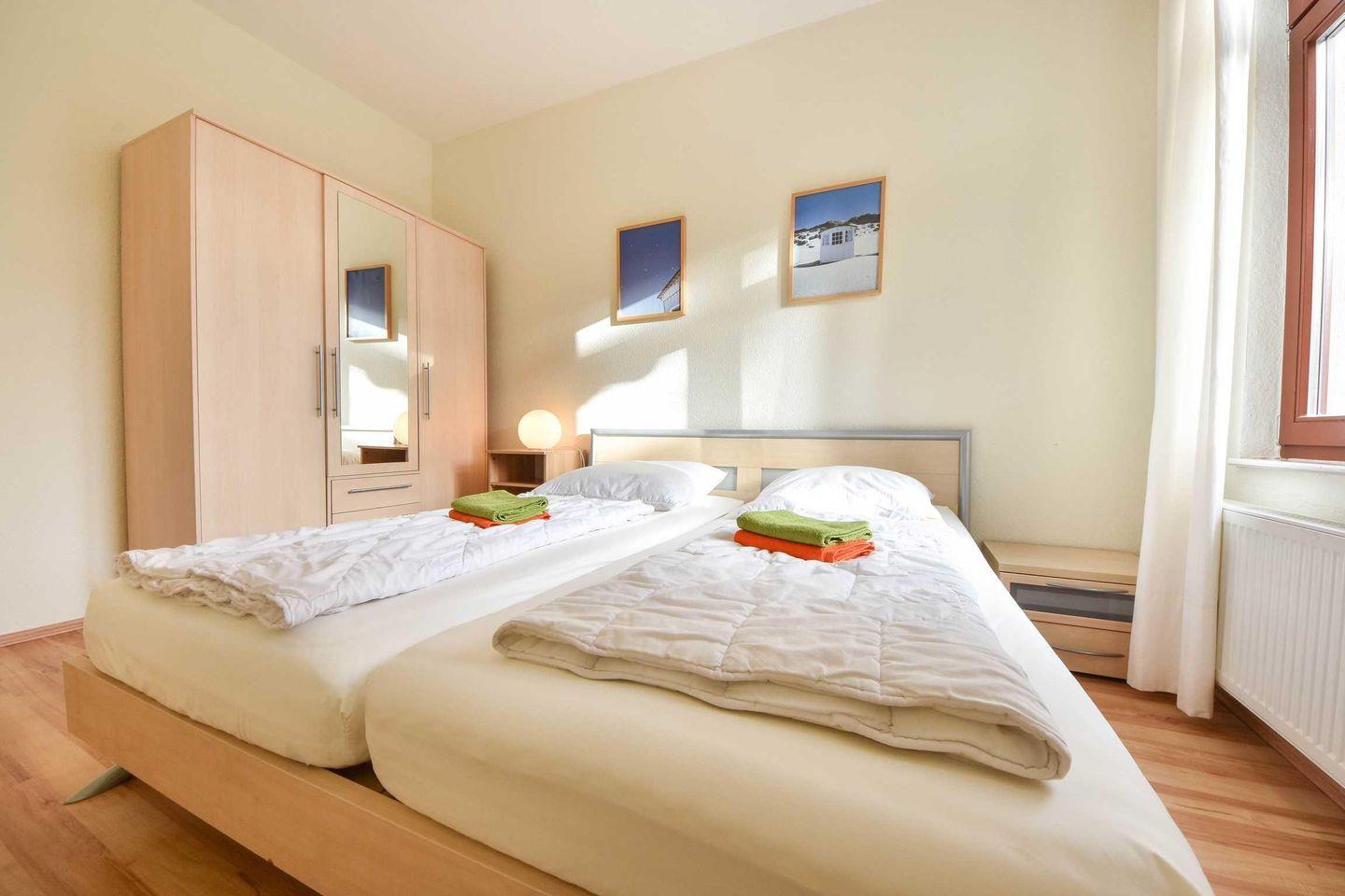 Diese komfortable Ferienwohnung mit einer Wohnfläche von großzügigen 73 Quadratmeter erwartet Sie im 1. Obergeschoss der Villa Lamora, die sich in einer verkehrsberuhigten Nebenstraße im Herzen von Heringsdorf befindet. Der Zugang zu der Unterkunft erfolgt über eine separate Außentreppe. Der Wohnbereich überzeugt mit einer gemütlichen Couchecke. In der kalten Jahreszeit sorgt der Kamin für eine angenehme Wohlfühlwärme. In der voll ausgestatteten Küche bereiten Sie Ihre Lieblingsspeisen während des Urlaubs zu. Der große Esstisch in der angrenzenden, nach Osten ausgerichteten Loggia, lädt bis zu sechs Personen zu den gemeinsamen Mahlzeiten ein. Das große Schlafzimmer ist mit einem bequemen Doppelbett und einem zusätzlichen Fernseher ausgestattet. Im kleinen Schlafzimmer befinden sich zwei getrennt stehende Einzelbetten. Zusätzlich besteht die Möglichkeit einer kostenfreien Unterbringung von Kindern in einem komfortablen Doppelbett mit extra TV im Dachboden - Zugang über eine steile Treppe. Hier beträgt die Stehhöhe jedoch nur 1,40 Meter. Das Badezimmer verfügt über eine Dusche, WC und Waschtisch. Ein zusätzliches Gäste-WC komplementiert den Wohlfühlfaktor.