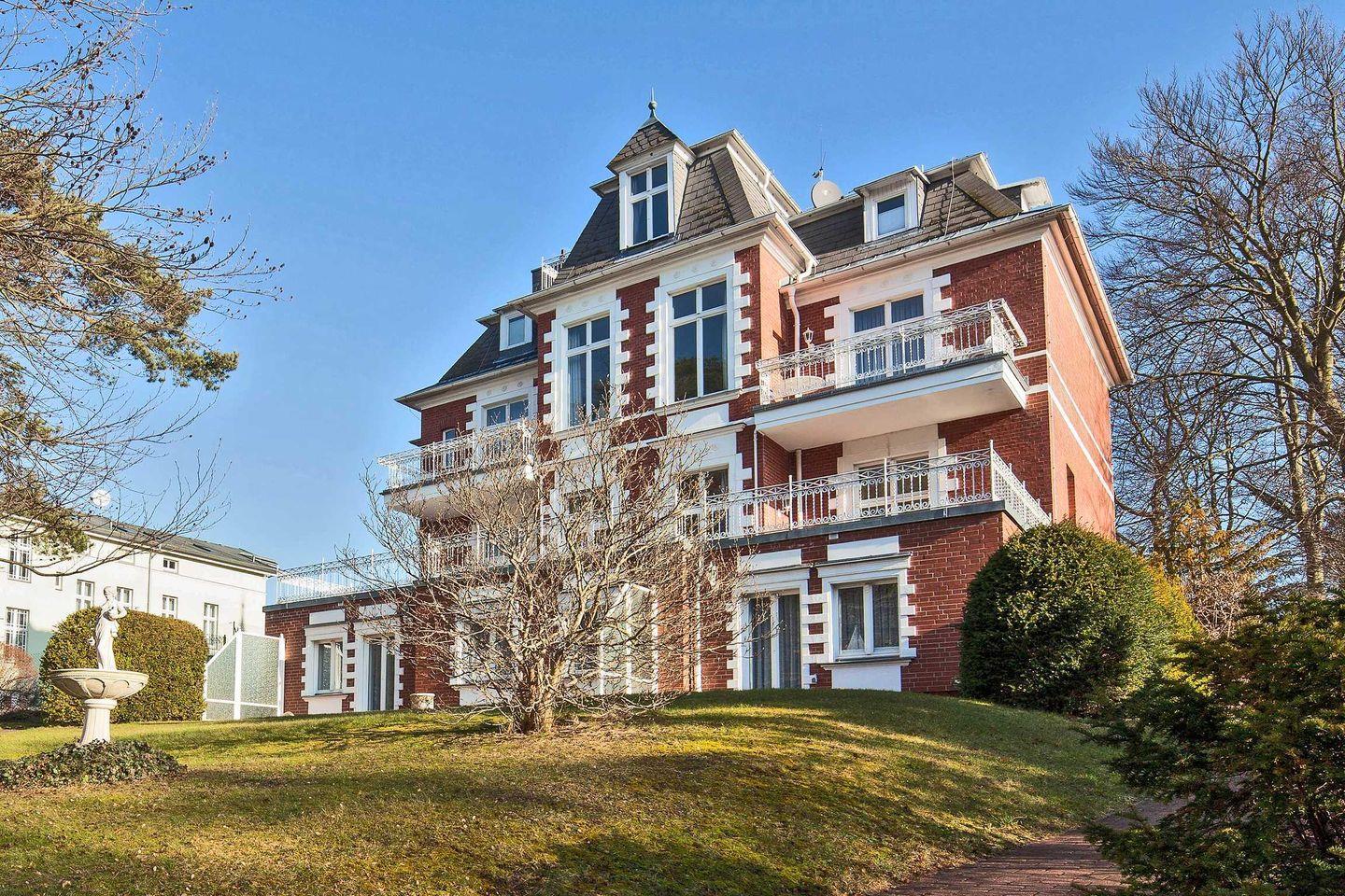 In zweiter Reihe zur Strandpromenade Heringsdorfs erwartet Sie die Villa Hohe Düne - eine wunderschöne Villa der Bäderarchitektur - umgeben von einem 3100 m² großen, grünen und mit vielen Bäumen besetzem Grundstück. Das Grundstück samt kleinem Spielplatz steht den Gästen zur Verfügung. Der Grill kann von allen Urlaubsgästen als Ort der Begegnung mitbenutzt werden.