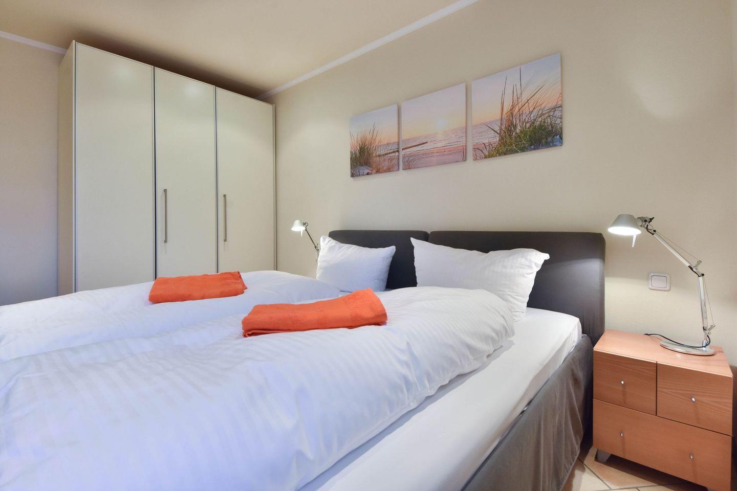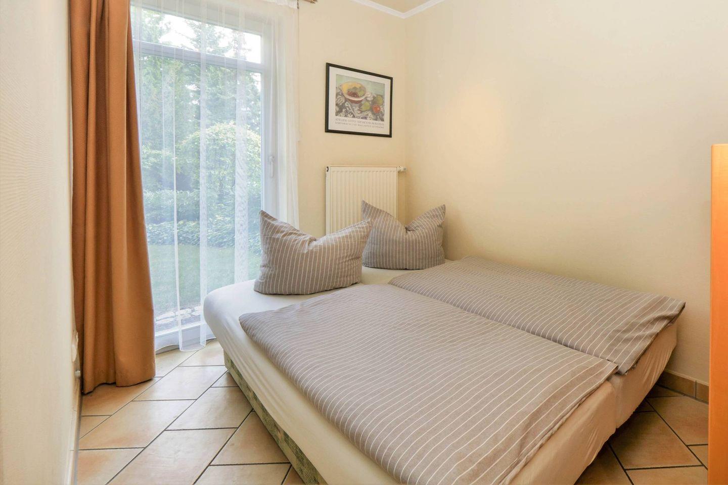 Die Wohnung liegt im Erdgeschoss des Hauses Rondell und bietet auf 61 Quadratmetern bis zu vier Personen Platz. Der Wohnraum ist offen gestaltet und verfügt über eine hochwertige Einbauküche mit Mikrowelle und Spülmaschine, einen Esstisch mit komfortablen Stühlen, sowie eine bequeme Sitzecke. Das große Schlafzimmer ist mit einem Doppelbett ausgestattet (2,00m x 1,80m), das kleinere der Schlafzimmer verfügt über eine Schlafcouch (2,00m x 1,60m), auf der eine dritte erwachsene Person - und idealerweise ein Kind - Platz finden. Besonderes Highlight der Wohnung ist die große Terrasse von der Sie einen herrlichen Blick in den Park der Anlage genießen. Das moderne Duschbad komplettiert das Angebot.