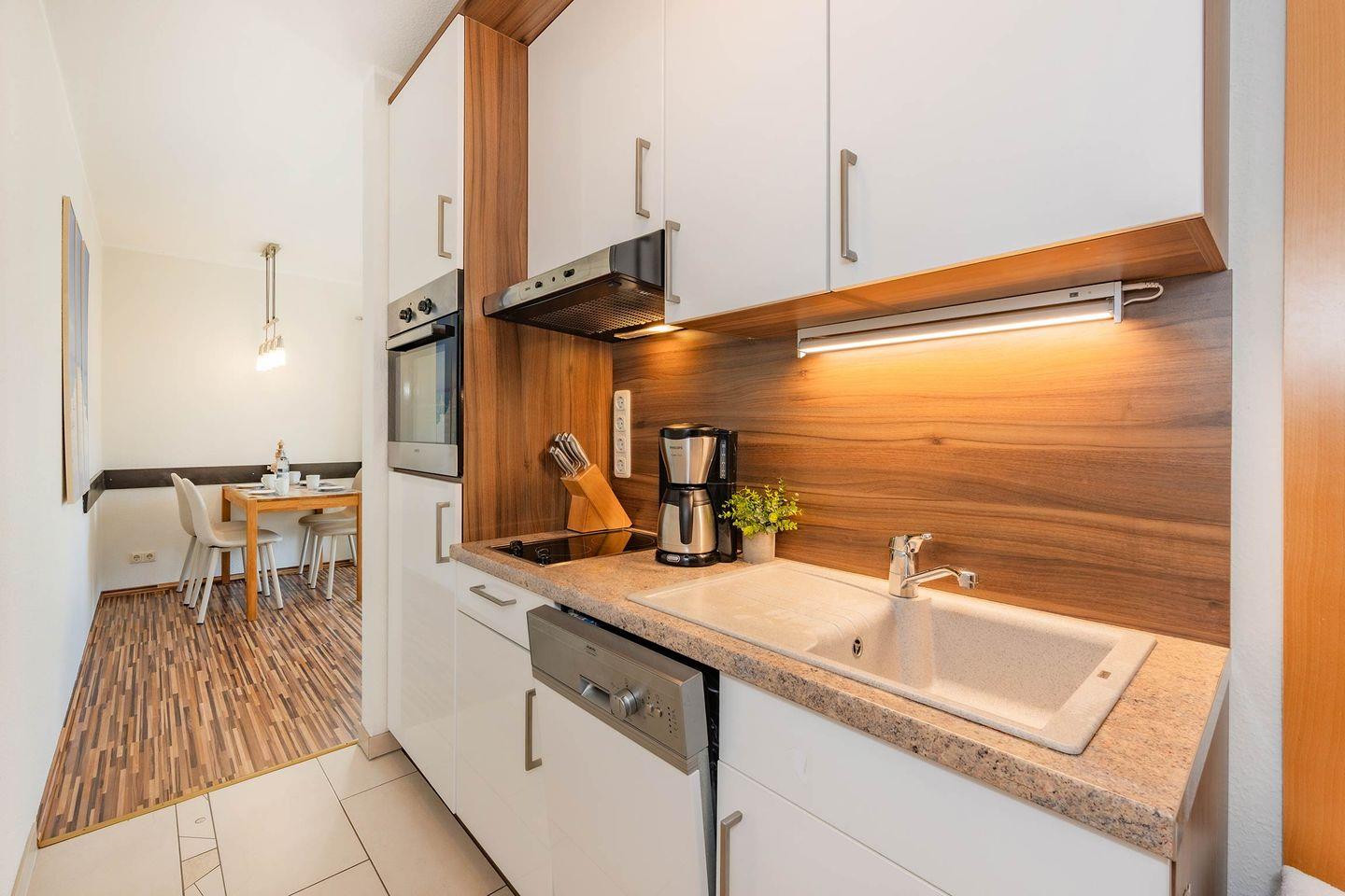 Weiterhin hervorzuheben ist die Küchenzeile, die auf wenig Platz alles bietet was man von einer voll ausgestatteten Küche erwarten kann. Backofen in Arbeitshöhe, Cerankochfeld (2-Platten), Geschirrspüler, Kaffeemaschine, Toaster, Wasserkocher sowie Kühlschrank mit Gefrierfach.