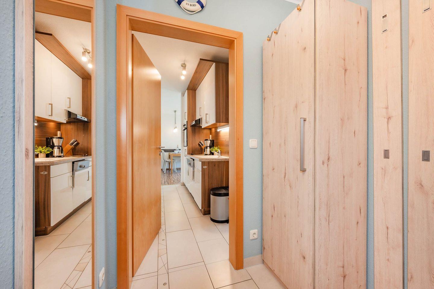 Vom Flur aus abgehend erreichen Sie das Schlafzimmer, ausgestattet mit Doppelbett (1,60m x 2,00m) und Kleiderschrank. Das Bad mit Dusche und extra breitem Waschbecken ist modern gestaltet und rundet den Komfort für den Urlaub zu zweit ab.