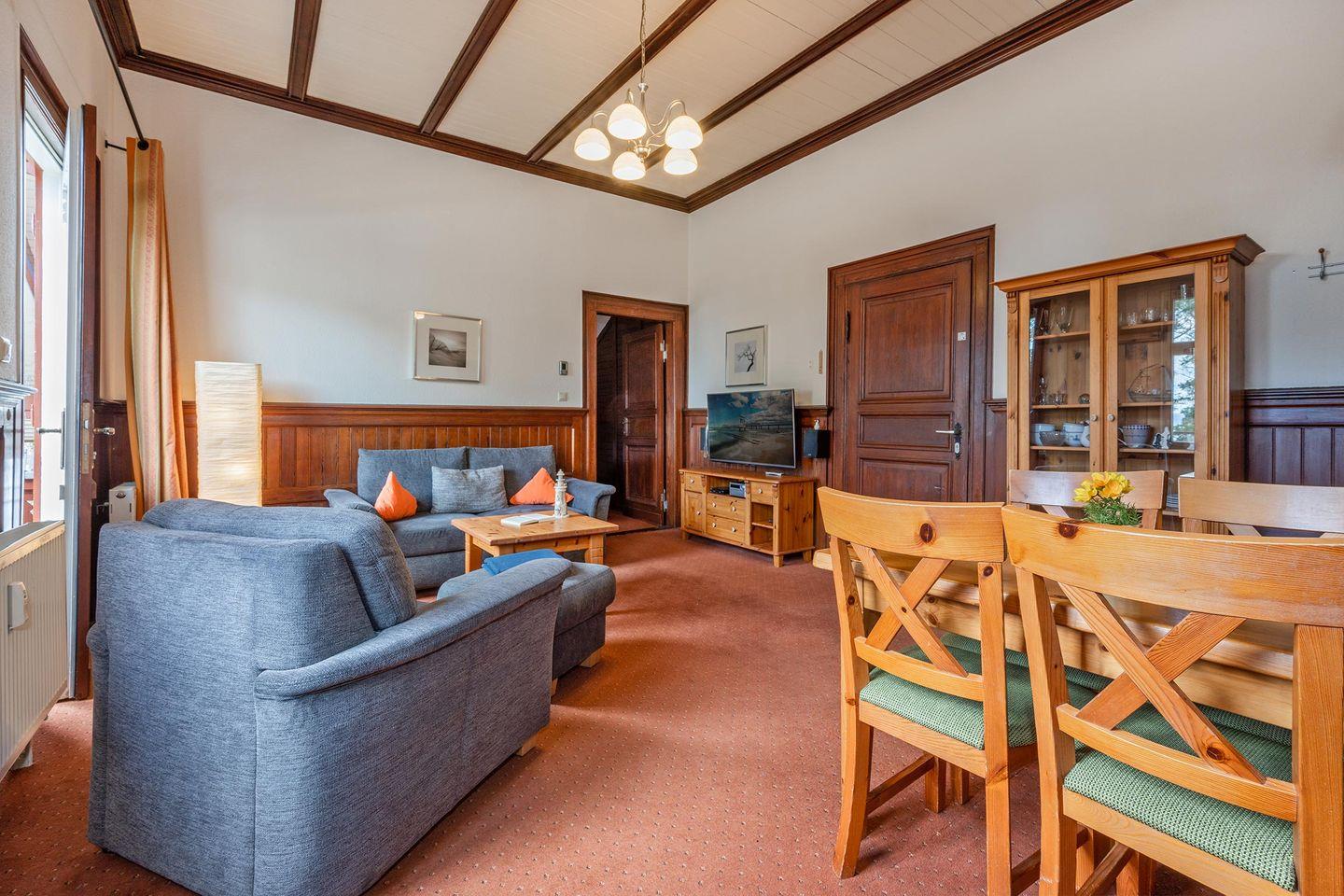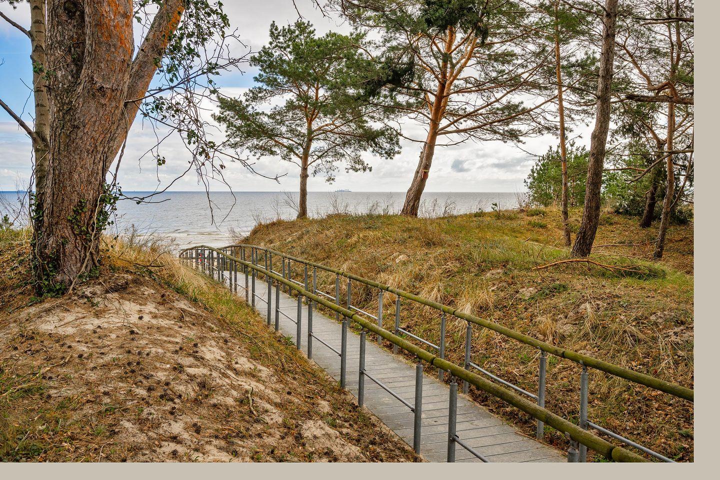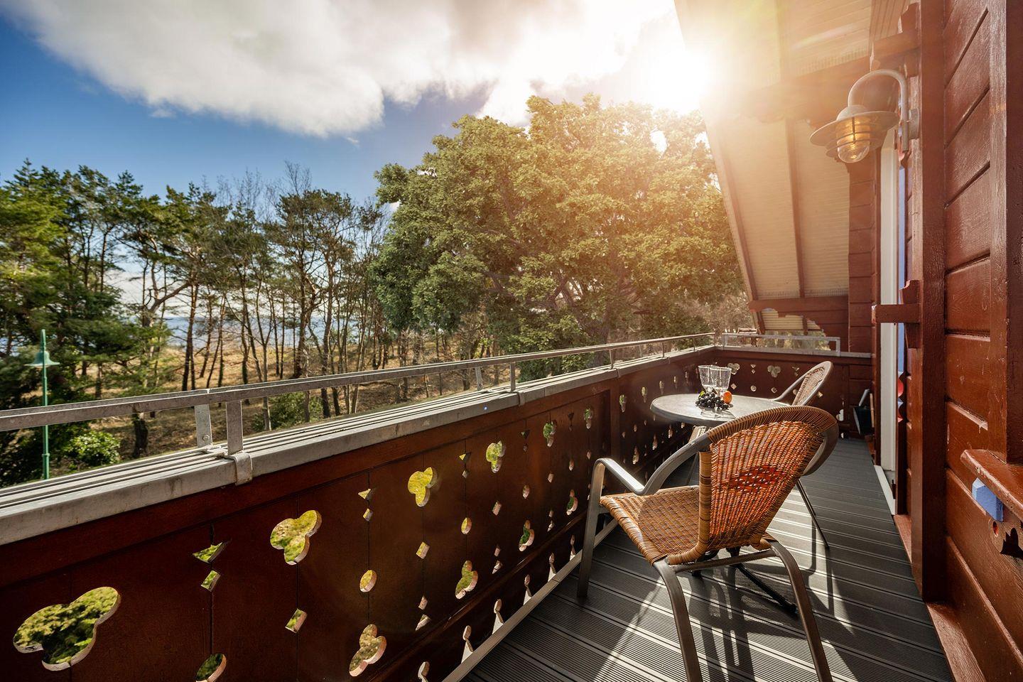 In der zweiten Etage des Hauses erwartet Sie eine Ferienwohnung mit einmaligem Charme und unvergleichlichem Weitblick. Genießen Sie beim morgendlichen Frühstück auf dem Balkon den Blick auf die Ostsee und stimmen Sie sich auf Urlaub ein. In dieser Ferienwohnung wird Ihnen das Ausspannen gelingen. Die 43 Quadratmeter verteilen sich auf einen großen, offenen Wohnraum mit Esstisch und bequemer Sitzgarnitur, eine kleine Küchenzeile mit Mikrowelle und Herd, ein Duschbad sowie ein Schlafzimmer mit Doppelbett. Die gesamte Wohnung ist mit Holzvertäfelung ausgestattet, die für eine gemütliche Atmosphäre sorgt. Das Schlafzimmer ist zusätzlich mit einem großen Kleiderschrank eingerichtet. Aus dem zur Promenade gerichteten Fenster können Sie aus dem Bett das Meer betrachten.