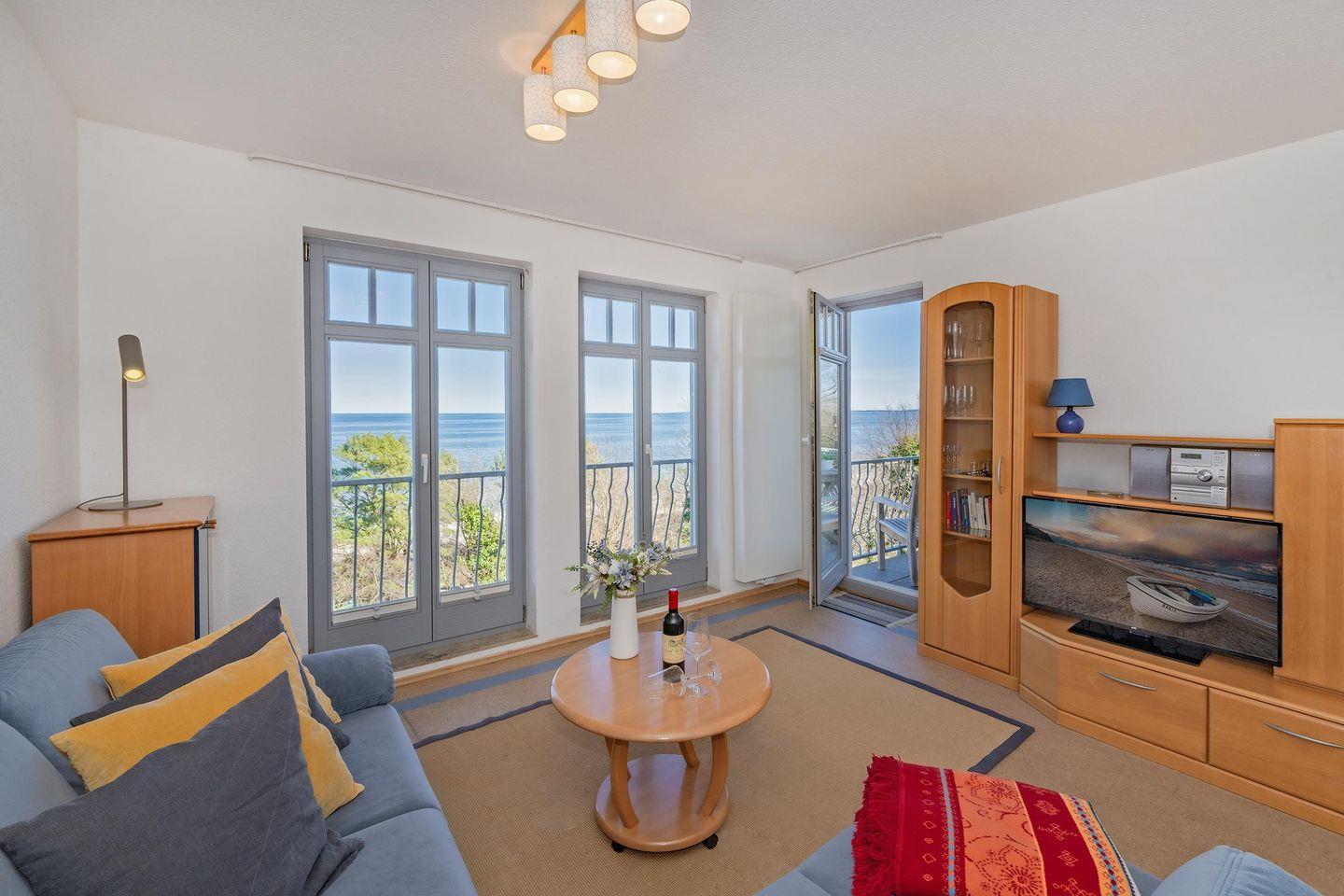 Der zur Ostsee ausgerichtete Balkon bietet Ihnen unvergleichliche Ausblicke. Hier können Sie hervorragend in den Tag starten, ein Buch lesen oder den Urlaubstag ausklingen lassen. Der große, offene Wohnraum verfügt über eine gemütliche Sitzecke und einen modernen Flachbild-TV. Außerdem ist die offene, voll ausgestattete Küchenzeile integriert. Ceranfeld, Backofen sowie Kühlschrank und Geschirrspüler sind ebenso vorhanden wie alle Dinge des täglichen Bedarfs. Somit können Sie das Frühstück oder auch das Abendessen komfortabel in den eigenen Wänden einnehmen und genießen die Vorzüge der Selbstversorgung. Ein großer Esstisch bietet allen Mitreisenden ausreichend Platz.