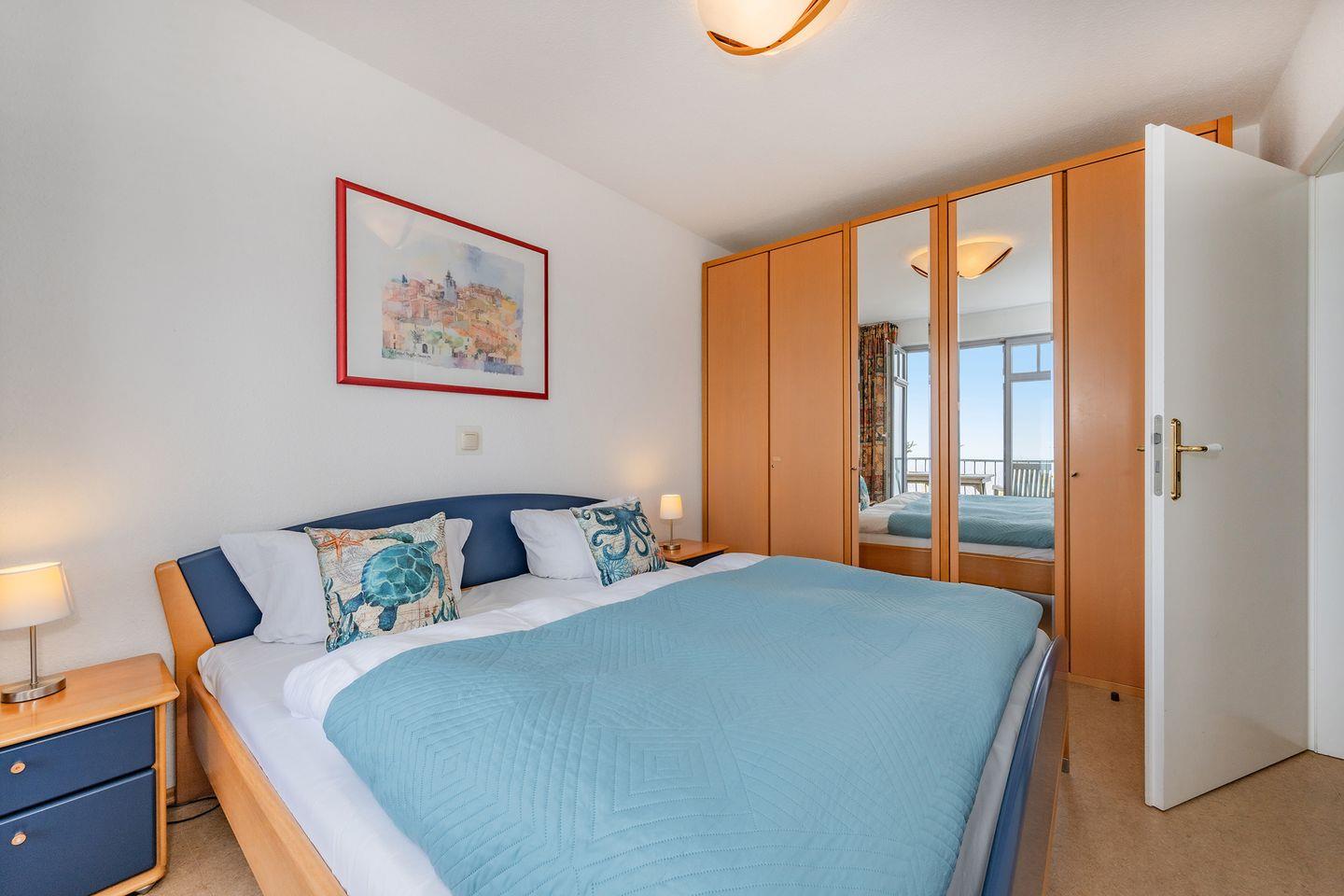 Das größere der beiden Schlafzimmer ist mit einem Doppelbett mit getrennten Matratzen eingerichtet und verfügt über einen großen Kleiderschrank und ausreichend Stauraum. Von hier aus haben Sie ebenfalls Zugang zum Balkon und - als Highlight - können Sie bereits nach dem Aufwachen aus dem Bett auf das Meer schauen. Das kleinere der beiden Schlafzimmer ist mit einem Einzelbett und einem hochwertigen Doppelstockbett ausgestattet. Das Fenster kann für Ihren Komfort abgedunkelt werden. Das innenliegende Bad ist modern eingerichtet und verfügt über Dusche, Waschbecken und einen WC. Besonders familienfreundlich sind der bereits in der Wohnung vorhandene Hochstuhl, sowie das Baby-Reisebett inklusive Matratze aber ohne Wäsche.