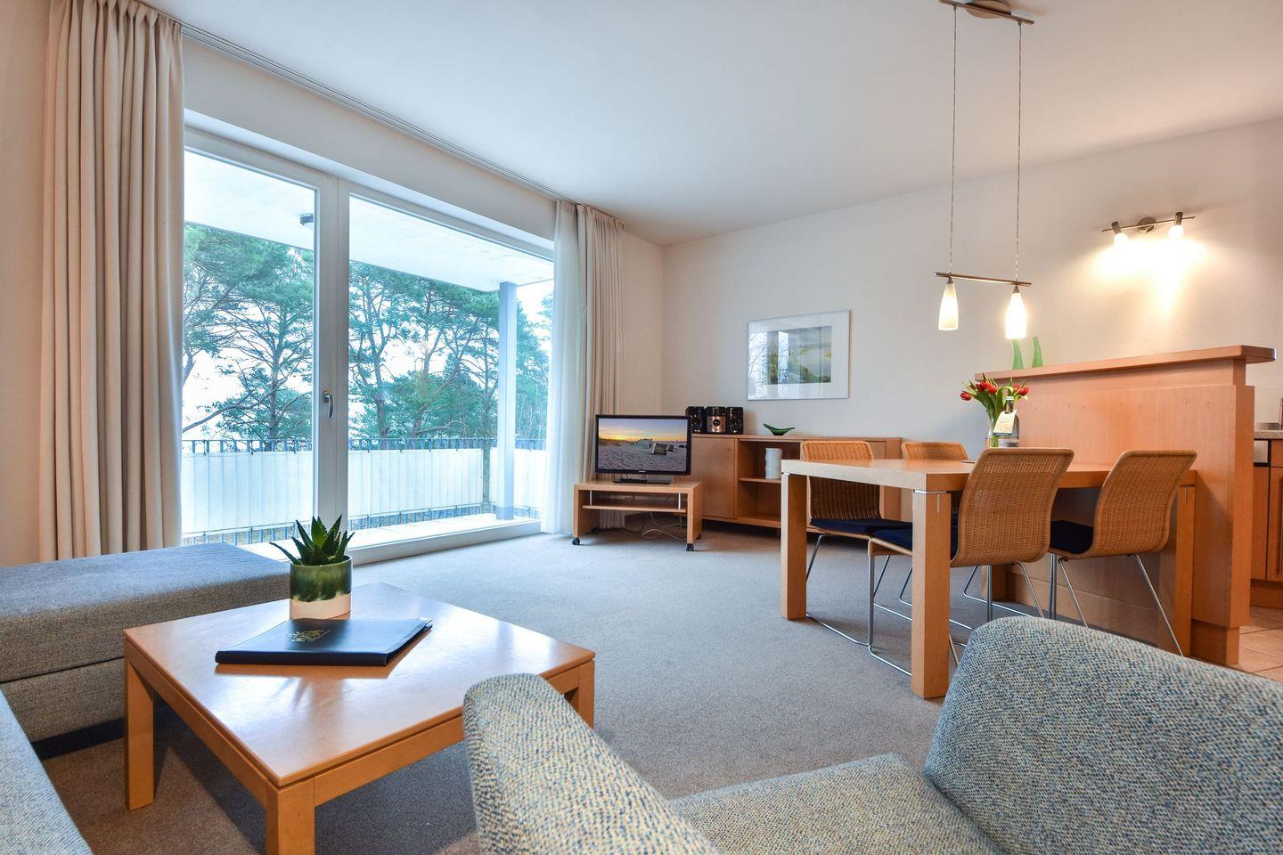 Ankommen, das Meer hautnah erleben, ausspannen. Diese 60 Quadratmeter große Ferienwohnung in der ersten Etage des Hauses bietet bis zu vier Personen die Möglichkeit, das Urlaubsgefühl direkt an der Promenade zu genießen. Das Schlafzimmer der Wohnung ist mit einem Doppelbett (1,80m x 2,00m), einem großzügigen Kleiderschrank und einer zusätzlichen Sitzgelegenheit ausgestattet. Im Wohnzimmer finden auf der modernen Schlafcouch die dritte und vierte Person Platz, zudem sind TV und HiFi-Anlage vorhanden. Über das Wohnzimmer erreichen Sie den großen Balkon, von dem Sie hervorragende Sicht auf das Meer haben. Die vollwertig ausgestattete Küche grenzt direkt an das Wohnzimmer und wird räumlich durch einen hohen Tresen getrennt. Über den Flur der Wohnung erreichen Sie das Tageslichtbad mit WC, Waschbecken, Dusche und Handtuchheizung.