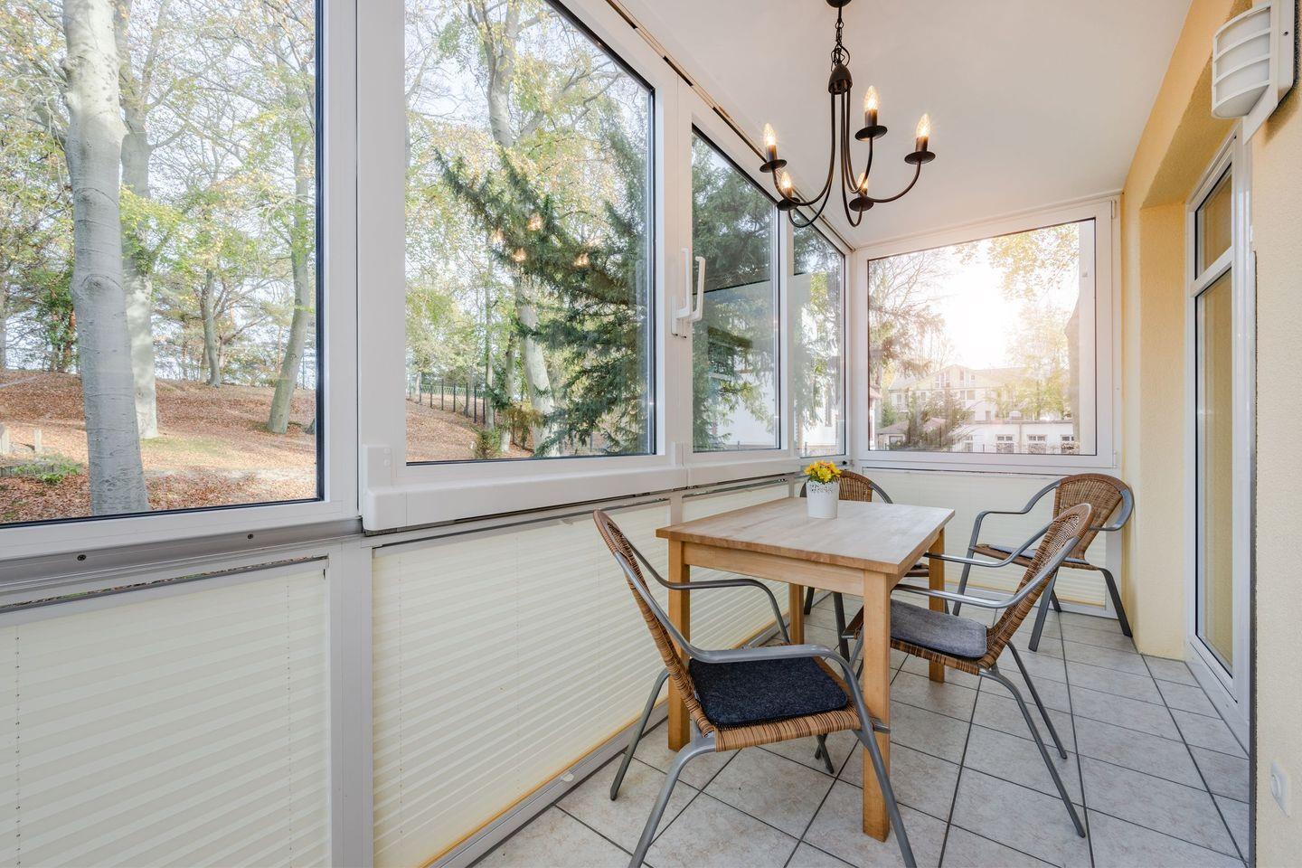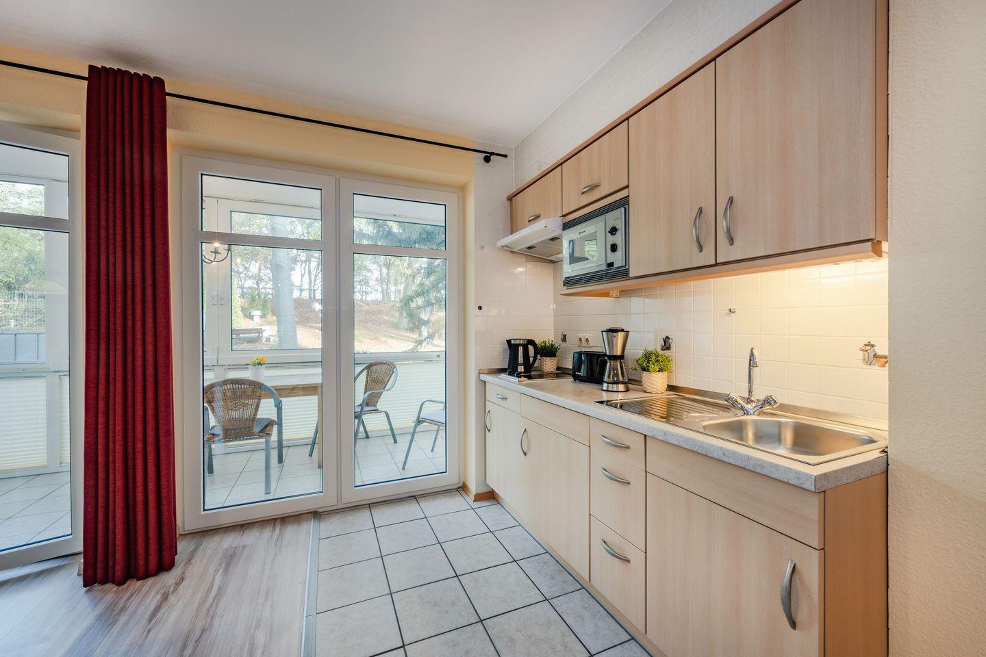 Die Zwei-Raum-Wohnung Nummer 3.3 befindet sich in Hochparterre des Hauses und erstreckt sich auf 60 Quadratmeter. Bis zu vier Personen finden hier das perfekte Domizil für einen erlebnisreichen Strandurlaub. Der Wohnraum überzeugt im ländlichen Einrichtungsstil mit gemütlicher Schlafcouch, einem großen Flat-TV und einer Kommode. Am freistehenden Esstisch findet jede Person ausreichend Platz. Die Küchenzeile ist offen zum Wohnraum und lässt Sie durch eine gute Grundausstattung - mit 2-Platten-Herd, Toaster, Wasserkocher und Kaffeemaschine - jederzeit einen schnellen Snack zubereiten. Dank der großen Fensterfront und der sonnigen Farbgestaltung, wirkt der Raum stets hell und warm. Die anliegende Loggia ist perfekt für Aufenthalte bei jeder Wetterlage und bietet einen idyllischen Ausblick auf die umliegende Parkanlage. Auch das Schlafzimmer ist liebevoll eingerichtet und bietet mit einem Doppelbett und einem großen Kleiderschrank hohen Komfort. Das Badezimmer ist mit WC, Waschbecken, einer Handtuchheizung und einer Dusche ausgestattet.