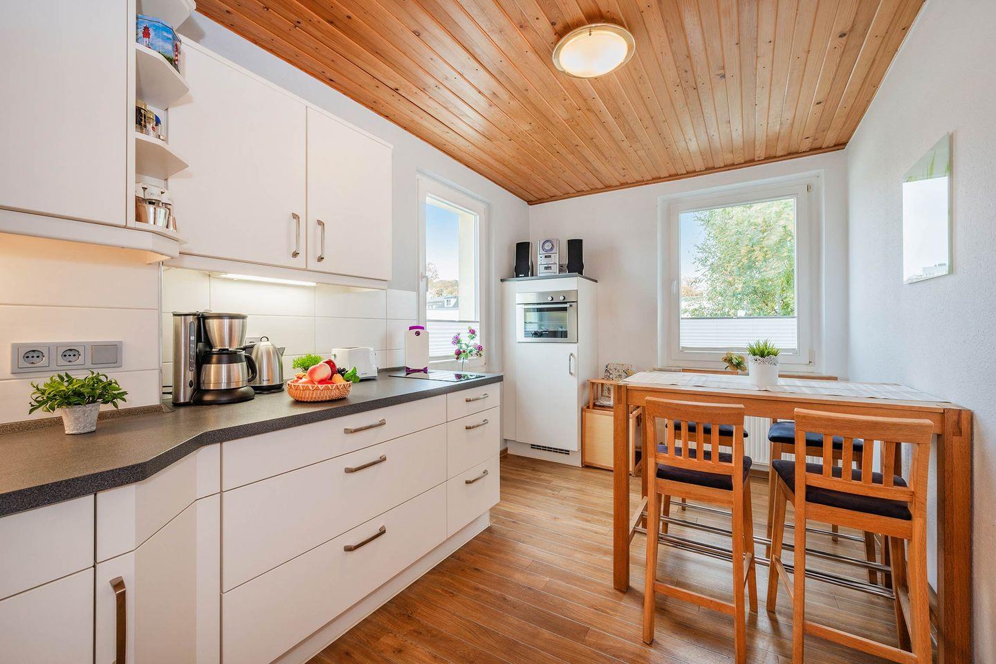 Die Wohnung Nummer 1 erstreckt sich auf 65 Quadratmetern und ist in der ersten Etage gelegen. Bis zu drei Personen können hier unterkommen. Die Wohnung wurde liebevoll mit vielen kleinen Details hergerichtet. Im Wohnraum werden Sie eine Sofalandschaft mit Couchtisch, Kommode und Fernseher vorfinden. Zudem befindet sich hier ein Einzelbett, hier findet die dritte Person ihren Platz. Die Küche bildet einen separaten Raum, in welchen Sie eine vollwertig ausgestattete Küchenzeile und einen Esstisch mit Bestuhlung vorfinden werden.