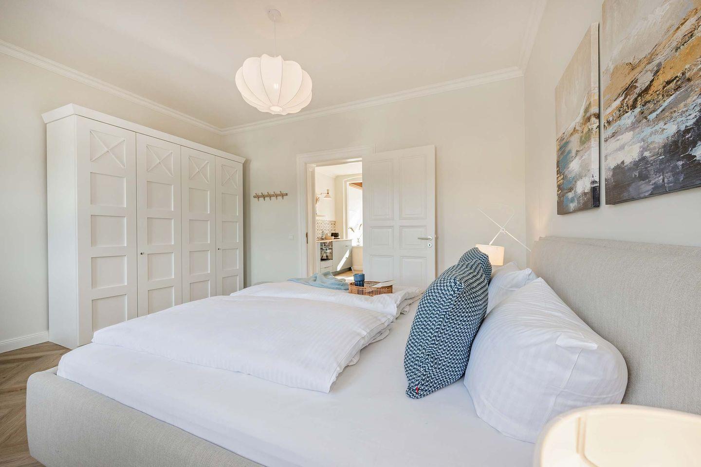 Im Schlafzimmer befinden sich ein großes Doppelbett, ein geräumiger Kleiderschrank und ein kleiner Lesesessel. Die Fenster können für Ihren Komfort verdunkelt werden. Die vielen, mit Bedacht gewählten Details der Wohnung werden Sie sicher verzaubern. Bei der Einrichtung der Wohnung wurde das Augenmerk besonders auf die Wünsche der Gäste gelegt, sodass Sie eine liebevoll vorbereitete Wohnung, in modernem Design und mit allen Annehmlichkeiten ausgestattet, vorfinden werden.