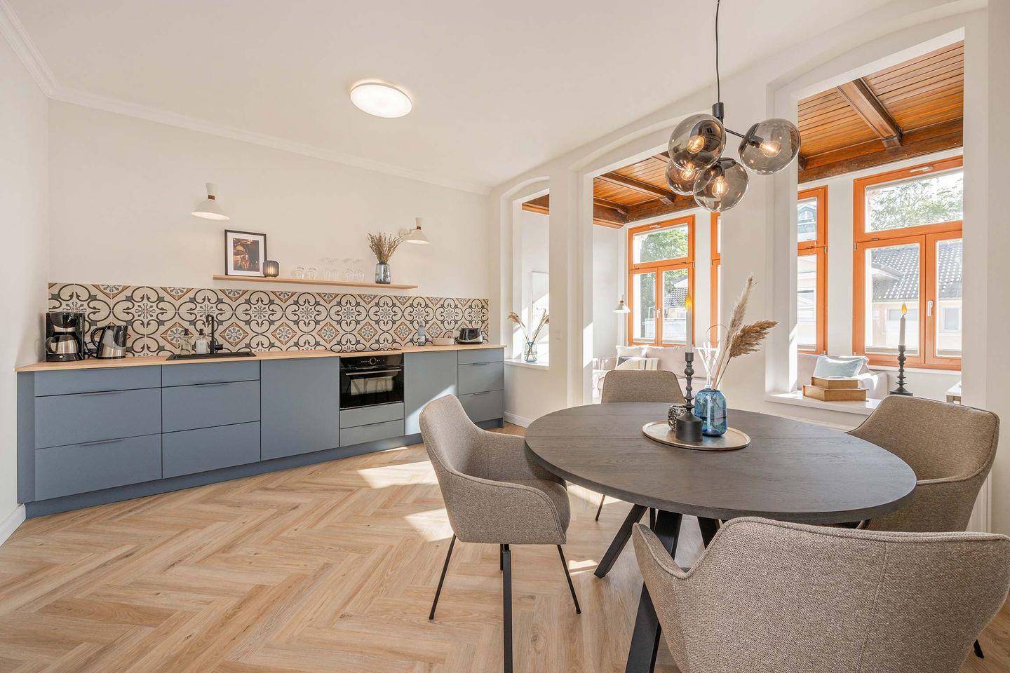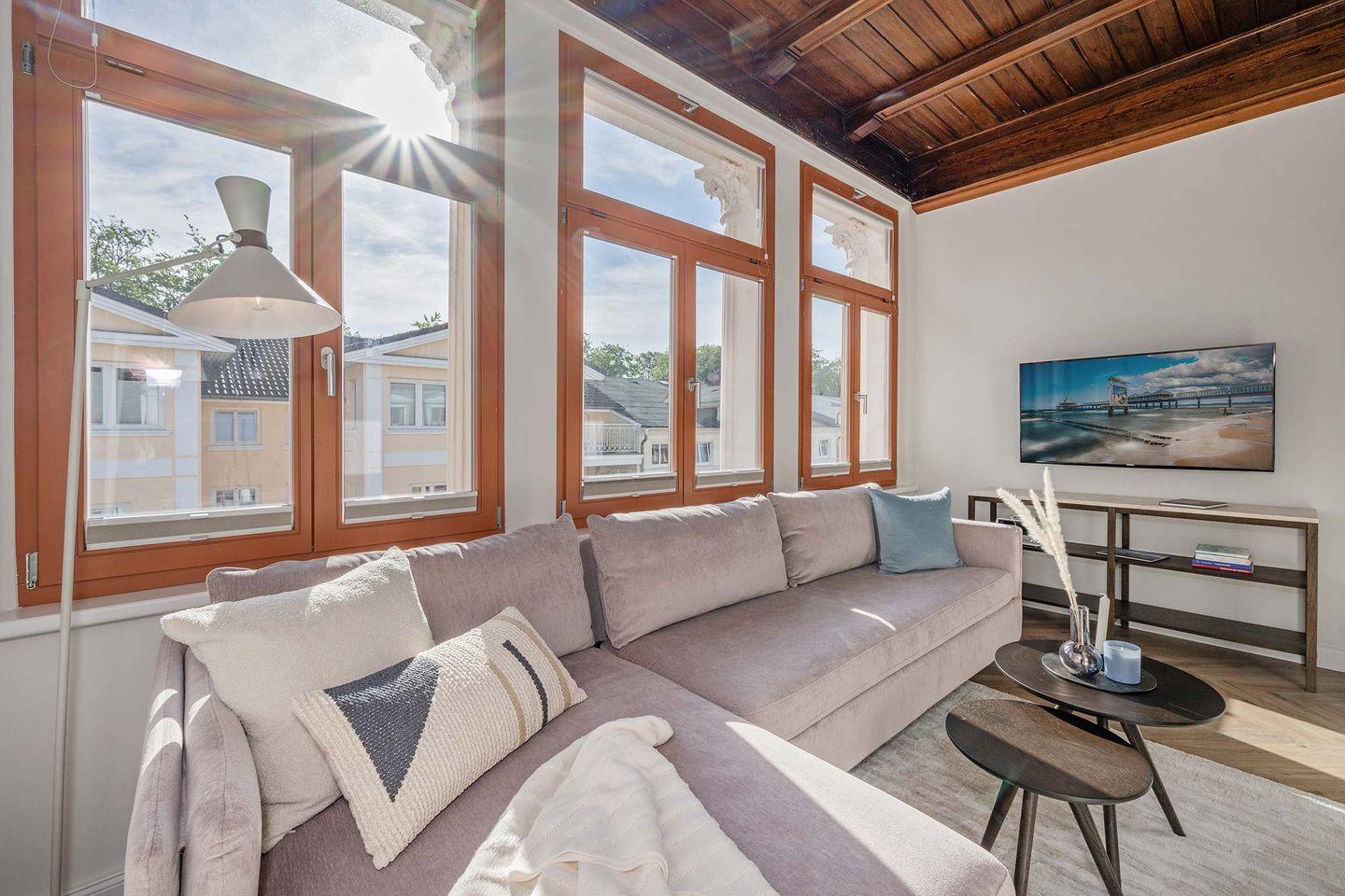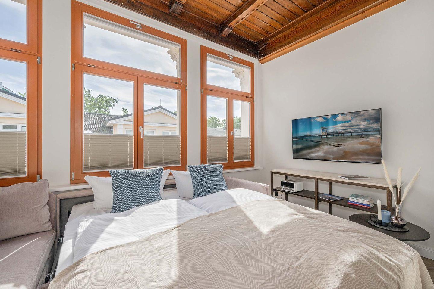 Das Appartement befindet sich im Dachgeschoss des Hauses und verfügt über 63 Quadratmeter Wohnfläche, aufgeteilt auf zwei Räume. Durch den Flur gelangen Sie in den offenen Wohn- und Küchenbereich. Hier erwartet Sie eine erstklassige Küche mit Induktionsherd, Kühlschrank, Backofen (inkl. Mikrowellenfunktion) sowie ein Geschirrspüler. Ein runder Esstisch mit gepolsterter Bestuhlung lädt zu gemeinsamen Mahlzeiten ein. In der Loggia wurde durch ein stimmiges Arrangement aus Sofa, Beistelltisch, TV-Board und Flat-TV eine wohnliche Atmosphäre geschaffen. Hier werden Sie sich sofort wie Zuhause fühlen. Das hochwertige Sofa bietet dank seiner Schlaffunktion einer dritten und vierten Person eine bequeme Übernachtungsmöglichkeit, sodass neben Paaren auch Familien oder Freunde geeignete Schlafplätze vorfinden.