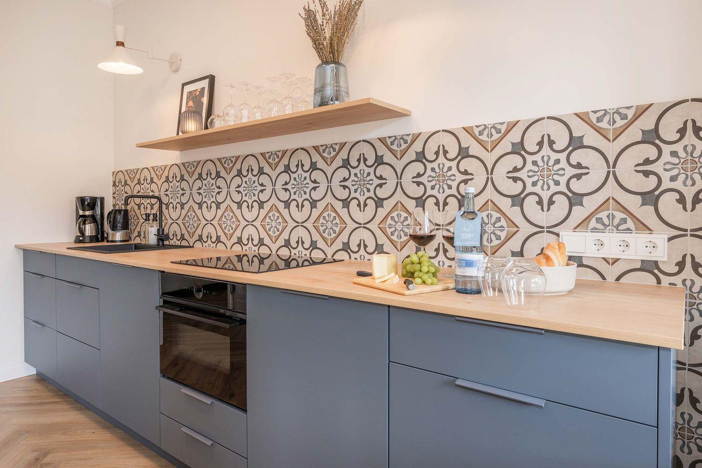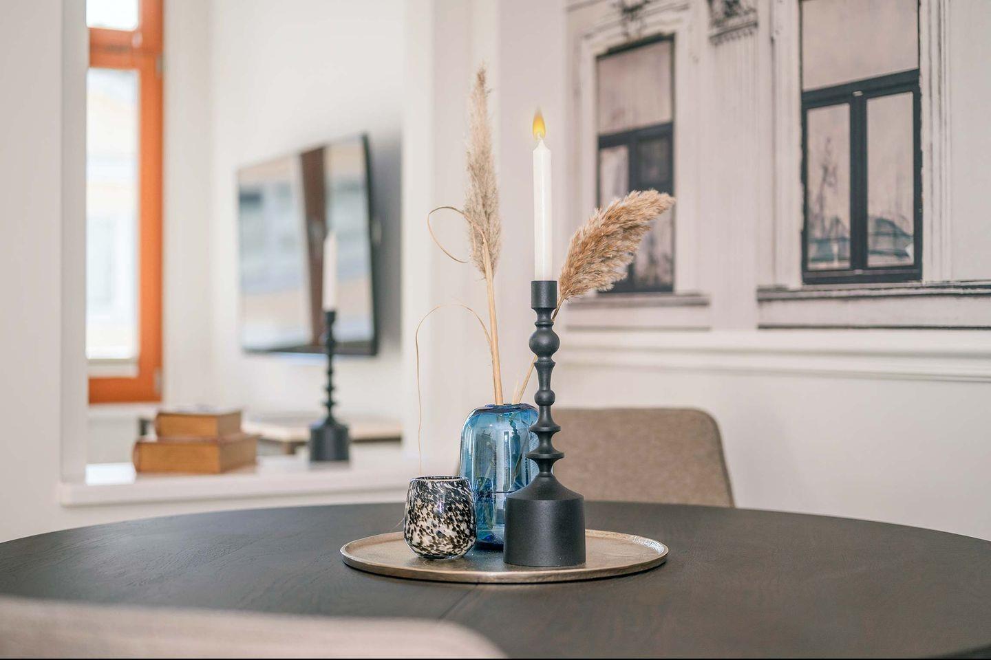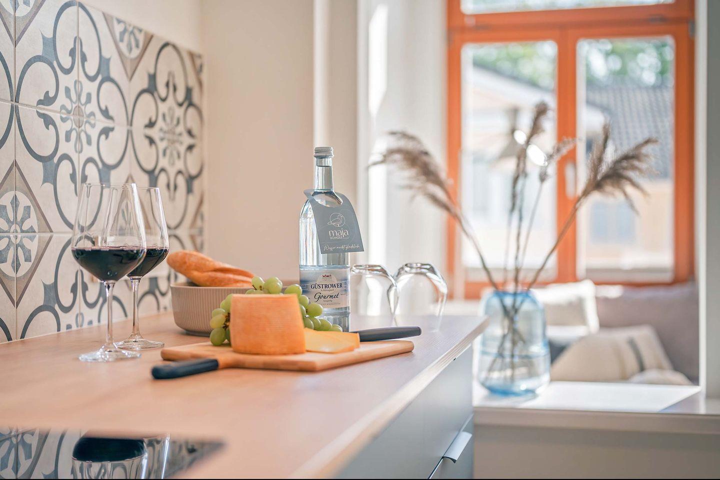 Das Appartement befindet sich im Dachgeschoss des Hauses und verfügt über 63 Quadratmeter Wohnfläche, aufgeteilt auf zwei Räume. Durch den Flur gelangen Sie in den offenen Wohn- und Küchenbereich. Hier erwartet Sie eine erstklassige Küche mit Induktionsherd, Kühlschrank, Backofen (inkl. Mikrowellenfunktion) sowie ein Geschirrspüler. Ein runder Esstisch mit gepolsterter Bestuhlung lädt zu gemeinsamen Mahlzeiten ein. In der Loggia wurde durch ein stimmiges Arrangement aus Sofa, Beistelltisch, TV-Board und Flat-TV eine wohnliche Atmosphäre geschaffen. Hier werden Sie sich sofort wie Zuhause fühlen. Das hochwertige Sofa bietet dank seiner Schlaffunktion einer dritten und vierten Person eine bequeme Übernachtungsmöglichkeit, sodass neben Paaren auch Familien oder Freunde geeignete Schlafplätze vorfinden.