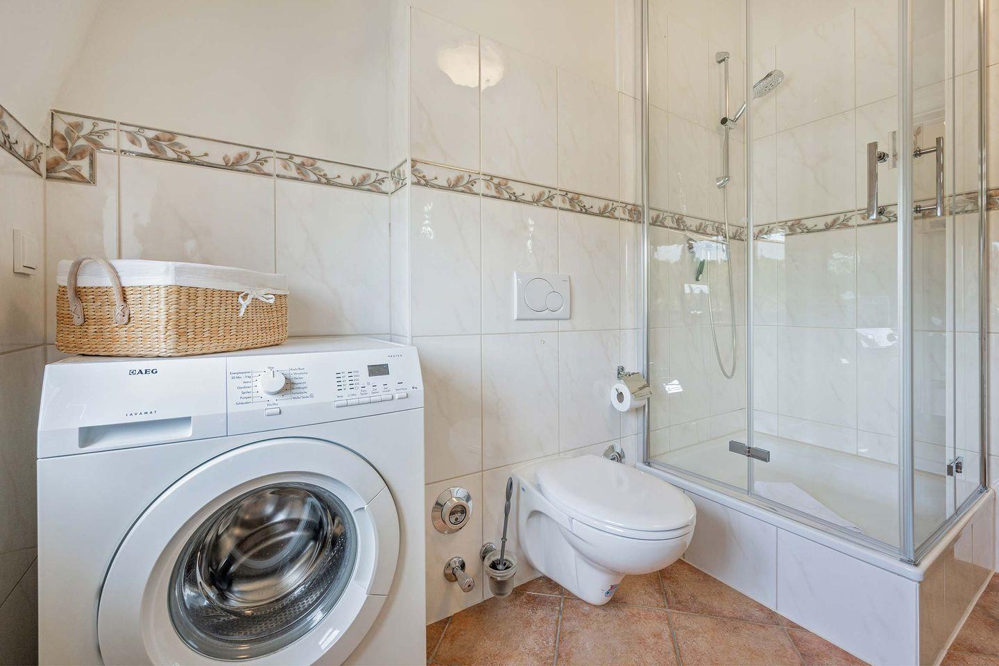 Das großzügig gestaltete Tageslicht-Badezimmer verfügt neben zwei Waschplätzen auch über eine Dusche, eine Badewanne, WC, Handtuchheizung und eine eigene Waschmaschine.
