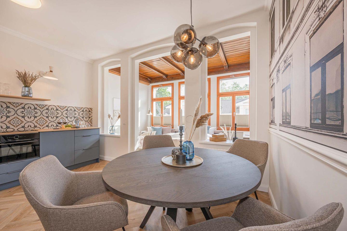 Im historischen Altbau „Kaisers vis a vis“ haben Sie die Möglichkeit das Zentrum des Seebades Heringsdorf hautnah zu erleben. Mit diversen Geschäften direkt im Gebäude und einem Bäcker und Restaurants in unmittelbarer Nähe, erreichen Sie alles in nur wenigen Schritten. Im Erdgeschoss des Hauses befindet sich eine Bar mit saisonalen Außenplätzen. Nach einem kurzen Spaziergang durch den kleinen idyllischen Park gelangen Sie im Handumdrehen auch zur Promenade und der Ostsee. Die Anfang 2024 aufwendig modernisierte Wohnung Nummer 7 bietet Ihnen einen wunderschönen Wohlfühlort nach einem ereignisreichen Urlaubstag.