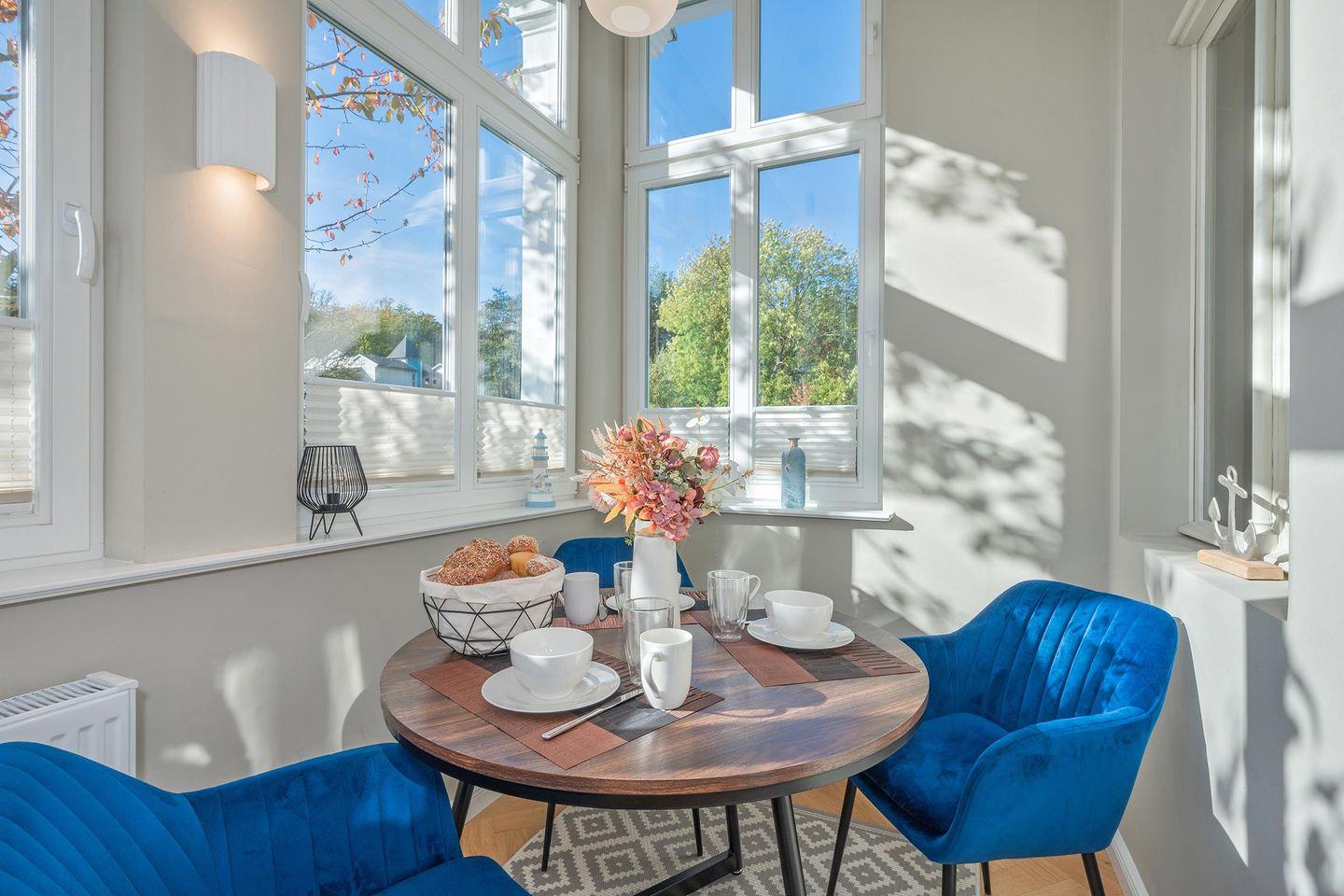 Mit Liebe zum Detail wurde die Wohnung 01 in der Villa Luise in maritimem Flair und mit einem Auge für stilvolle Eleganz neu hergerichtet. Sie befindet sich im Erdgeschoss des Hauses, ist über einen separaten Eingang zu erreichen und verschafft zwei Personen auf 42 Quadratmetern einen wundervollen Rückzugsort. Auch Ihr Haustier ist ein gern gesehener Gast.